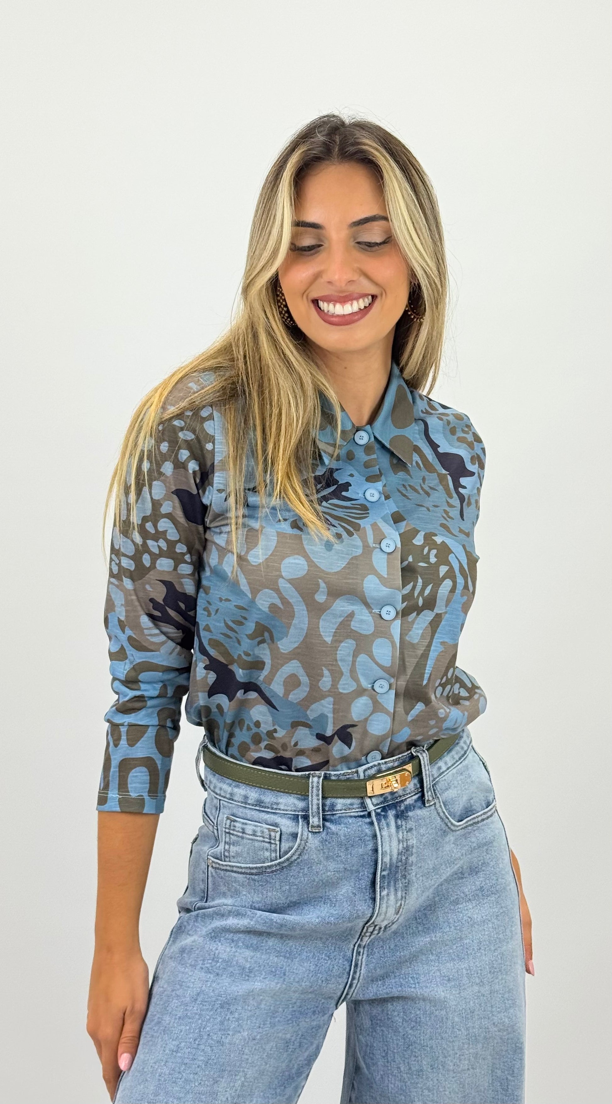 Blusa/camisa em tecido estilo malha elástica. Aperta com botões na parte da frente. Estampado animal tons verde-seco e azul-céu. Manga comprida. Estampado exclusivo da marca Espanhola Mercedes de miguel.