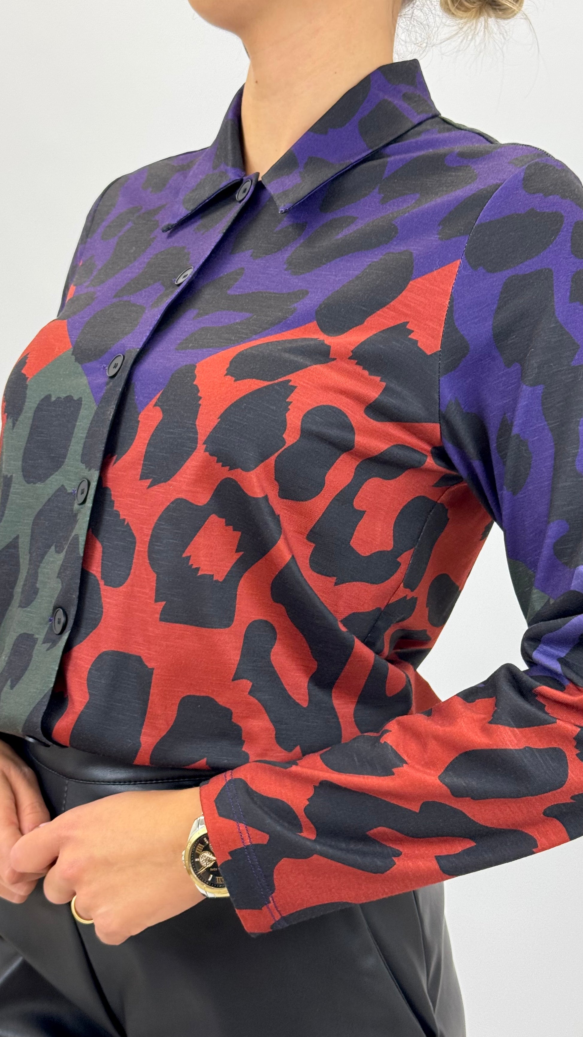 Blusa/camisa em tecido estilo malha elástica. Aperta com botões na parte da frente. Estampado animal preto, roxo, vermelho e verde-garrafa. Manga comprida. Estampado exclusivo da marca Espanhola Mercedes de miguel.