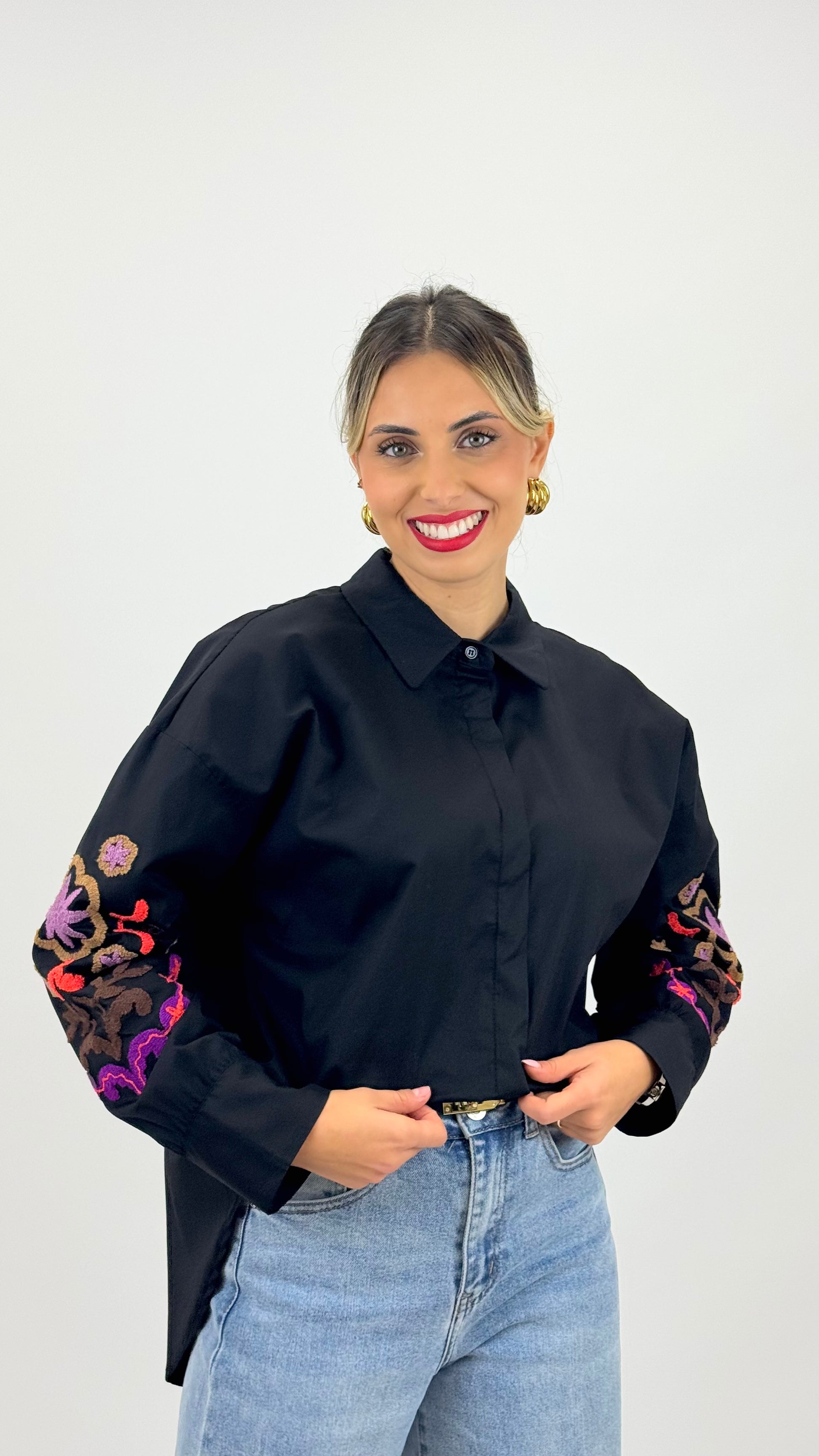 Camiseiro em algodão preto com detalhes de bordado em relevo nas mangas. Bordados em tons roxo, laranja e camel.