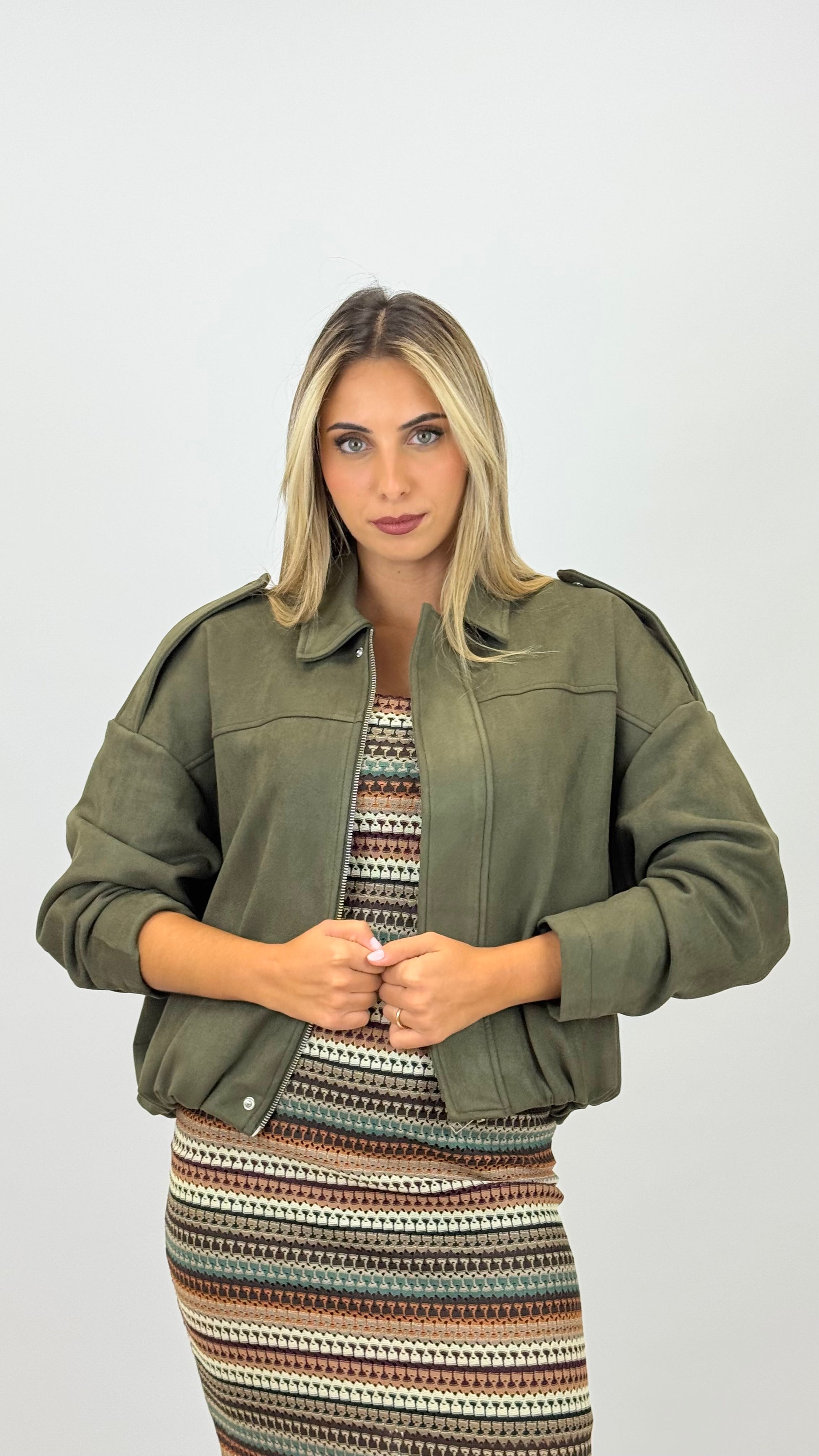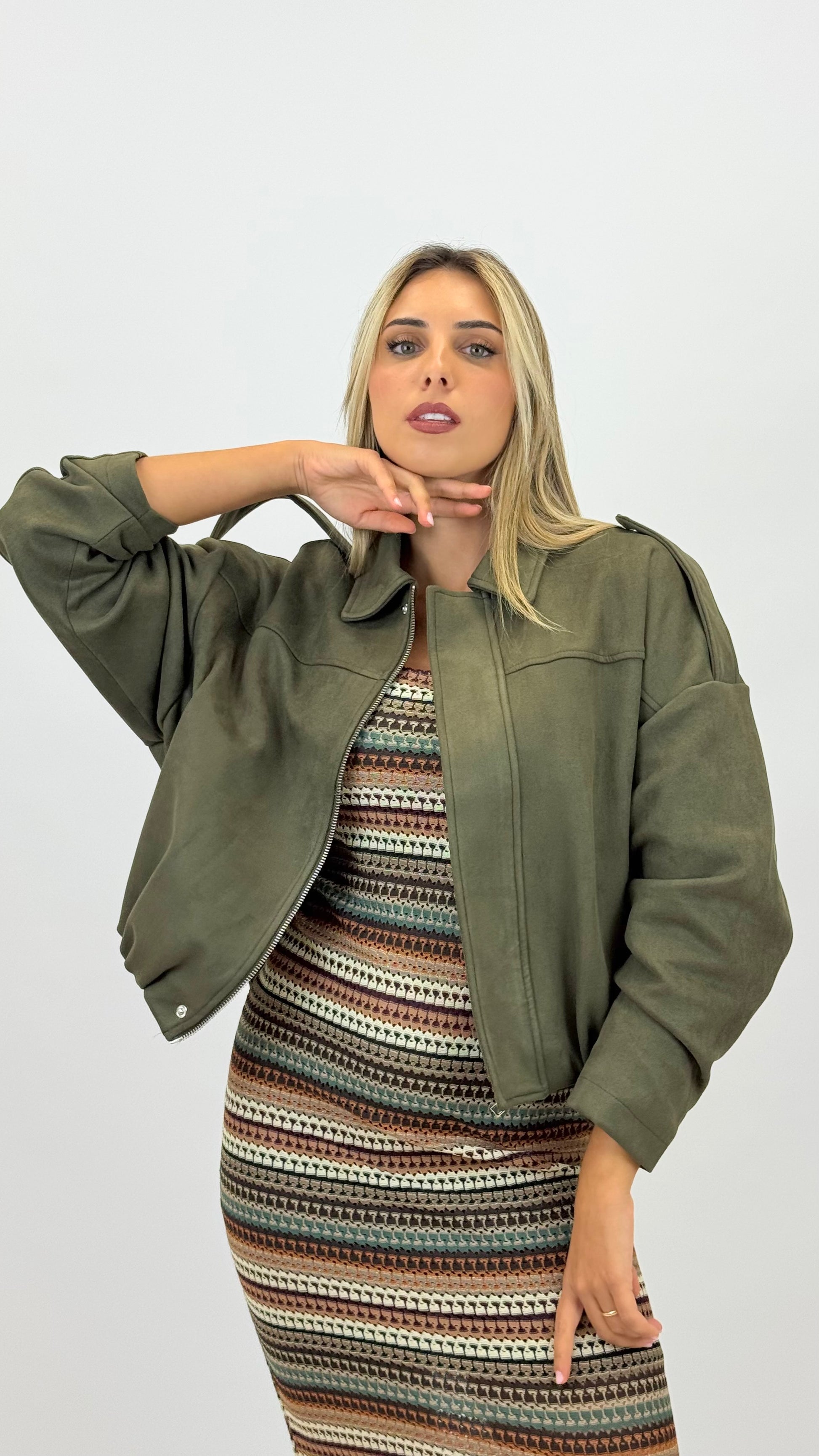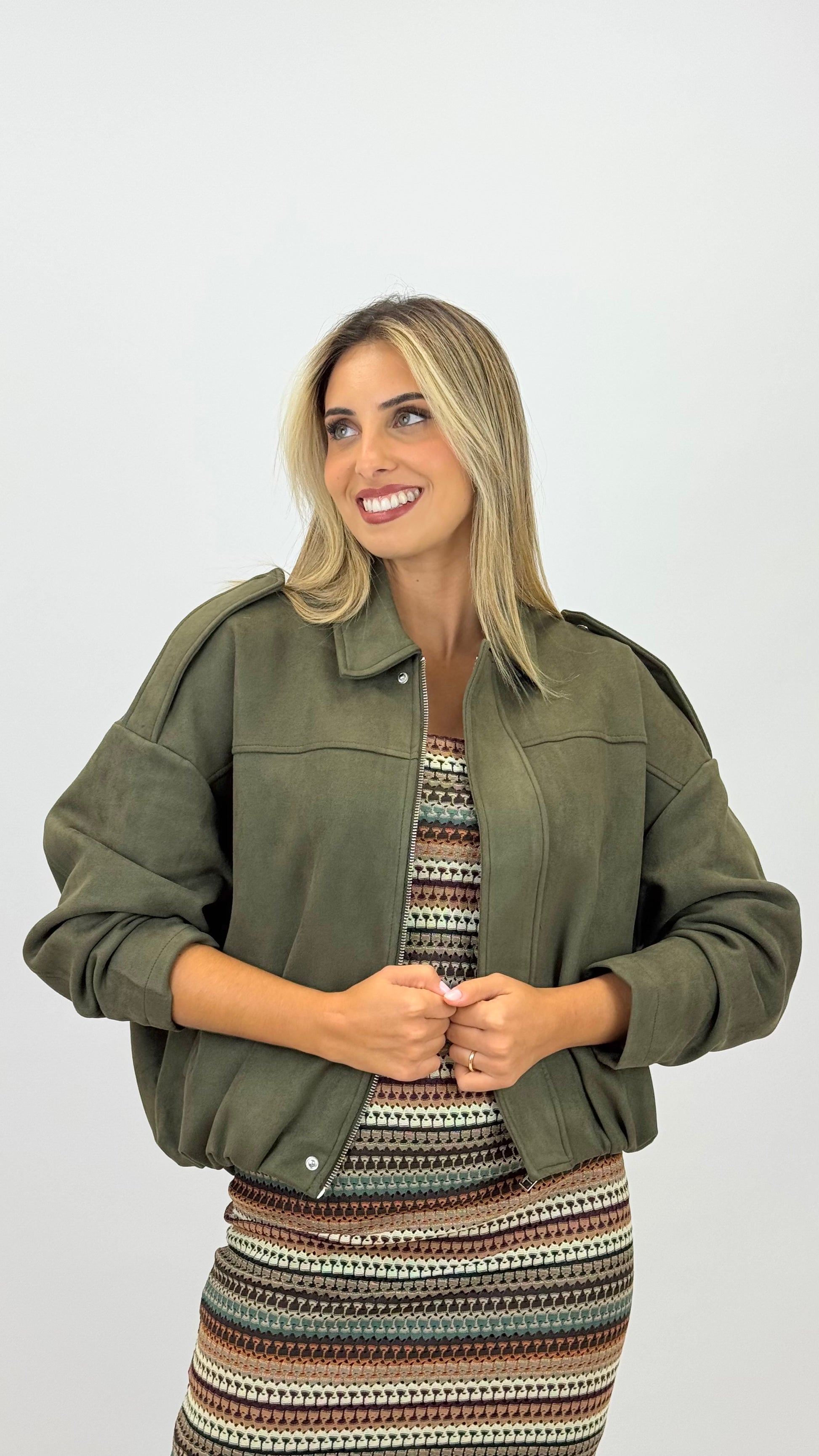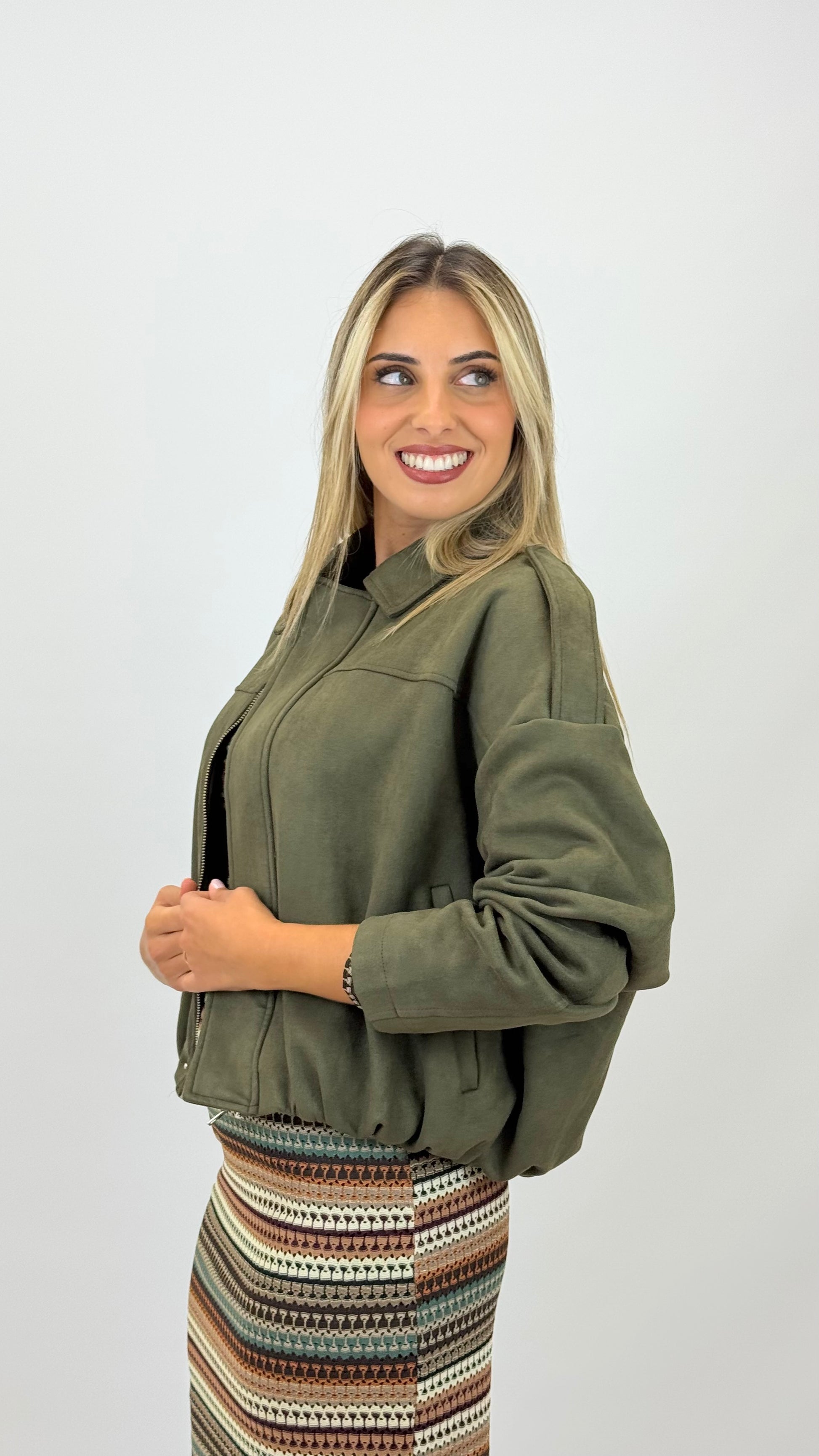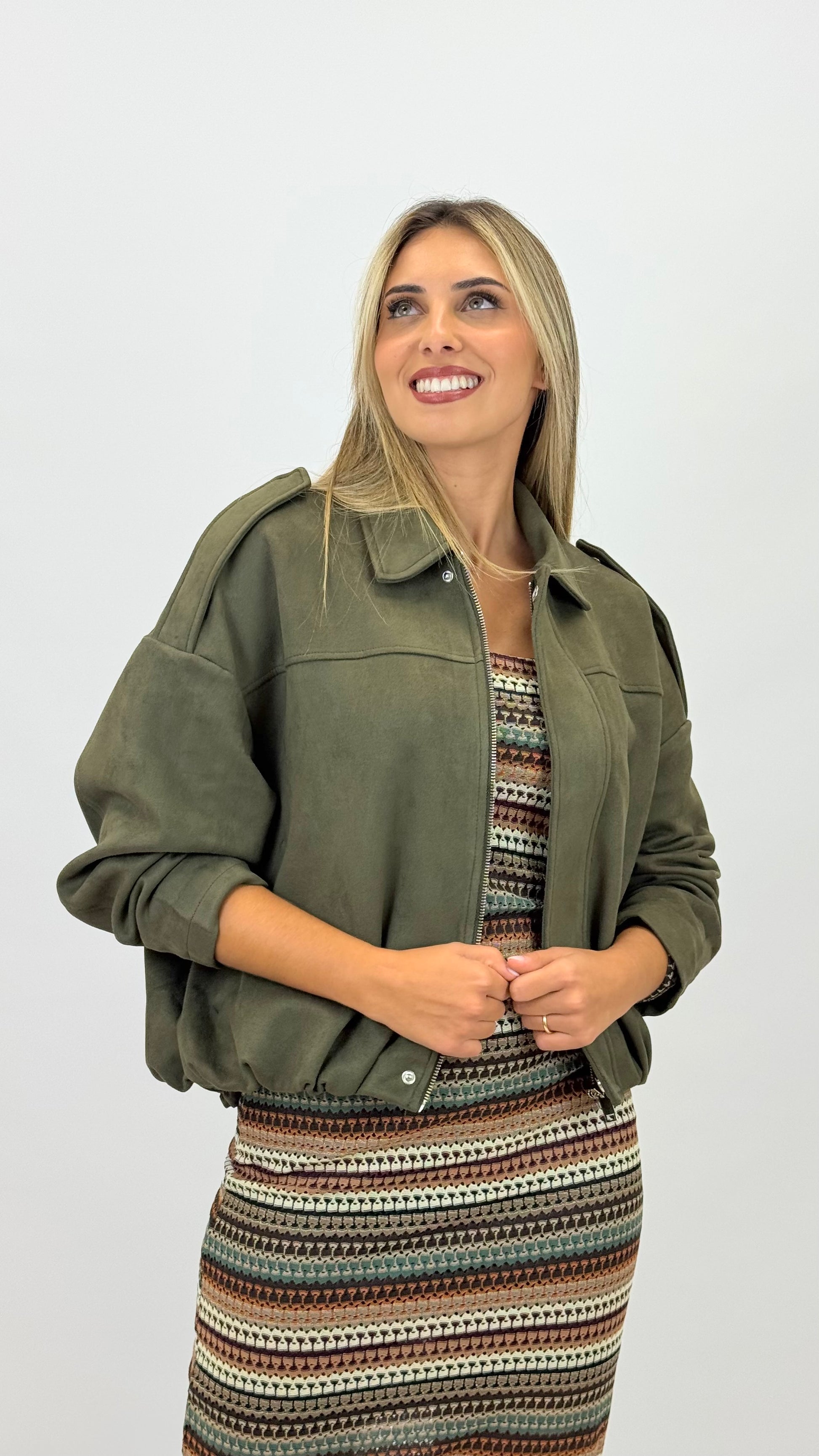 Blusão estilo camurça verde-seco. Elástico na cintura. Aperta com fecho de correr na parte da frente.
