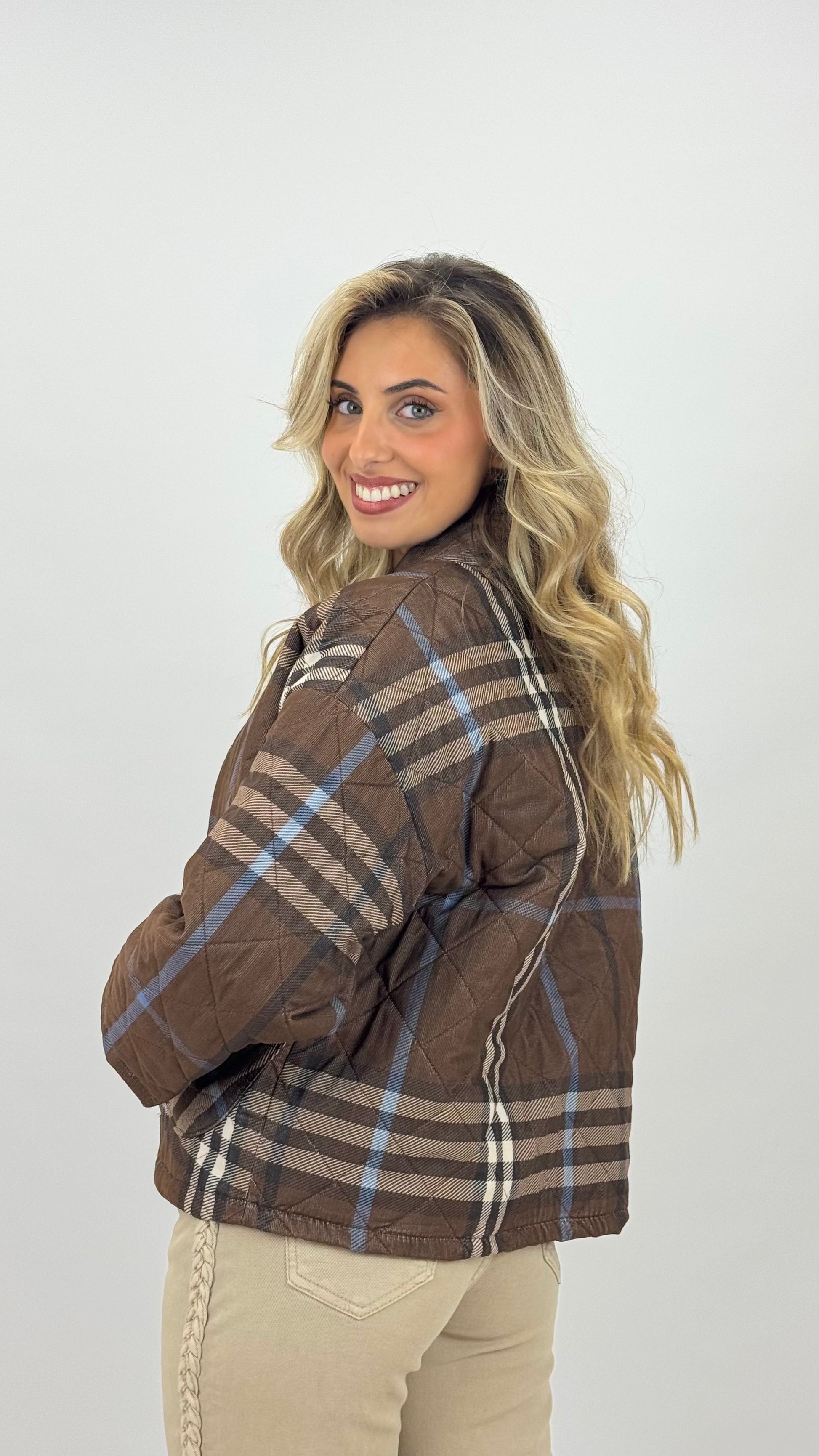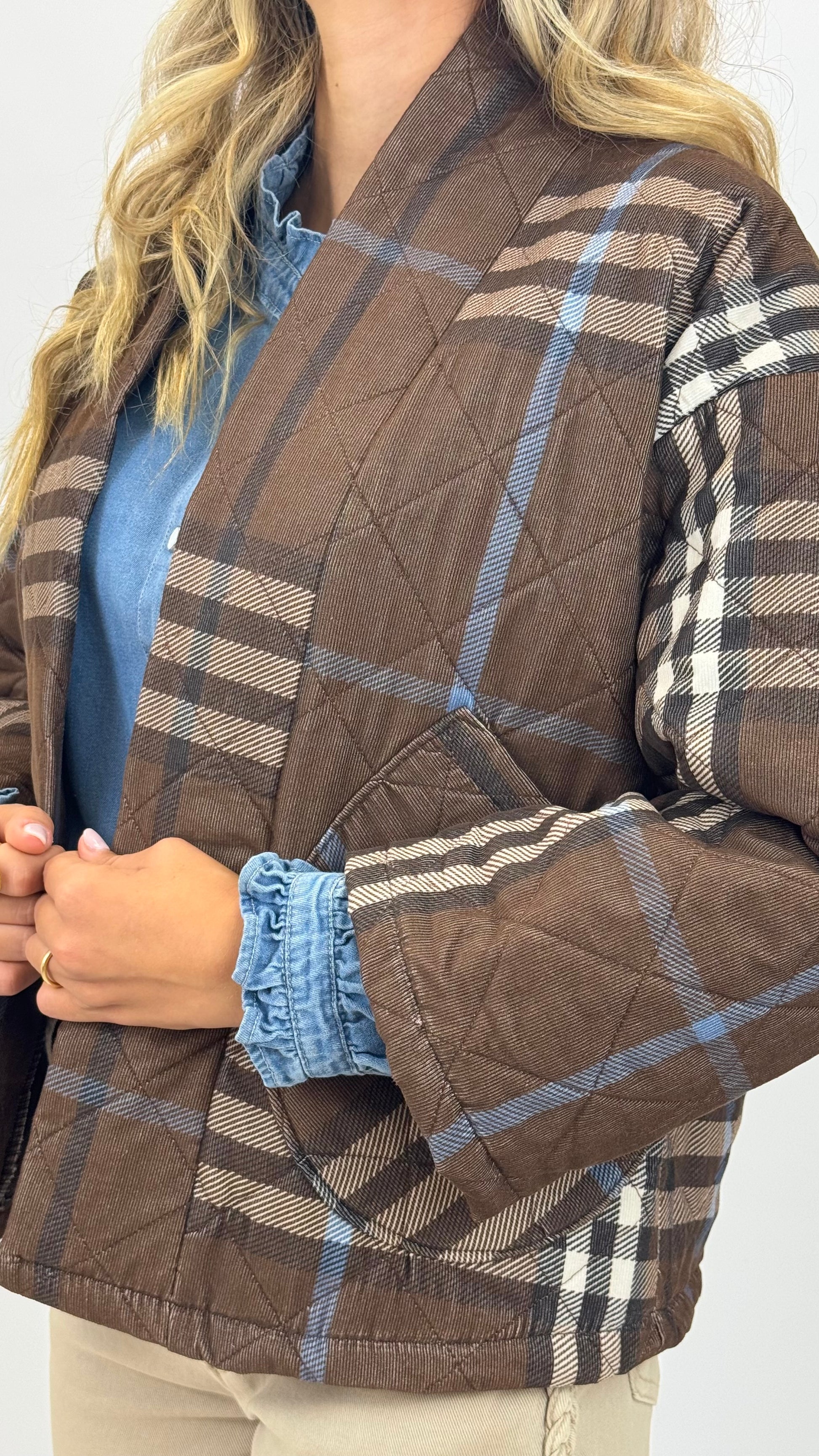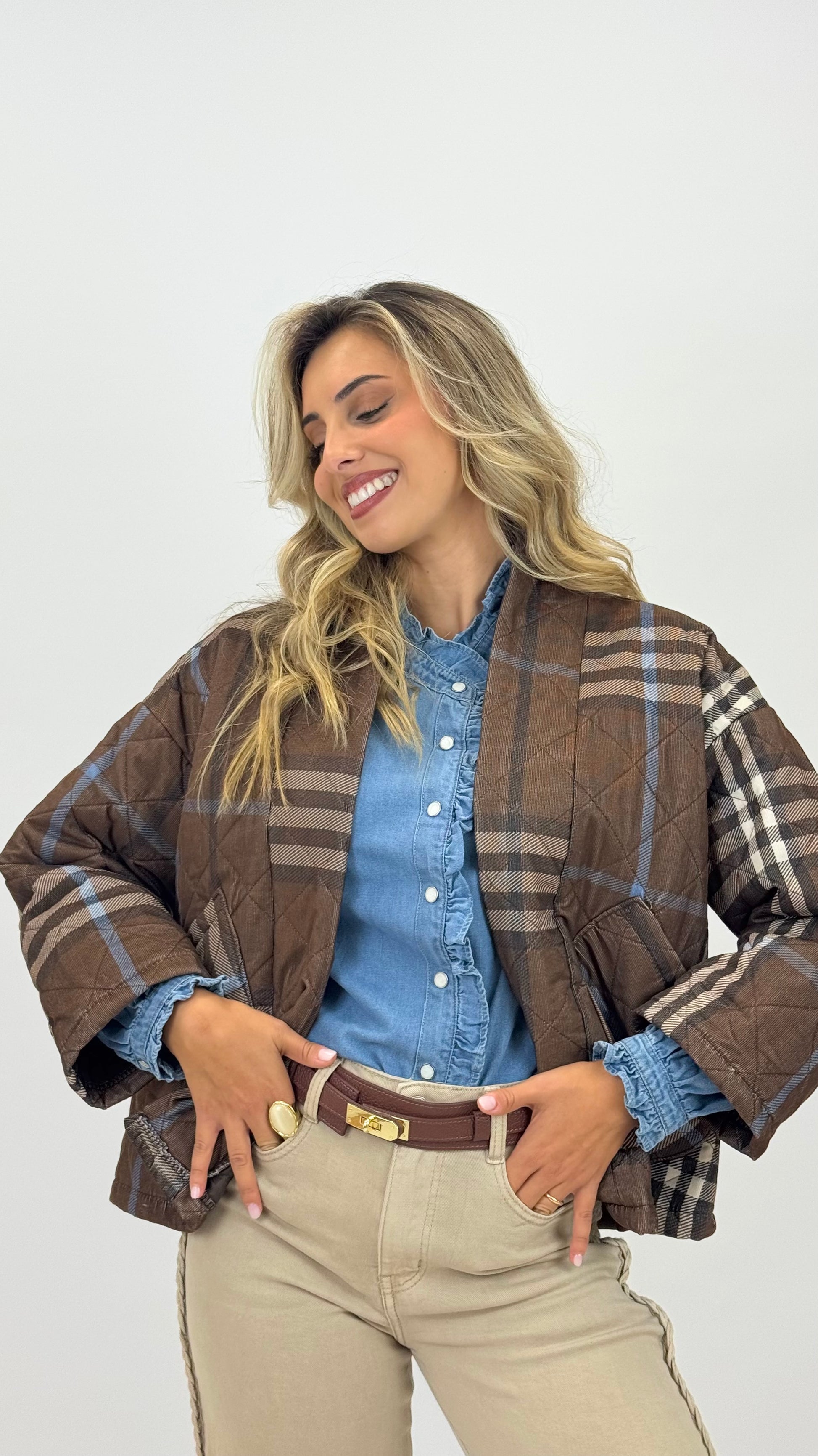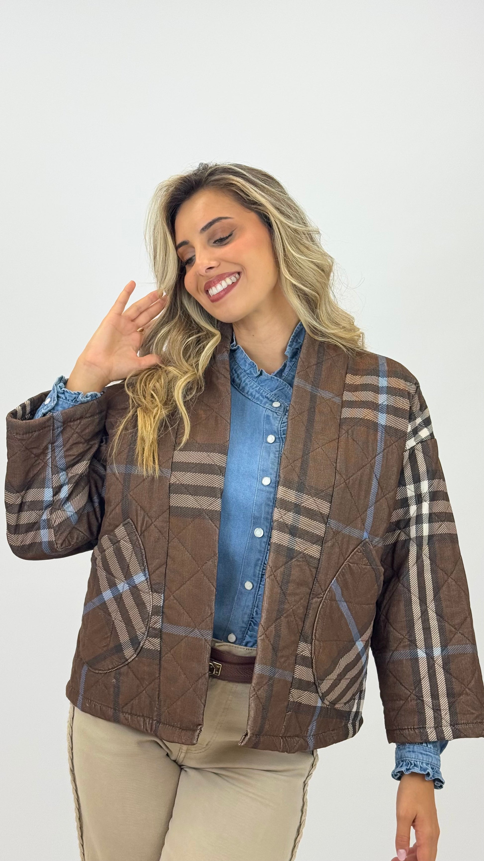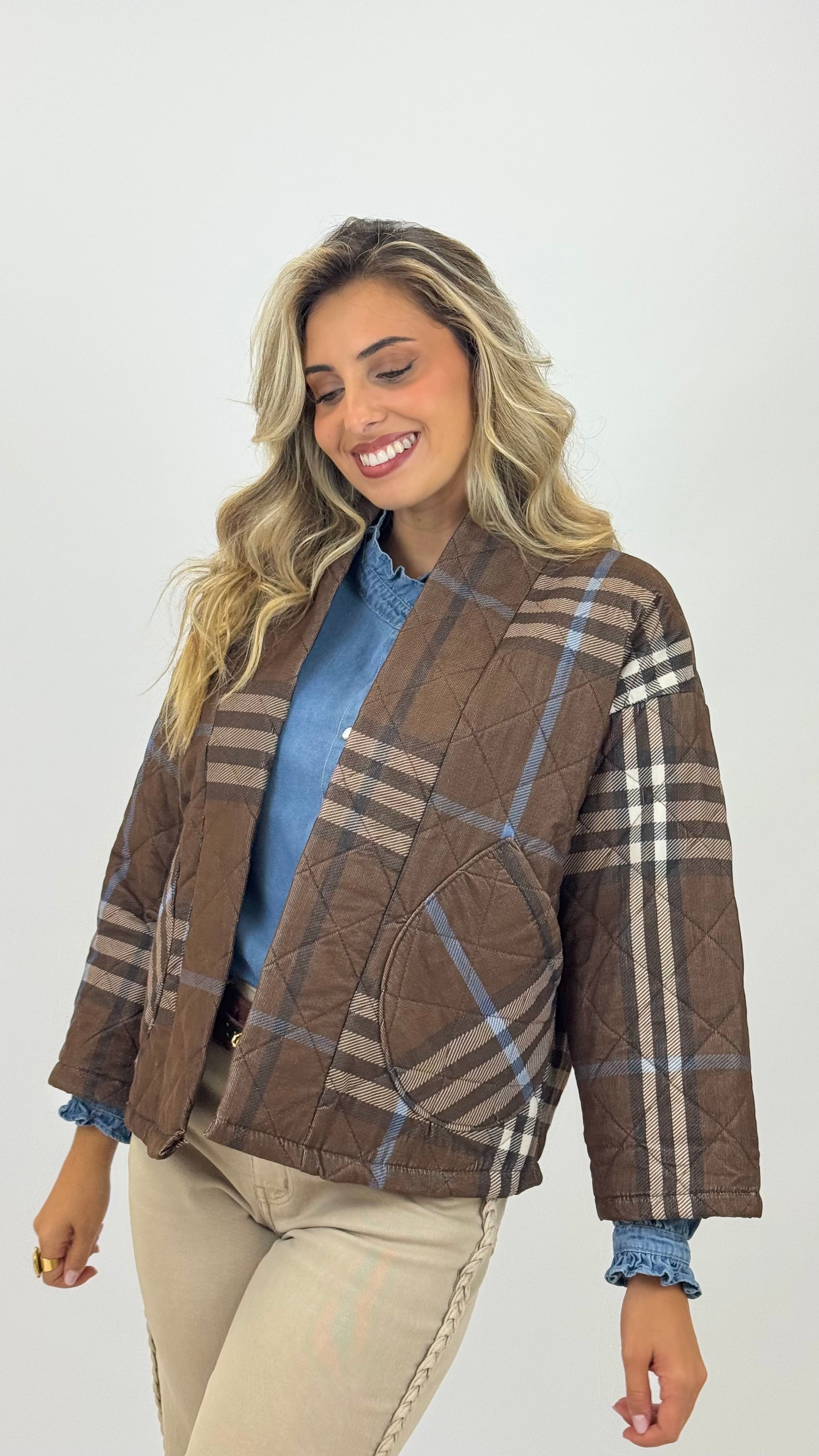 Casaco acolchoado em bombazine fina, macio e confortável. Estampado ao xadrez fundo castanho com risca pérola e azul-ganga.