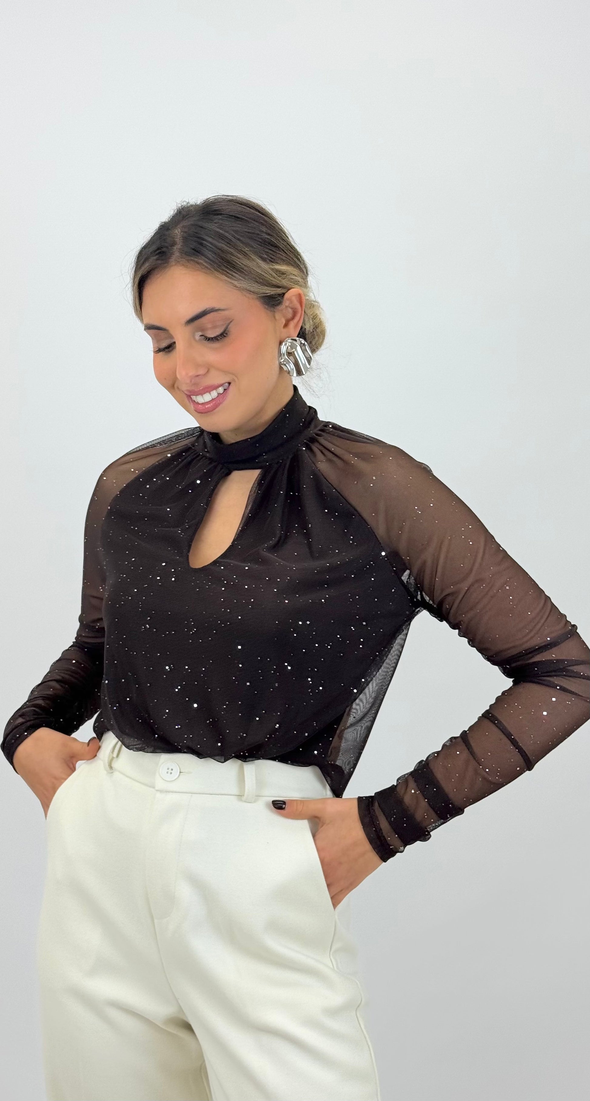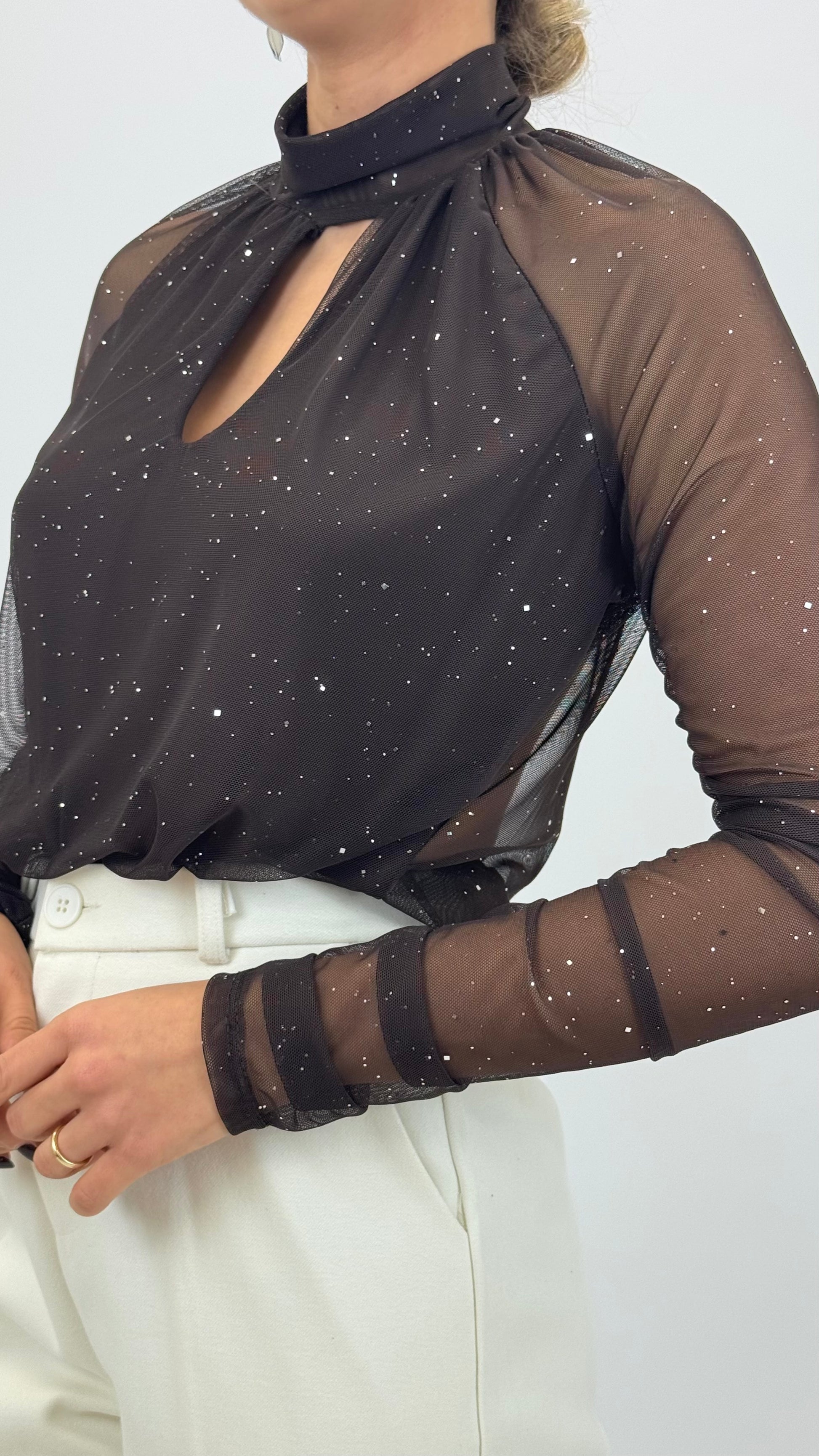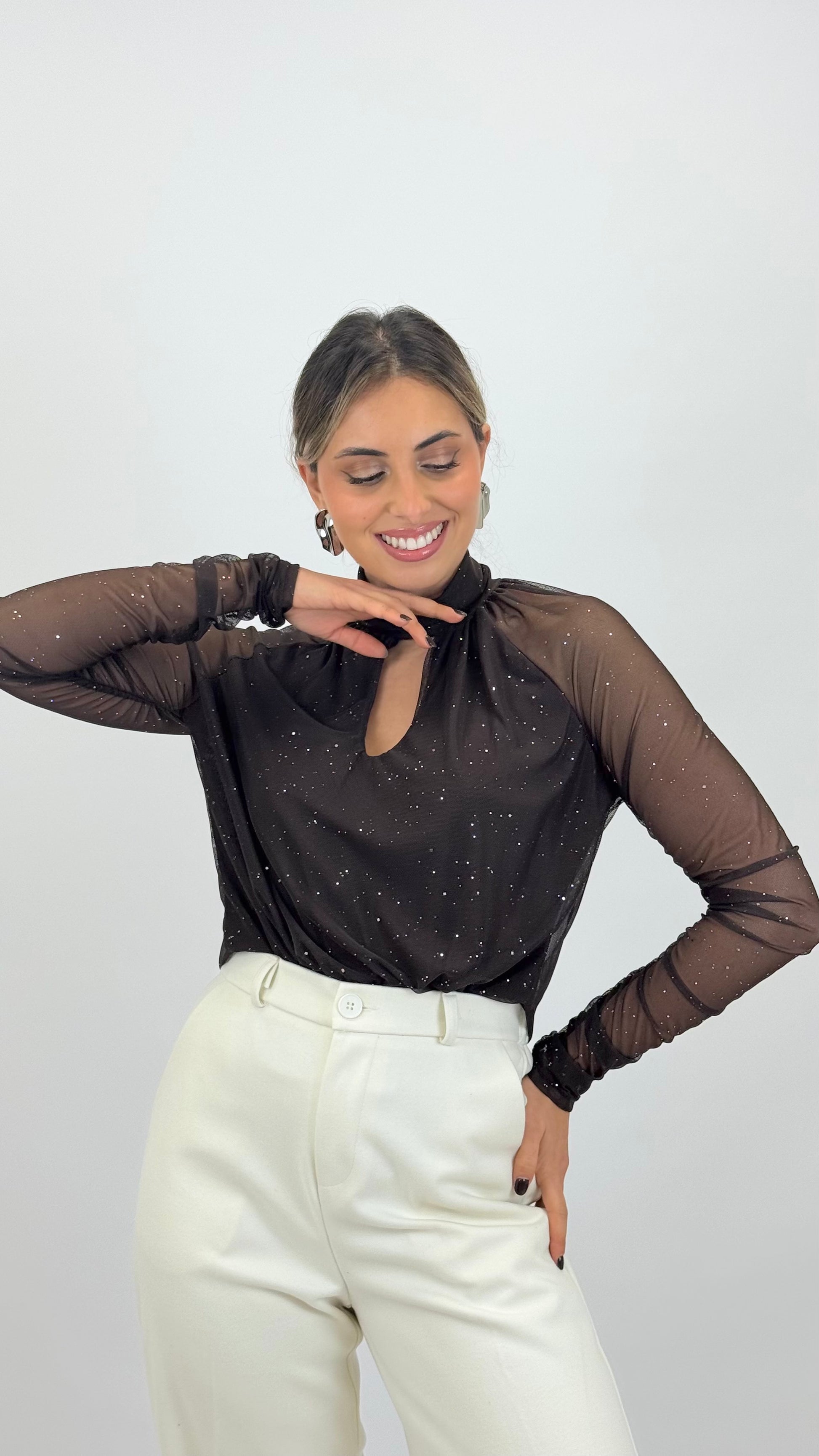 Body em tule transparente elástico. Forrado na parte da frente.