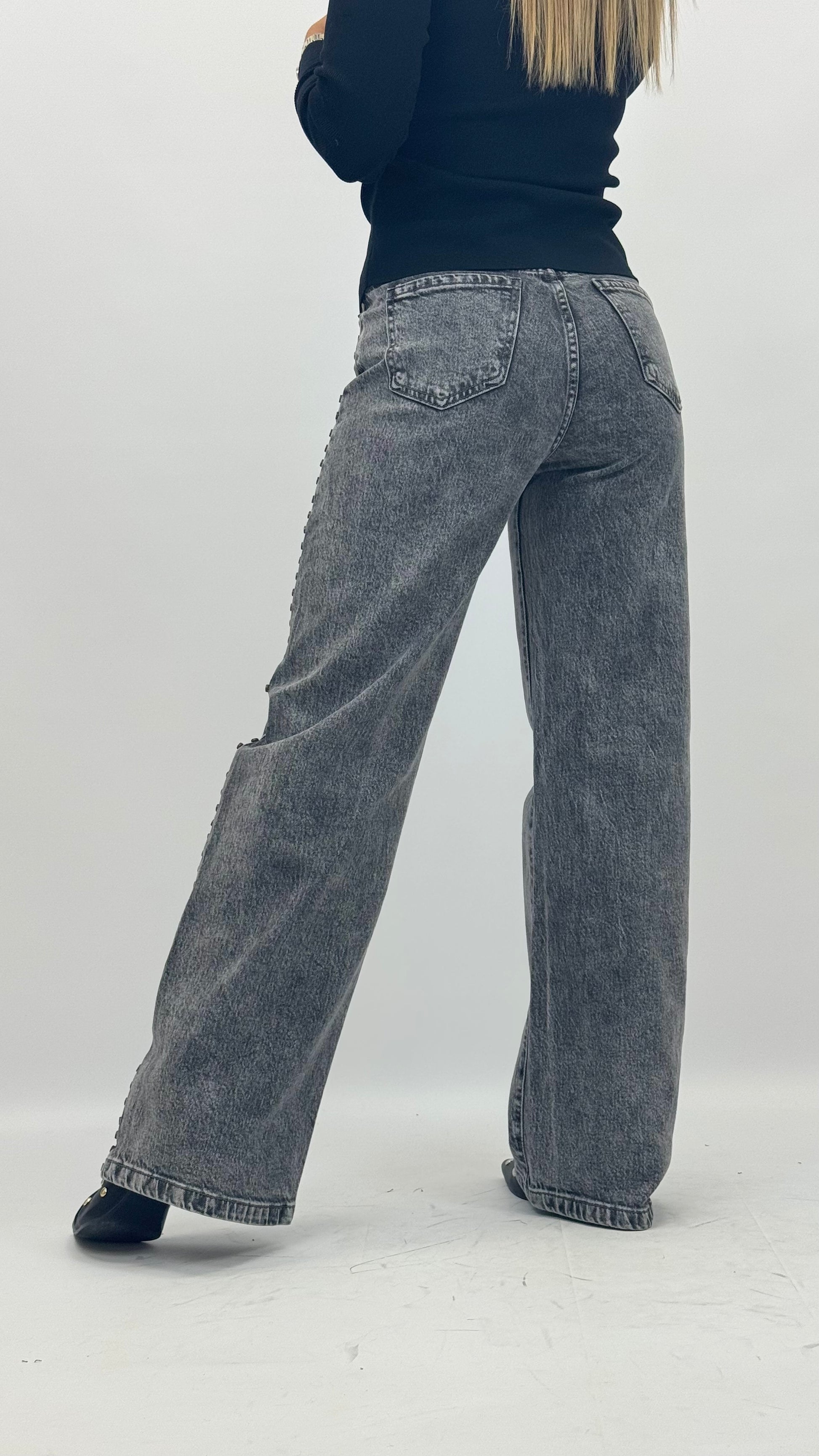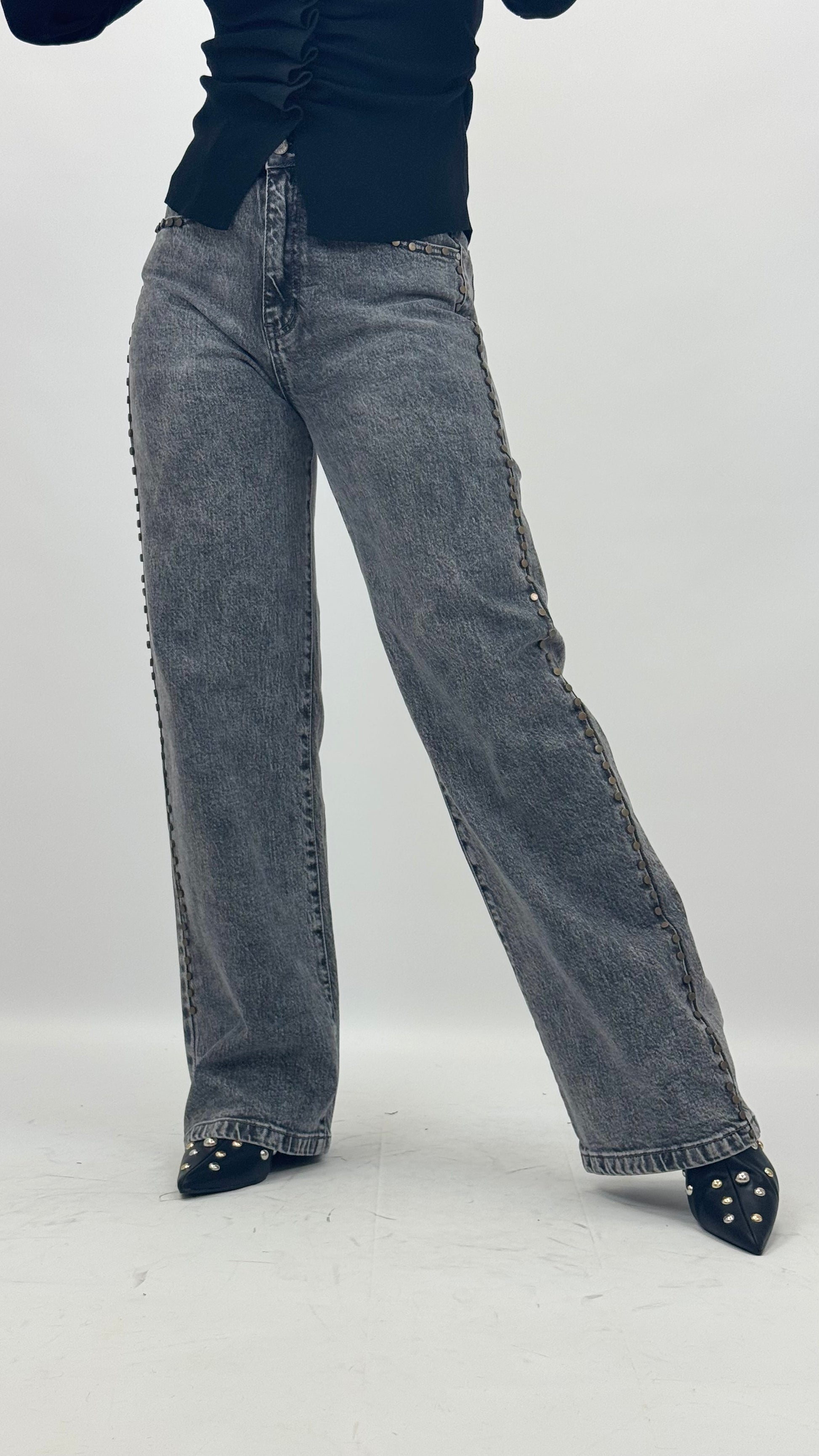 Calça em ganga cinza escura, elástica, modelo wide-leg. Detalhe de tachas em dourado-velho.