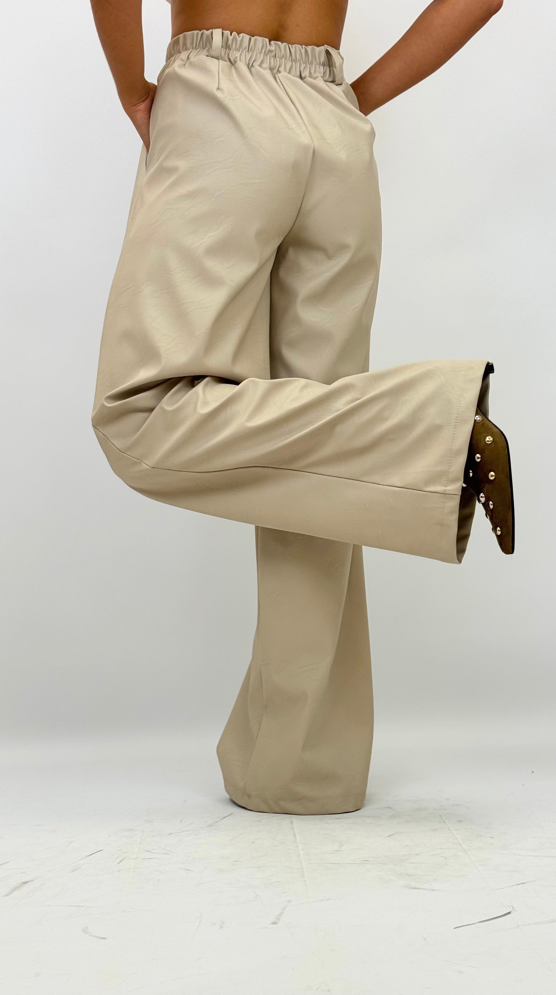 Calça larga em eco-pele (estilo napa) creme. Aperta com botão e fecho de correr na parte da frente. Elástico na parte de trás da cintura. Veste de um tamanho 36 a 42.