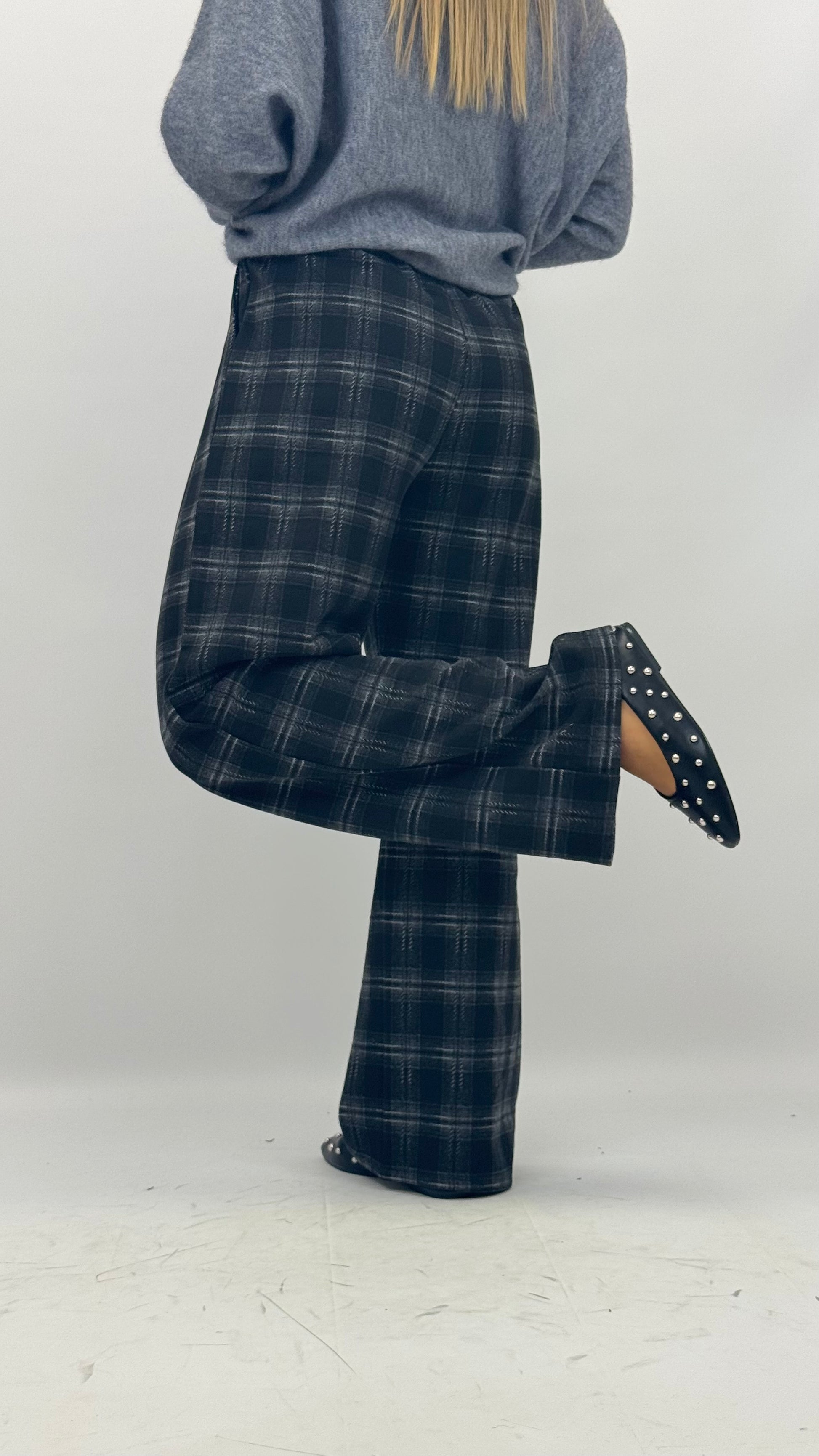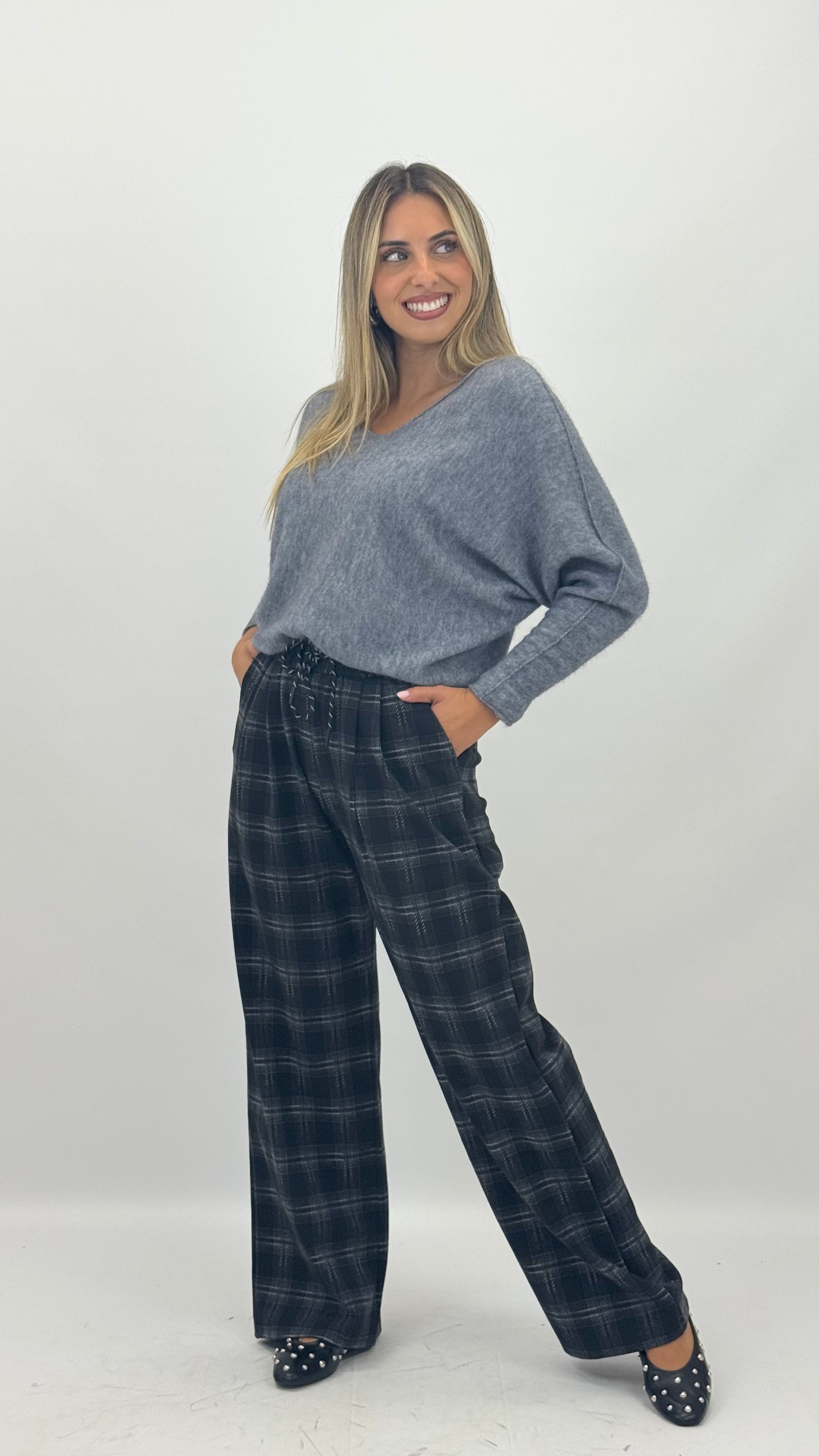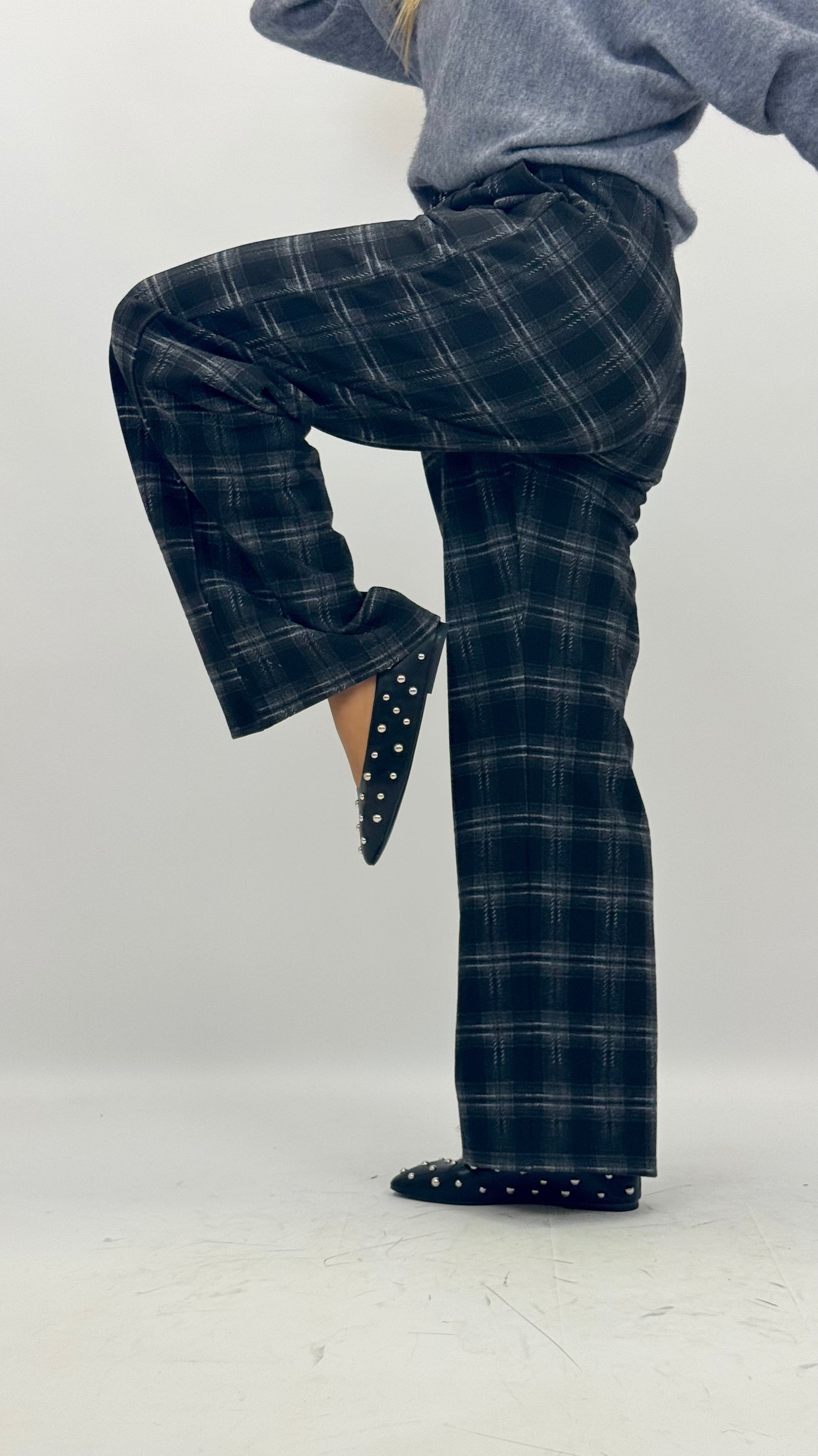 Calça larga em tecido quente e macio estilo fazenda. Xadrez fundo preto com risca cinza. Elástico na cintura e atilho ajustável. Bolsos nas laterais.