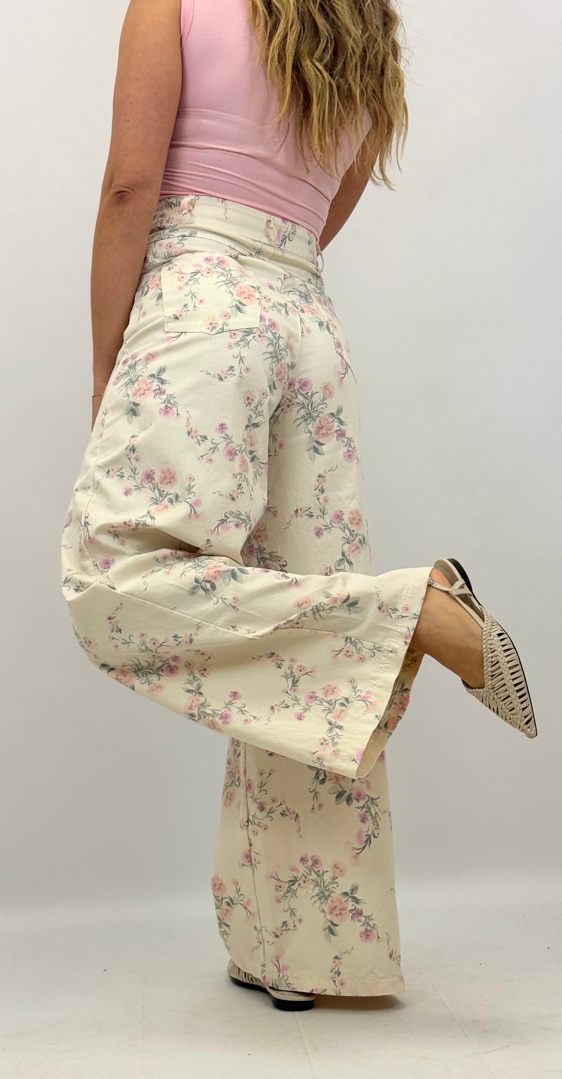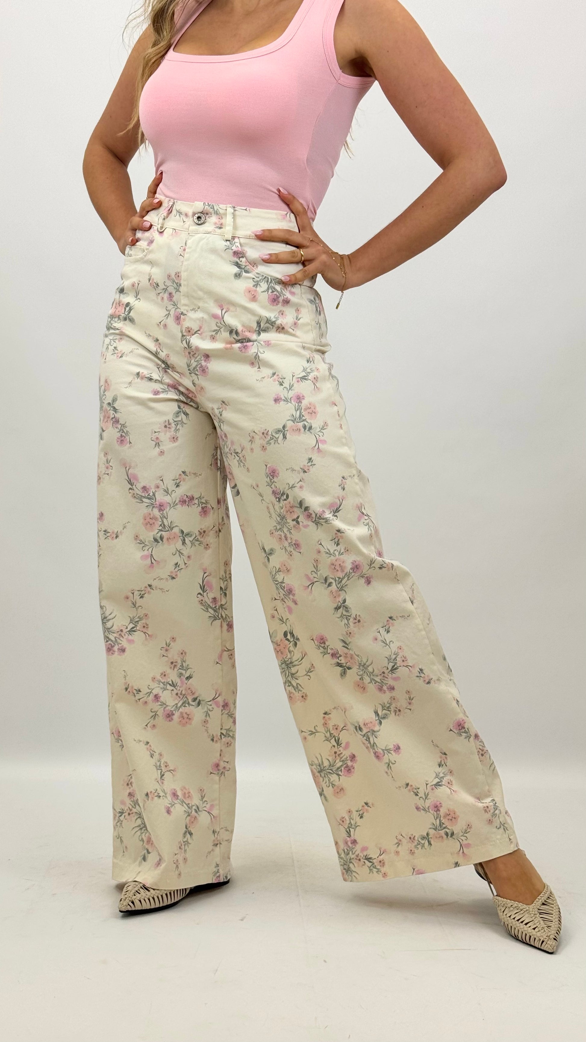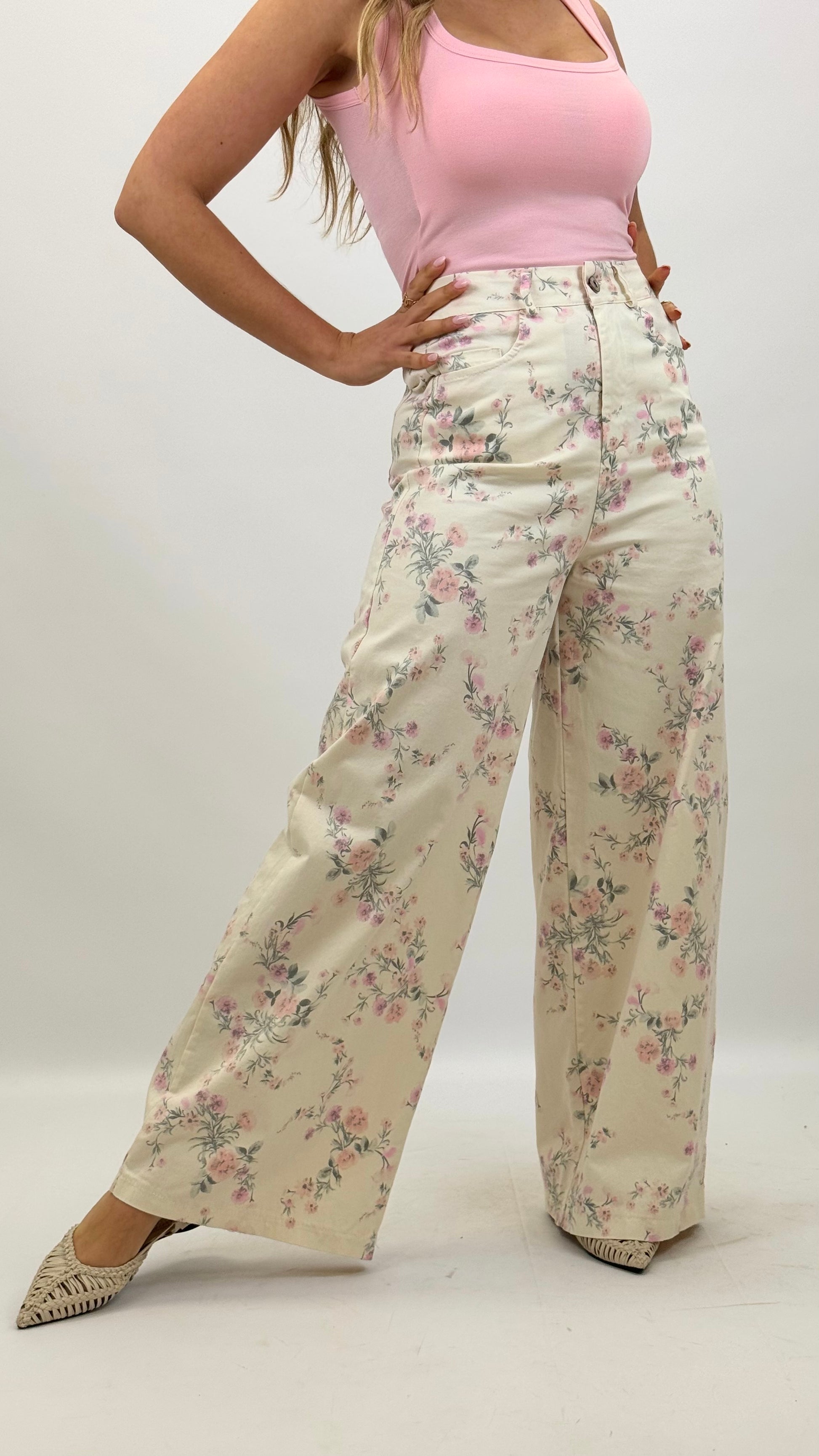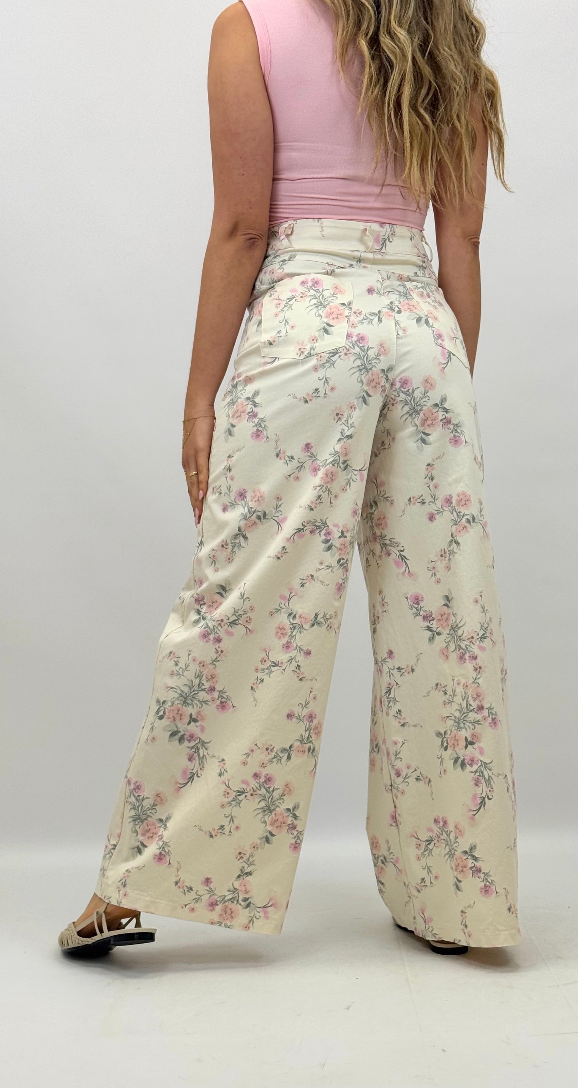 Calça modelo wide-leg em sarja fina elástica, fundo creme, com florzinhas em tons de rosa e verde.