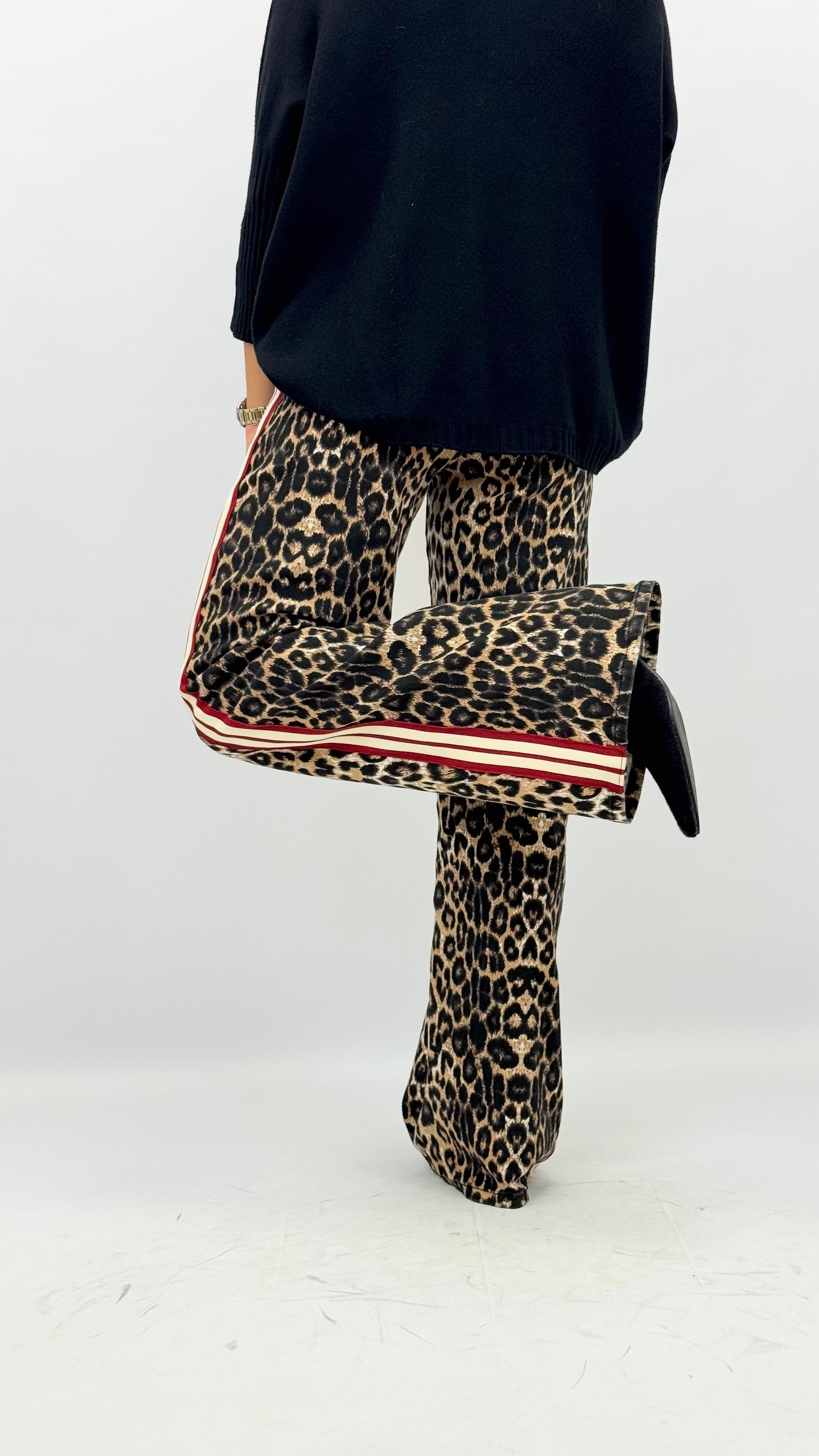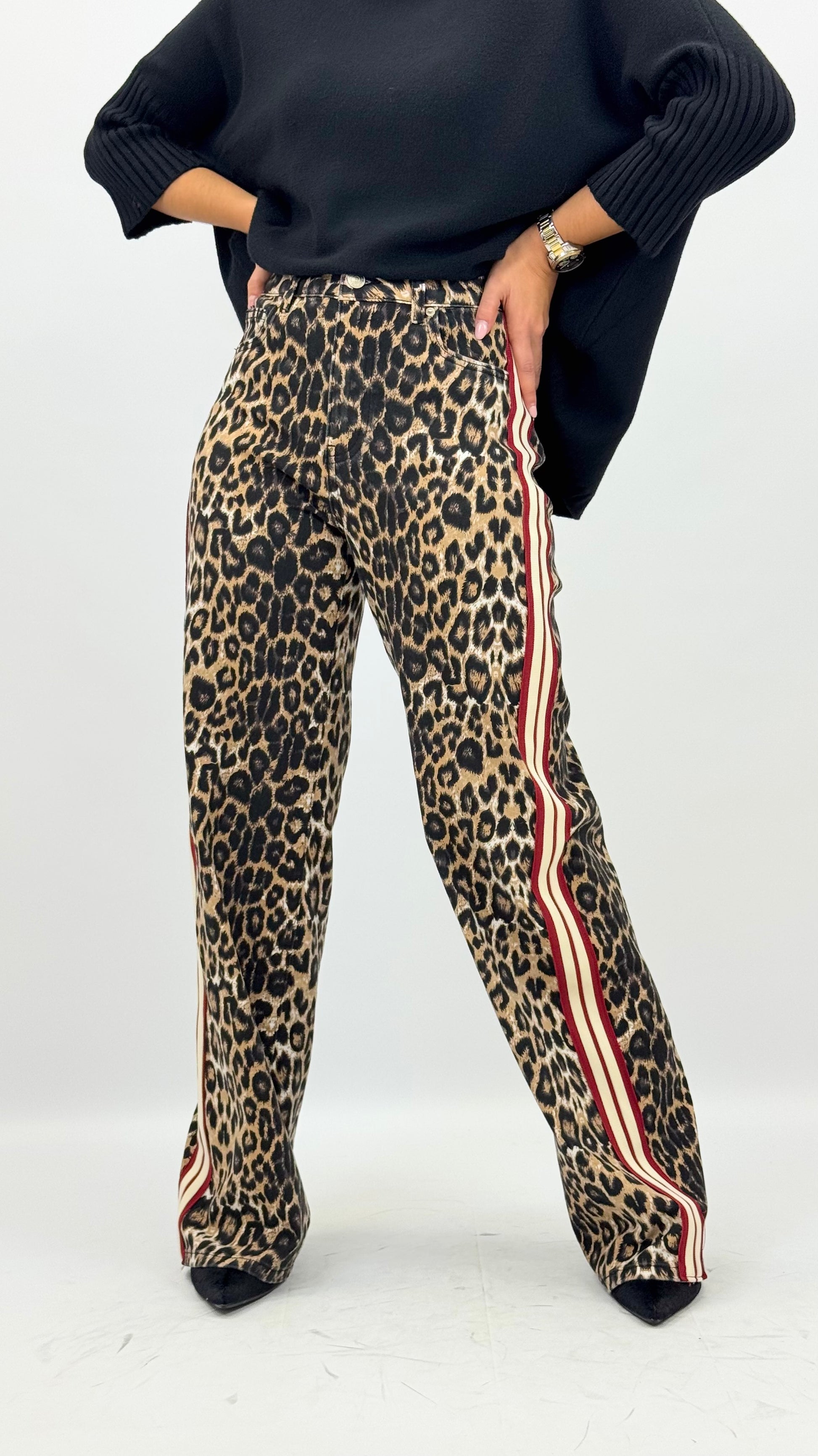Calça em sarja elástica estampado leopardo modelo wide-leg com detalhe de lista na lateral em vermelho/bordeaux e pérola.