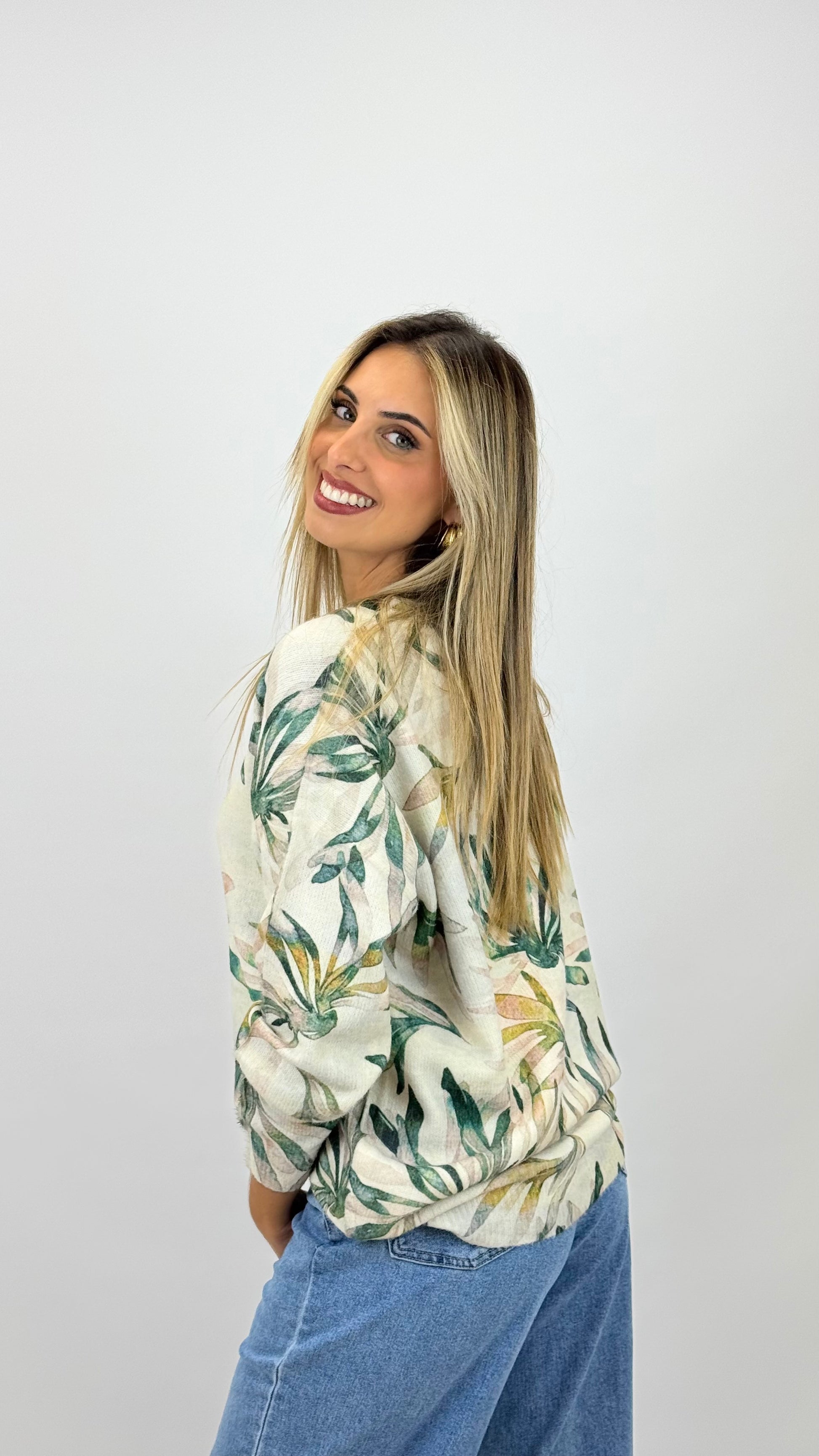 Camisola de malha macia e confortável com estampado de folhas em tons de verde. Fundo pérola.