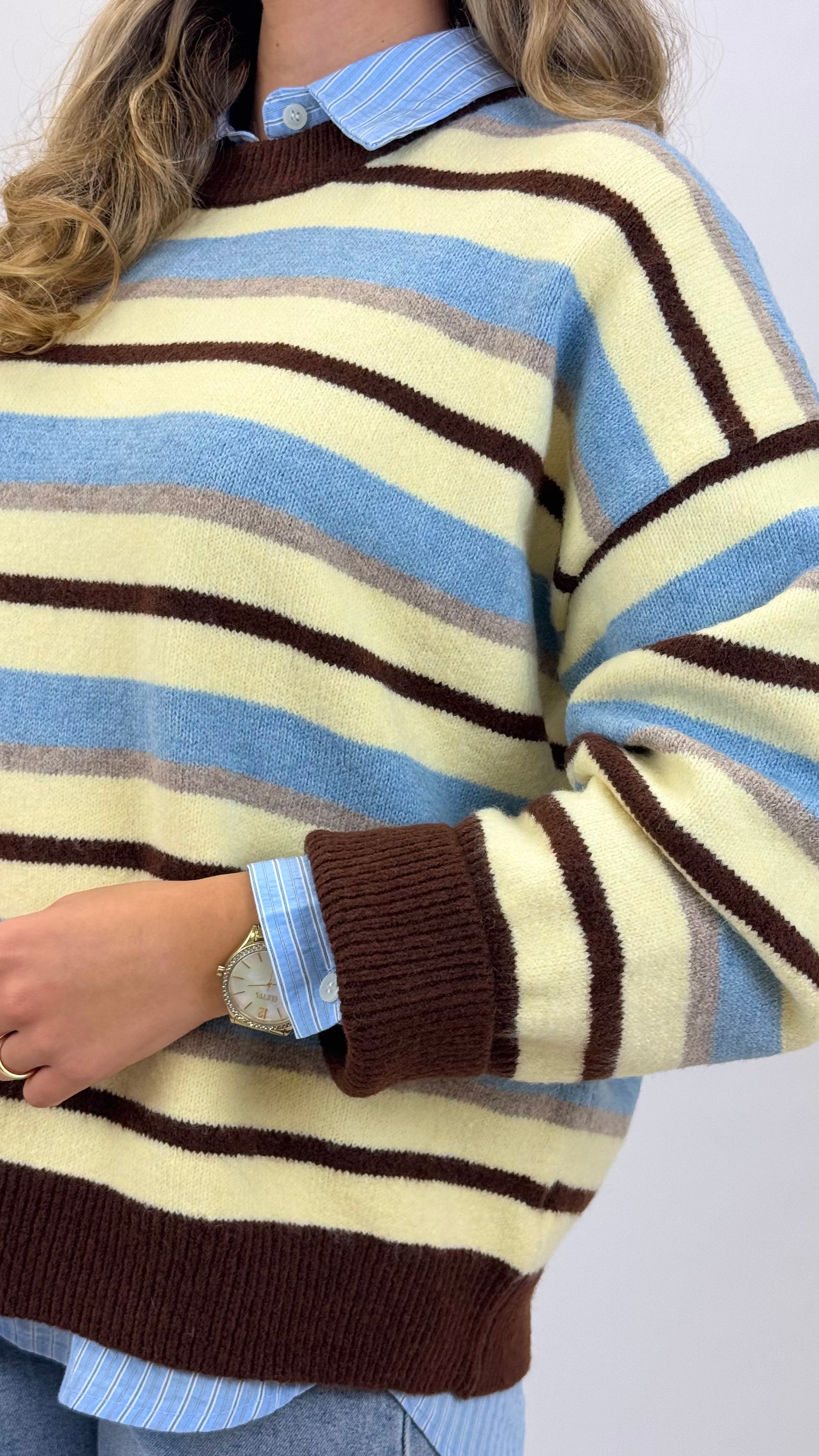 Camisola de malha macia e confortável, às riscas amarelo-claro, azul-bebé e castanho-chocolate.