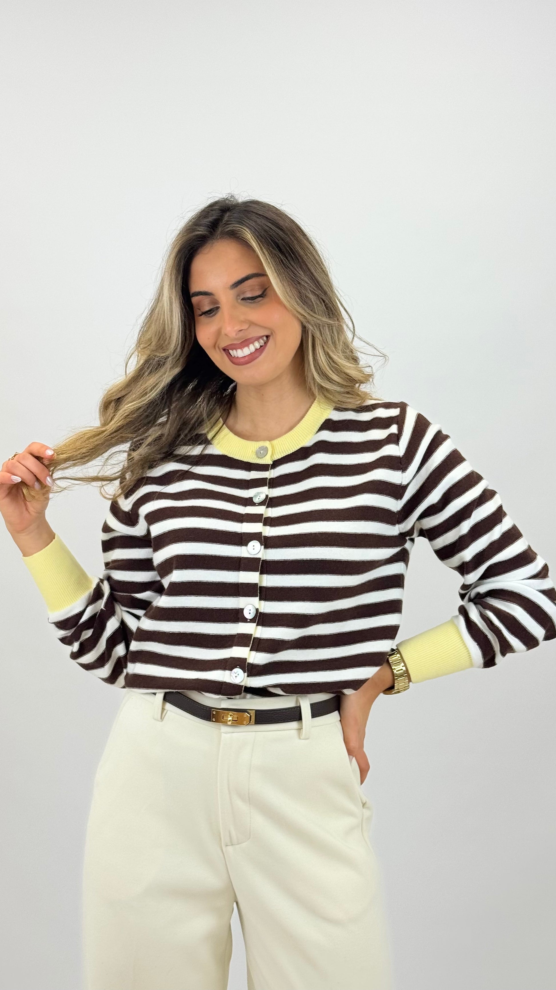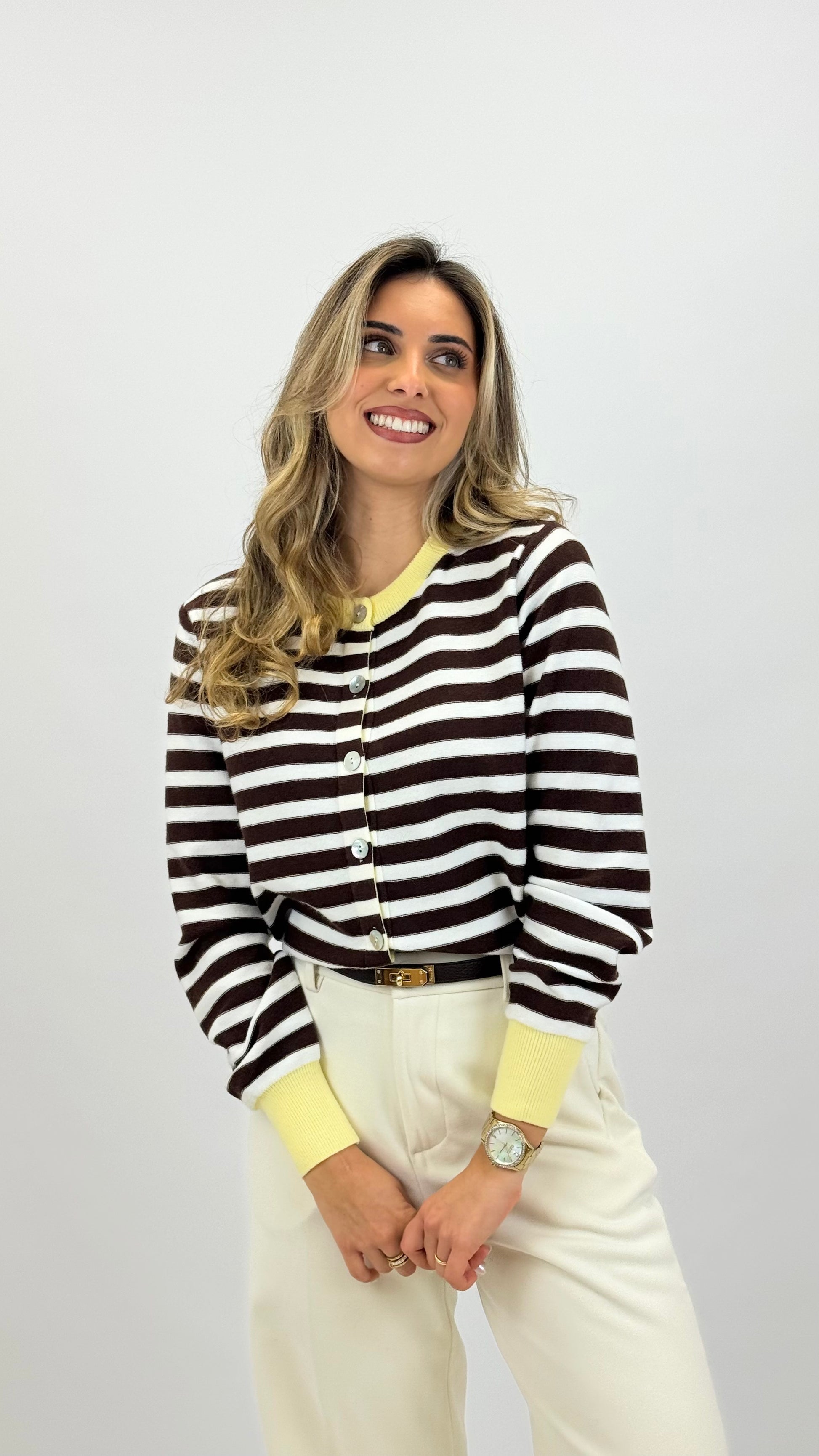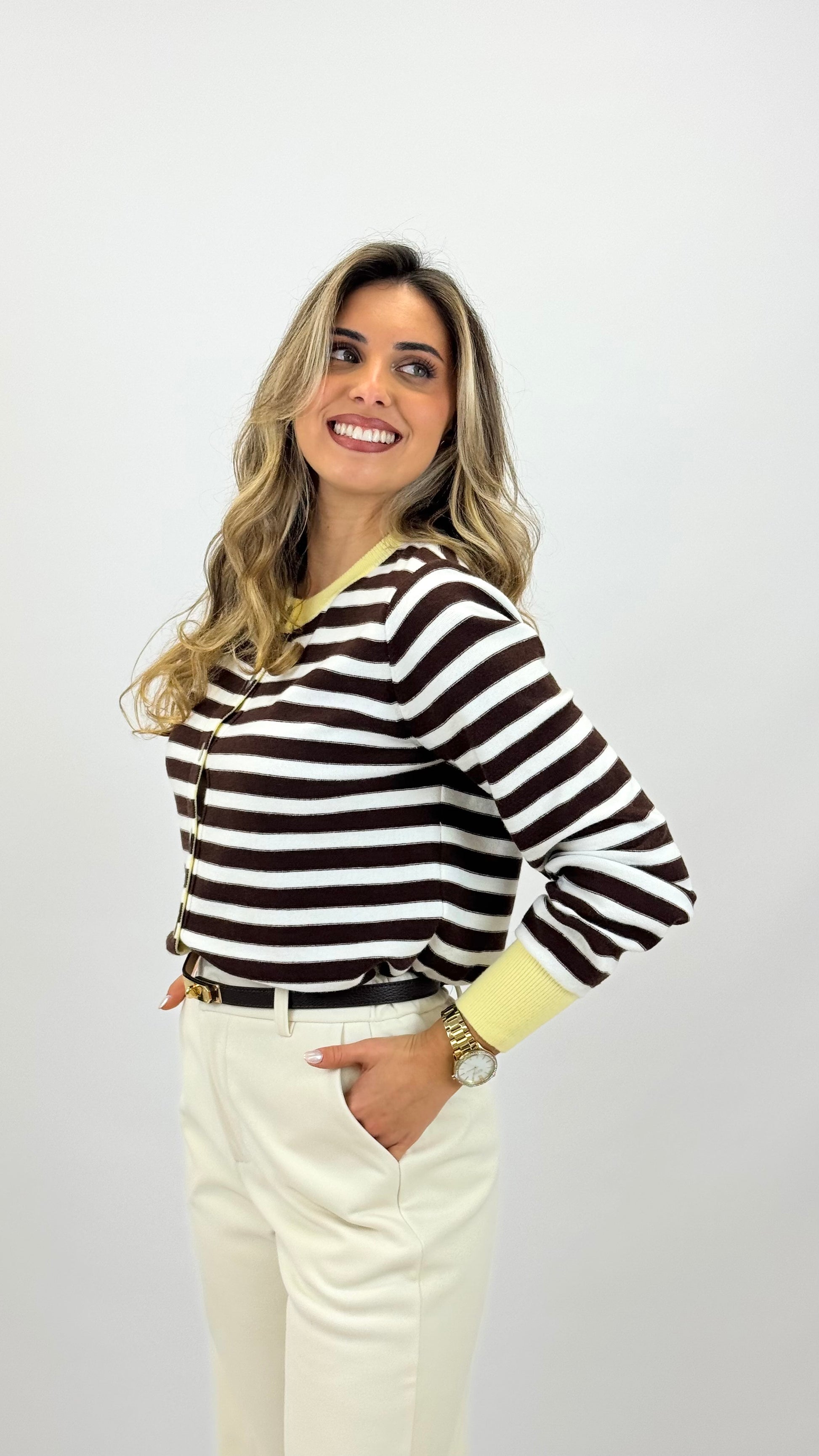 Casaco malha riscas castanho e pérola detalhes amarelo