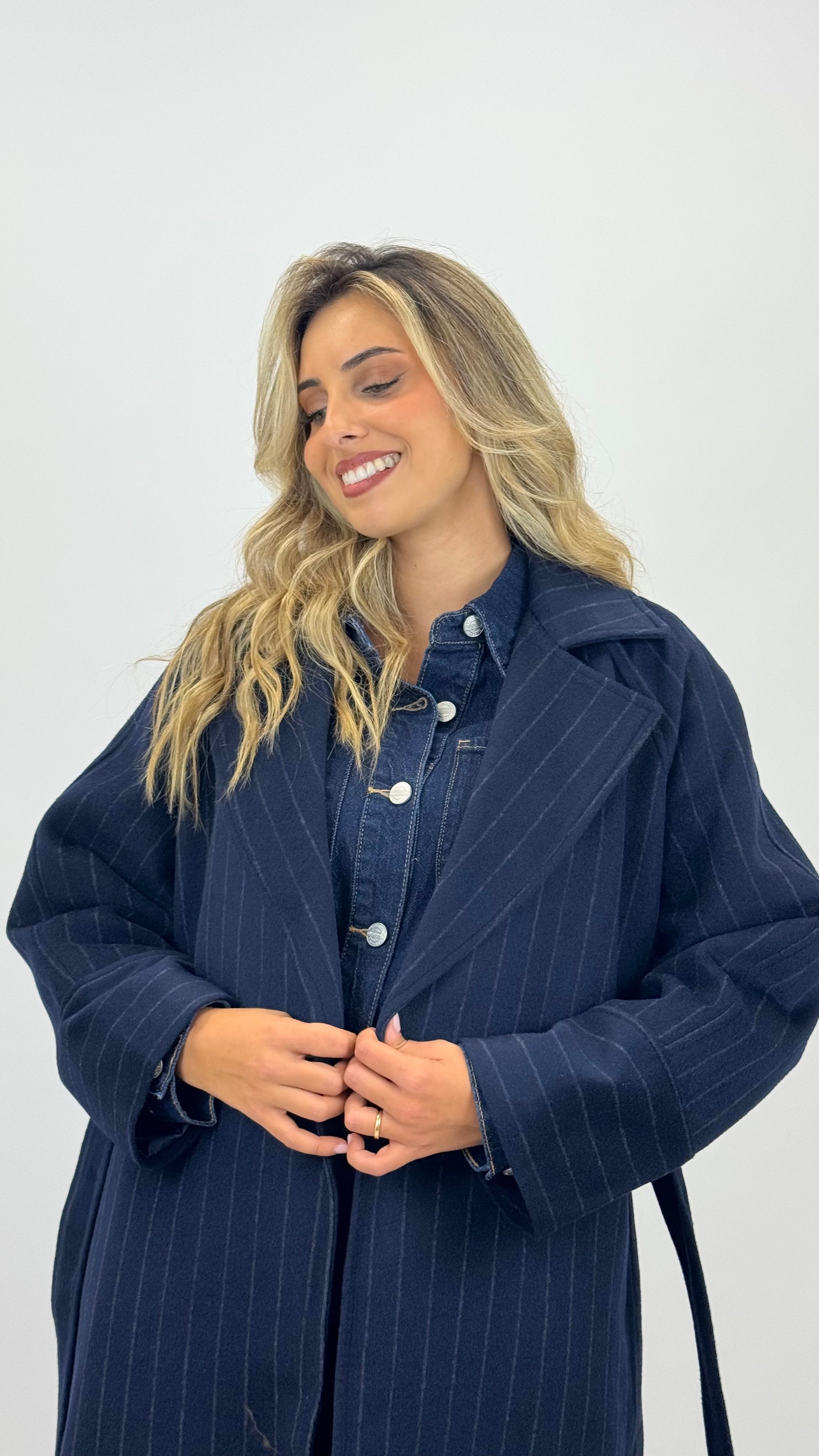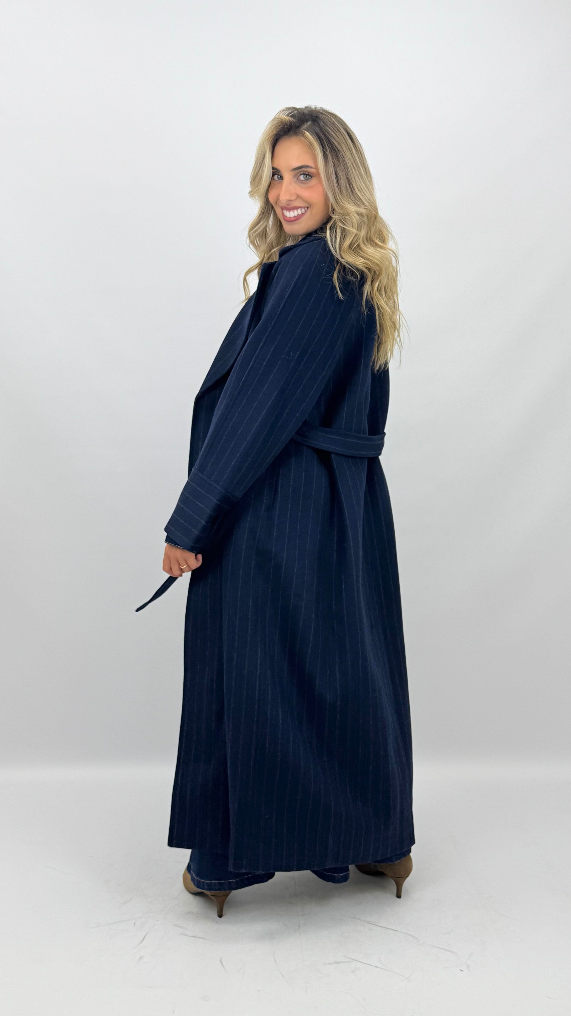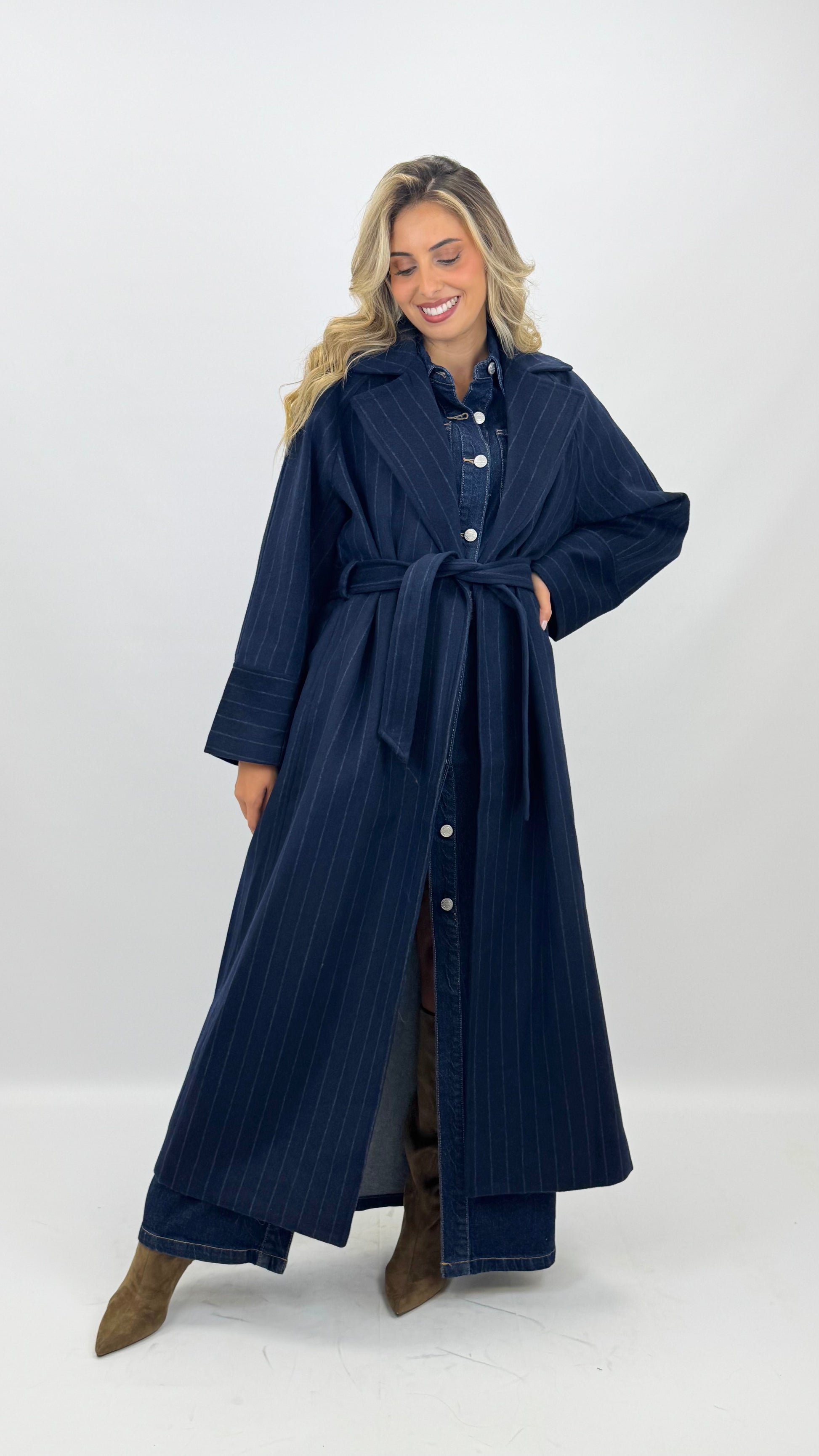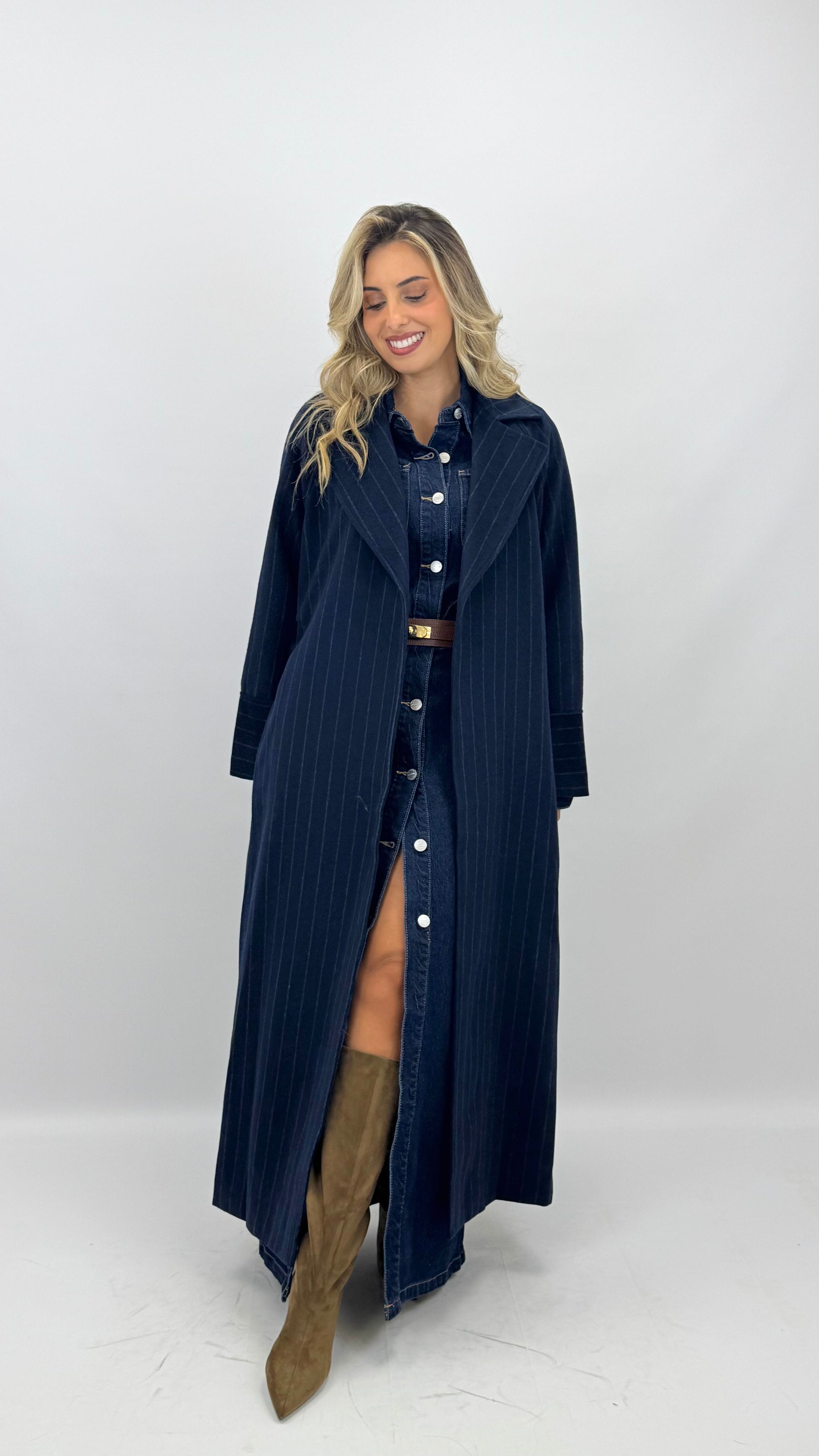 Casaco fazenda comprido azul-marinho com risca
