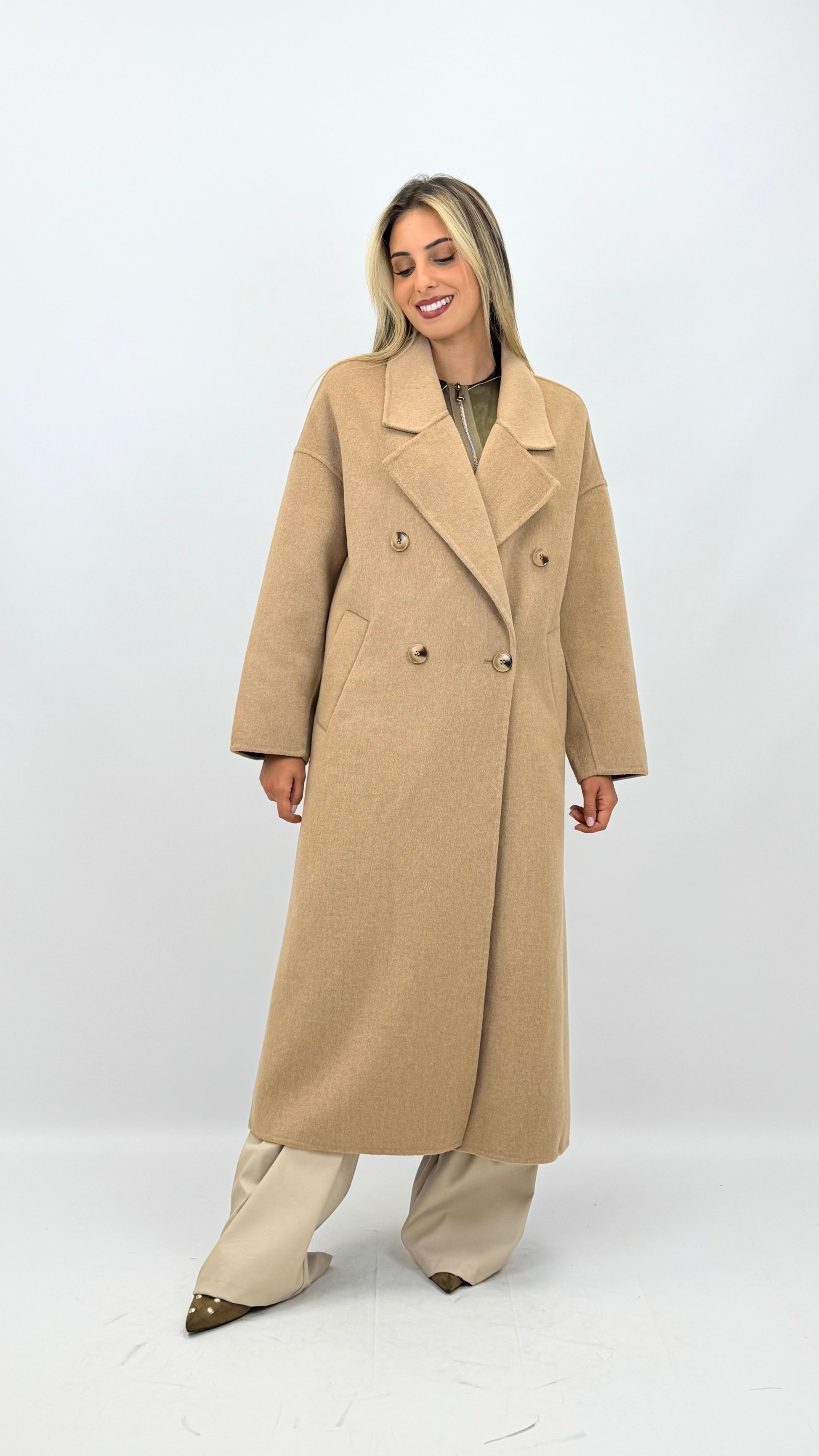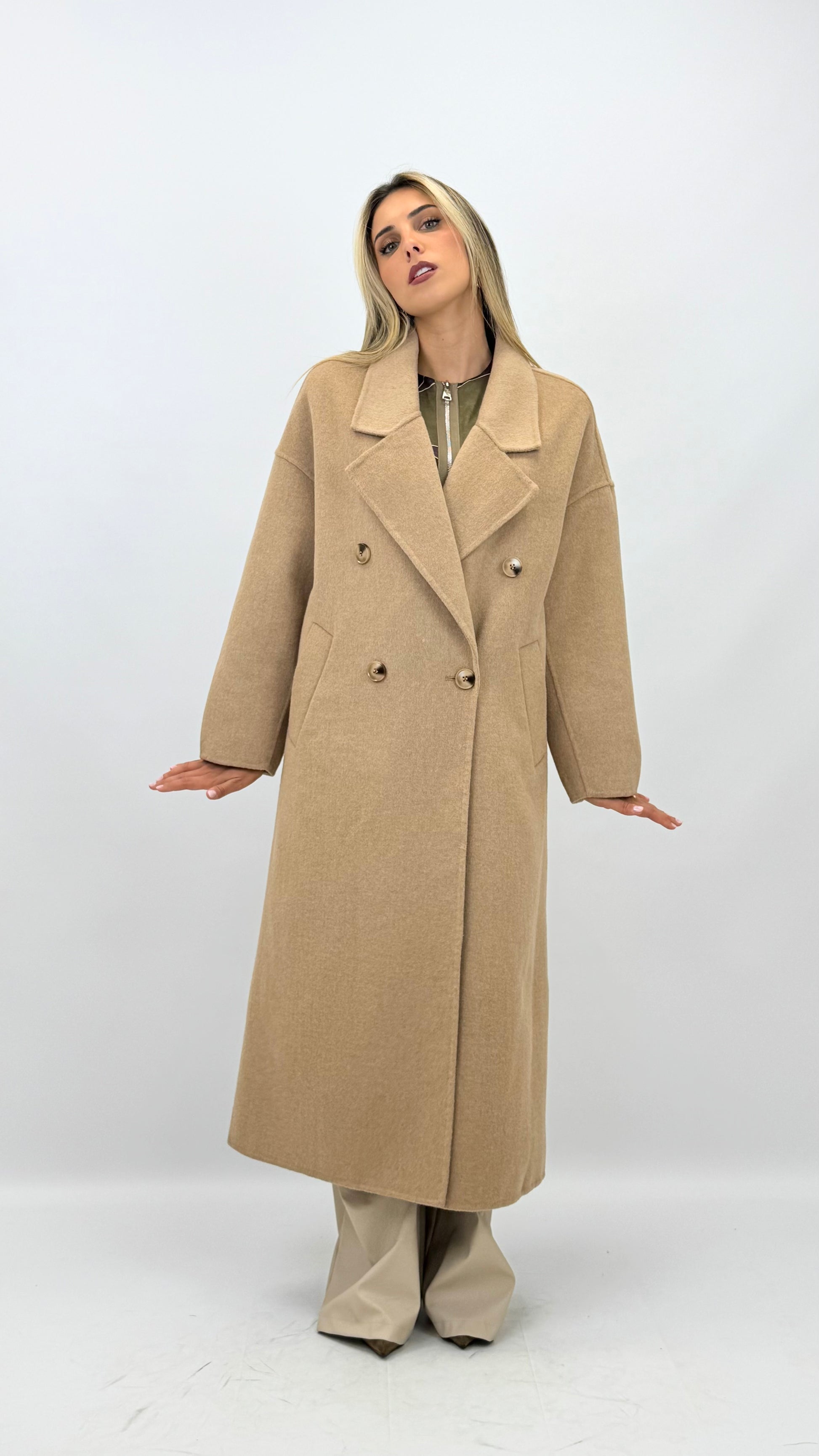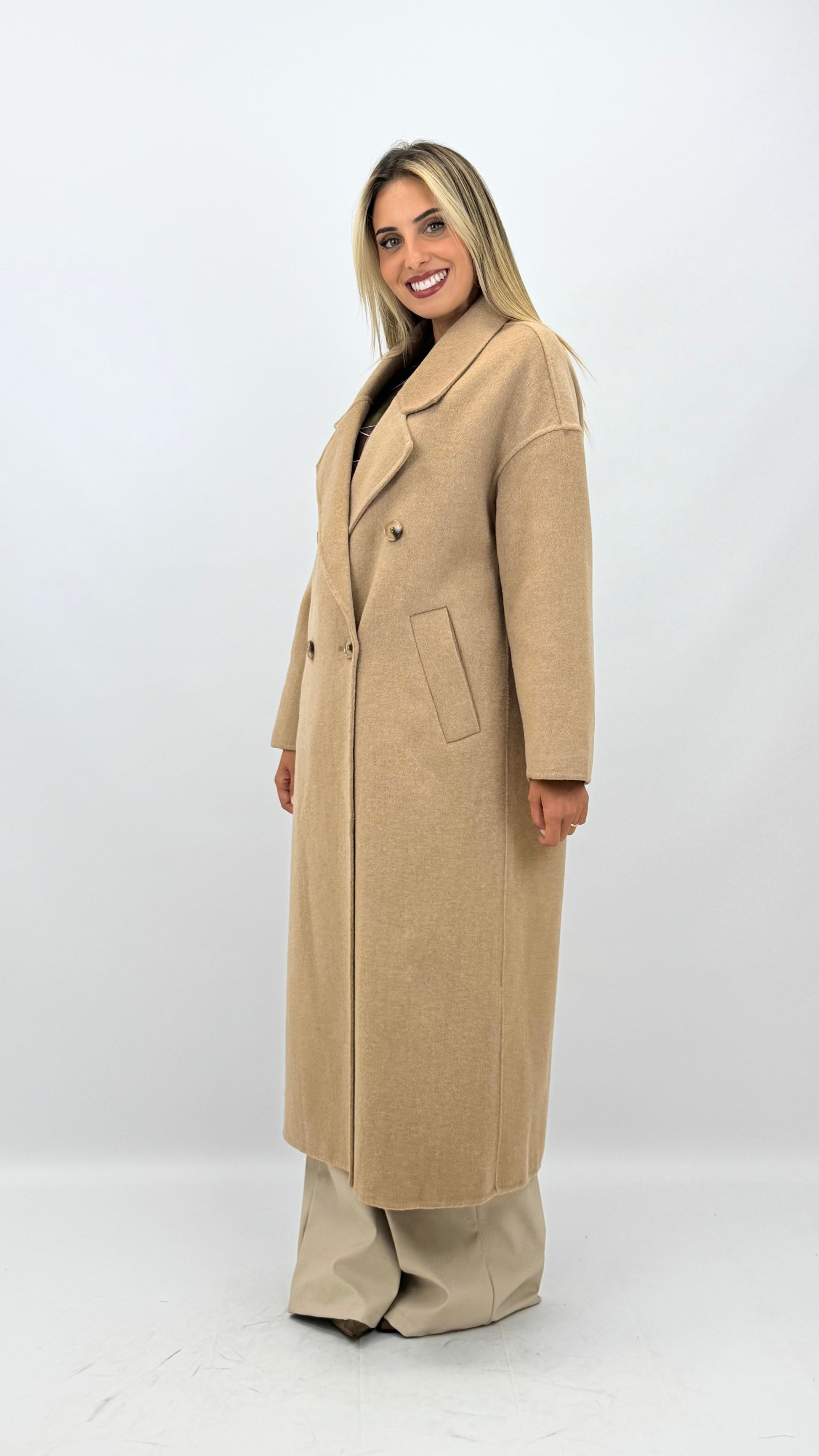 Sobretudo de fazenda, maioritariamente em lã, quente e confortável, modelo comprido, corte a direito com manga comprida. Aperta com botões em trespasse na parte da frente. Bolsos nas laterais.
