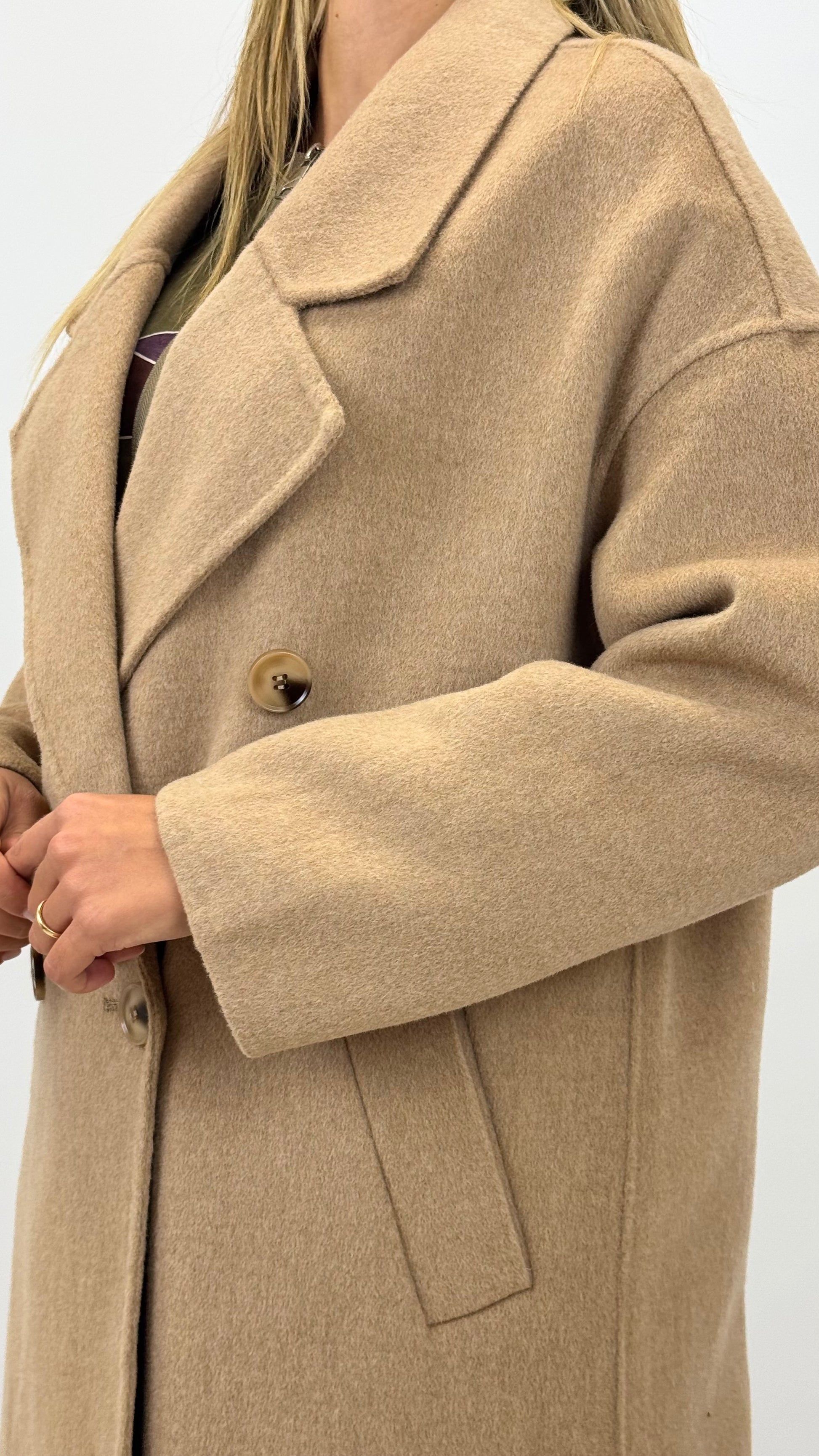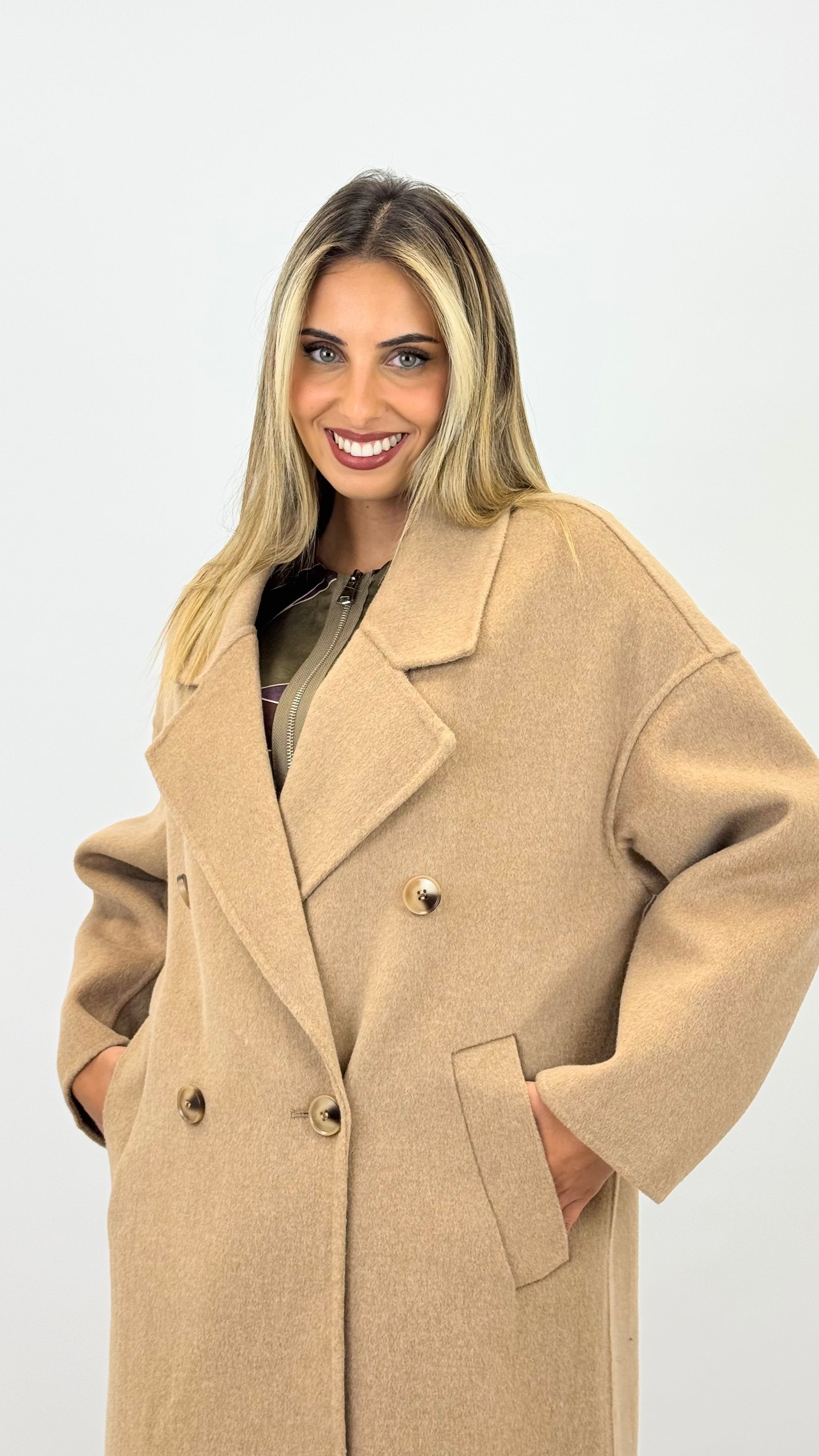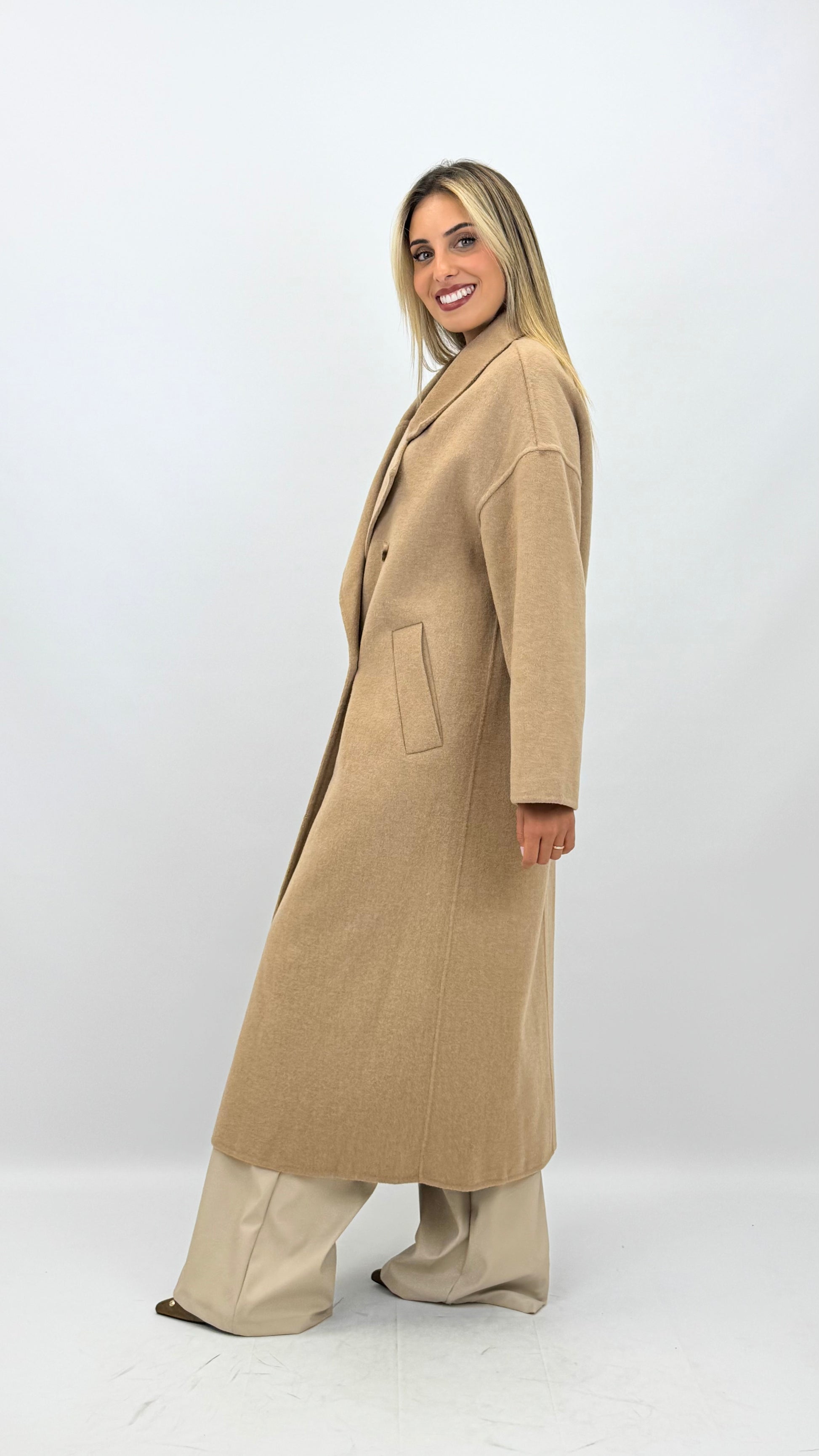 Sobretudo de fazenda, maioritariamente em lã, quente e confortável, modelo comprido, corte a direito com manga comprida. Aperta com botões em trespasse na parte da frente. Bolsos nas laterais.