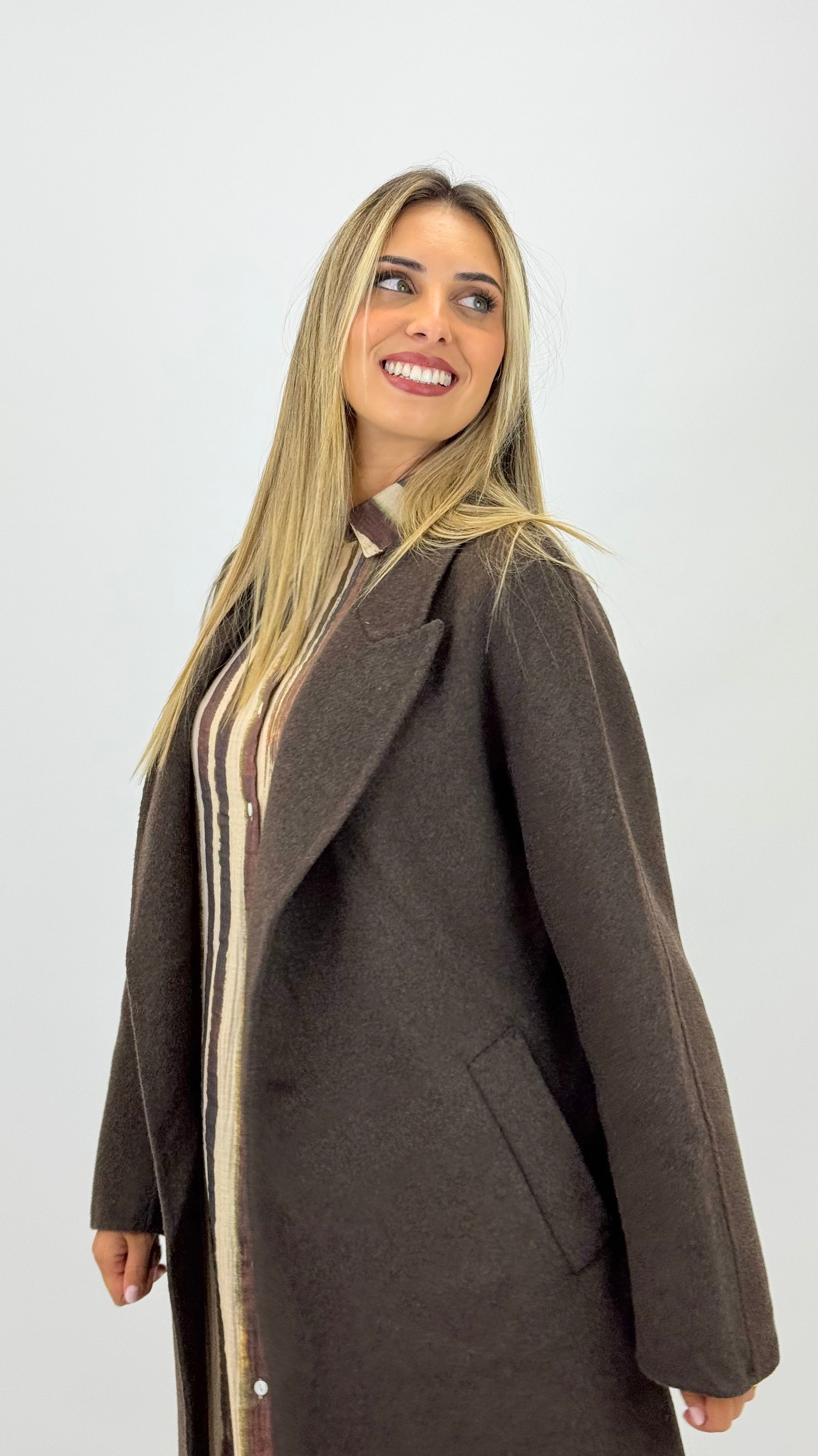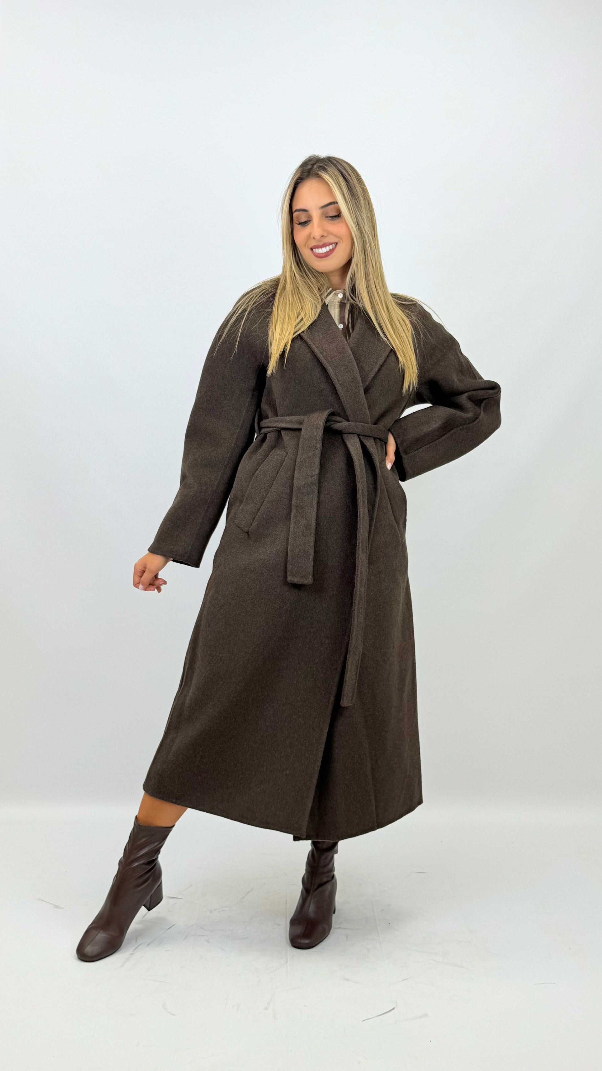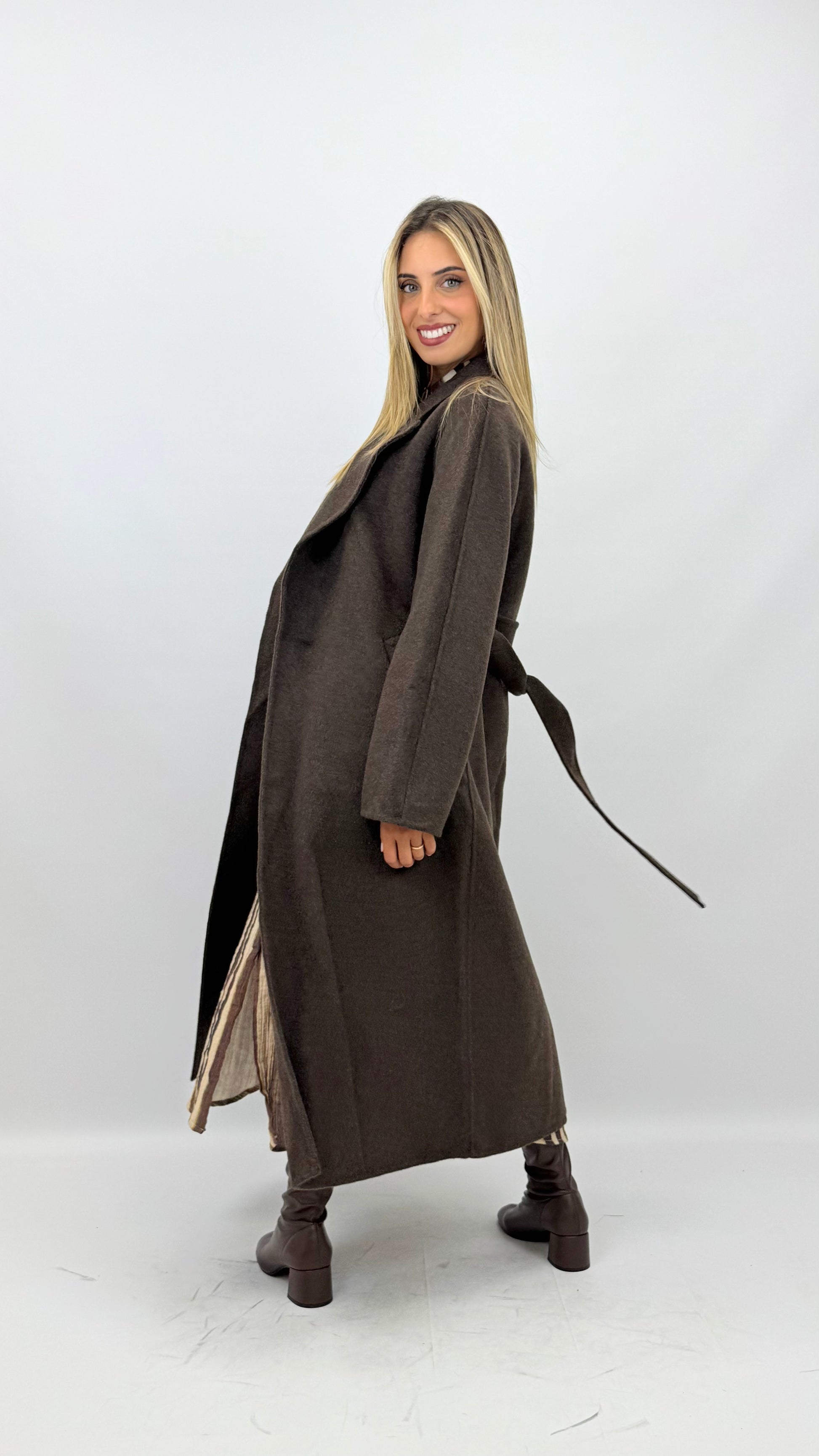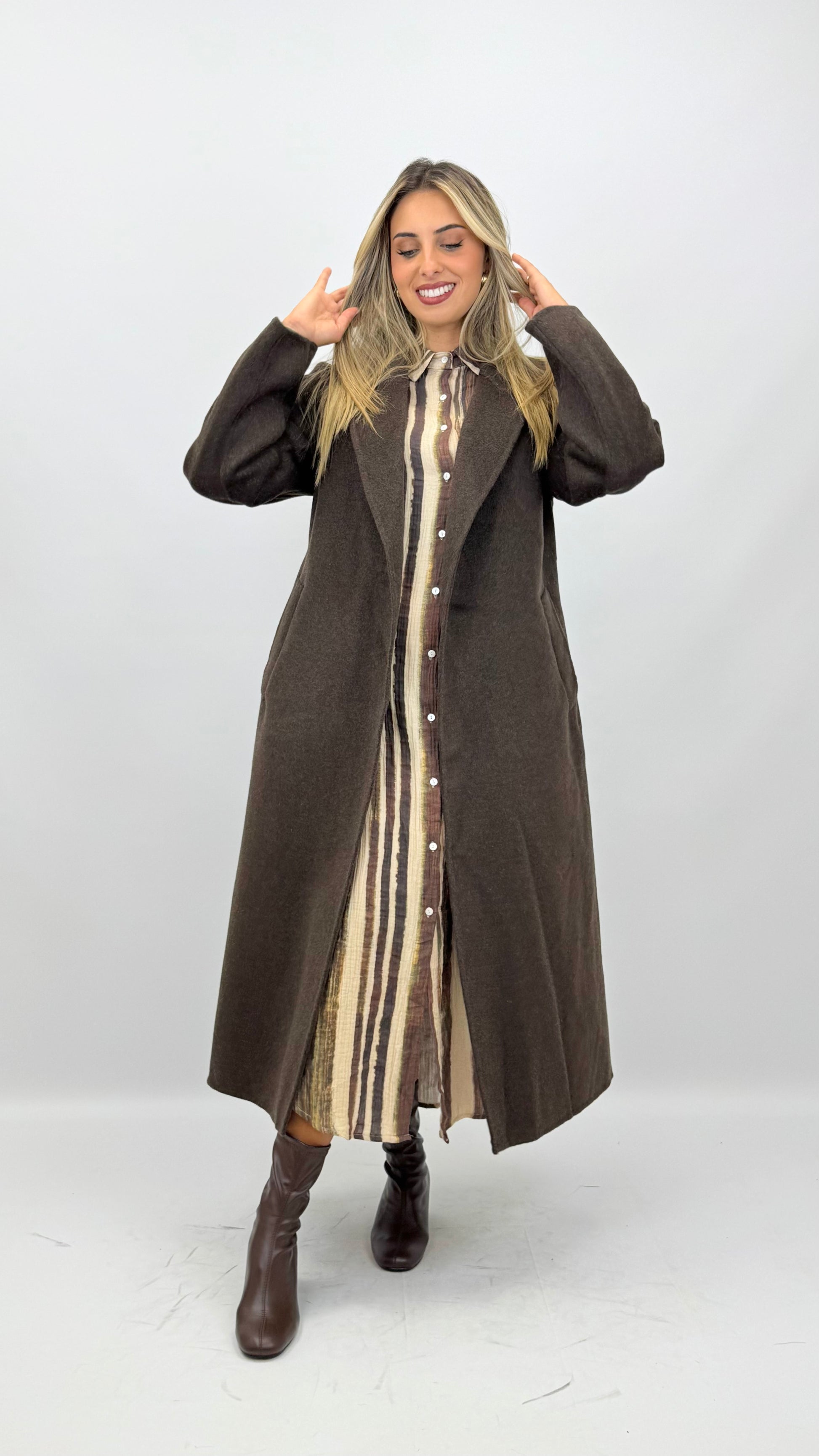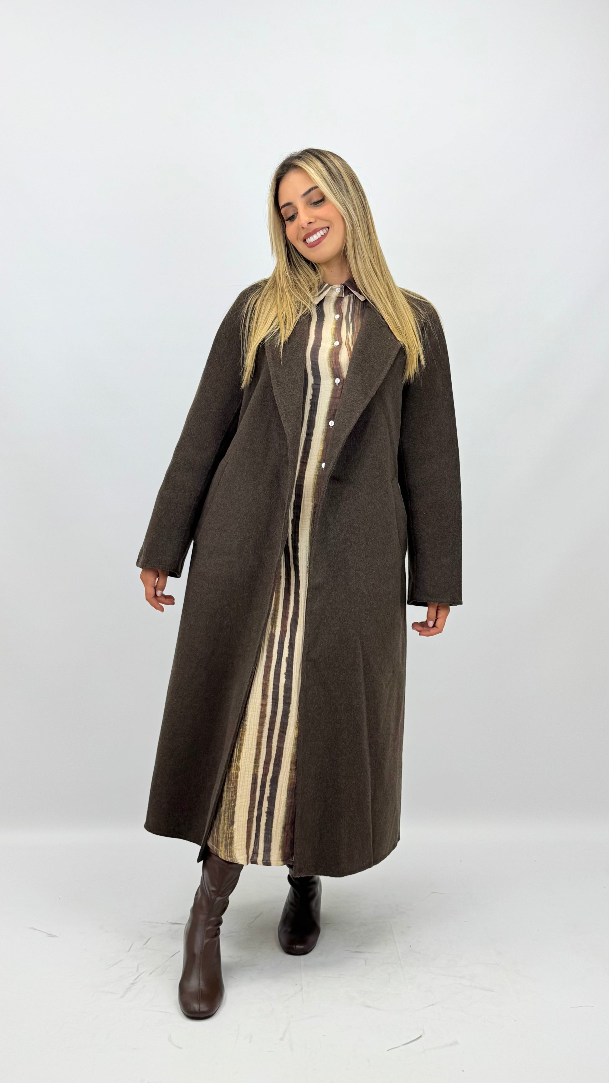 Sobretudo de fazenda, maioritariamente em lã, quente e confortável, modelo comprido com racha em baixo. Aperta com cinto da própria fazenda. Bolsos nas laterais.