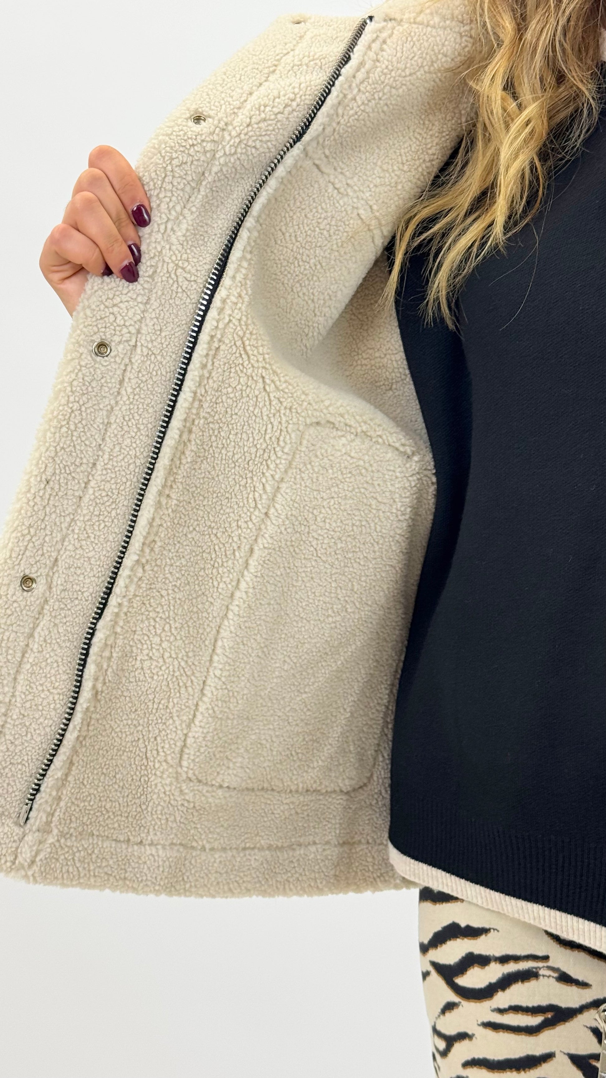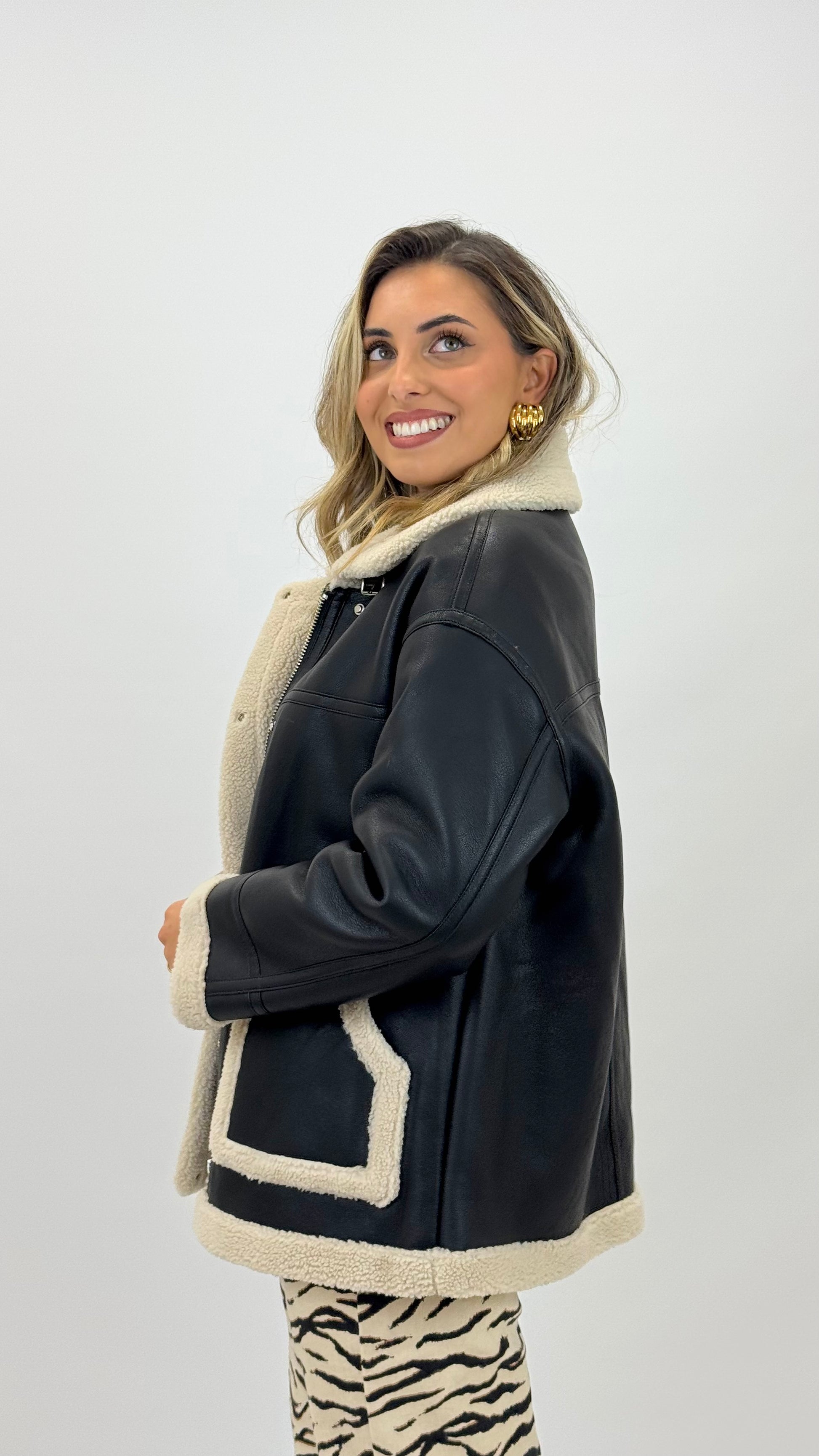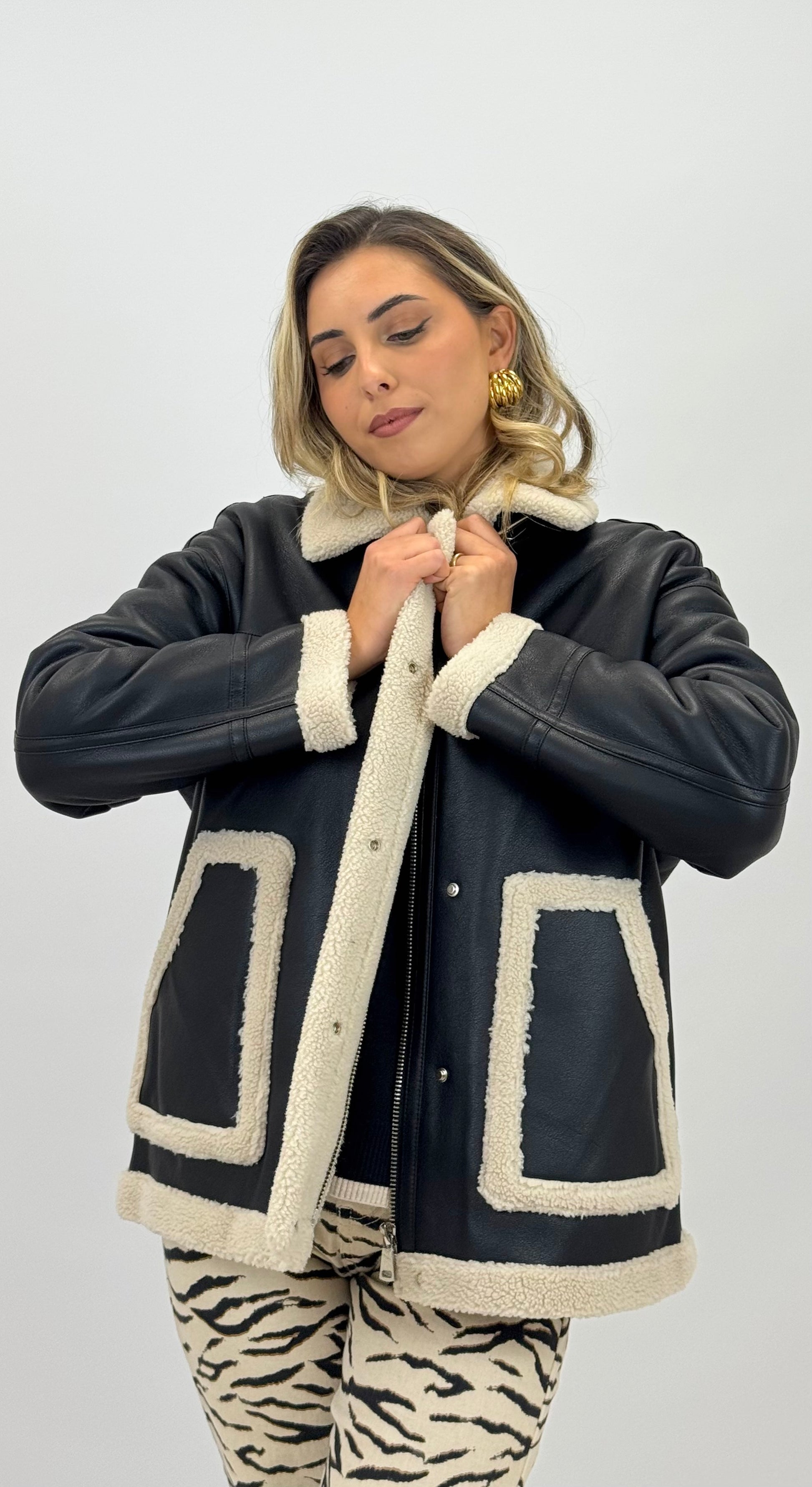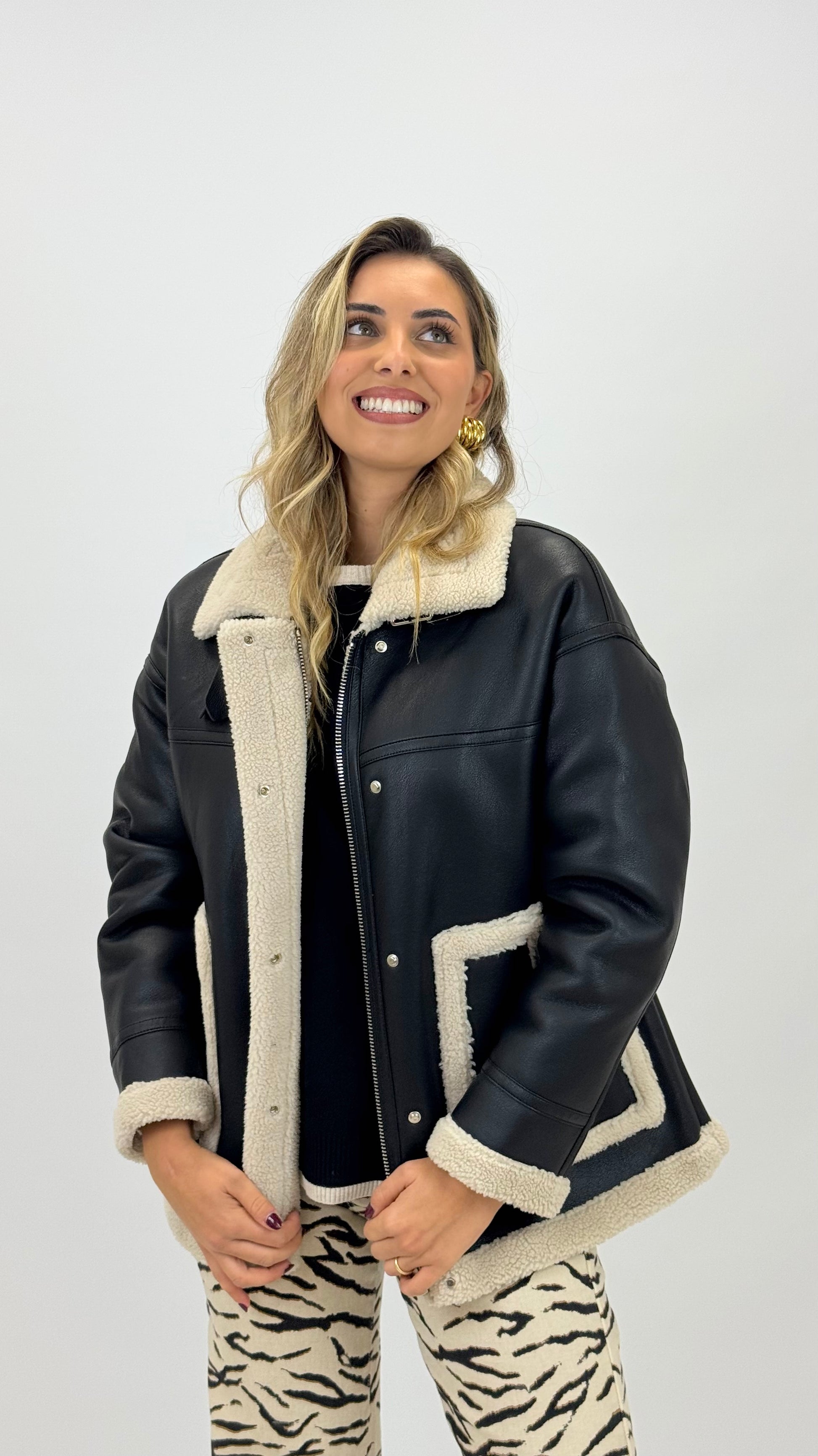 Casaco/blusão estilo eco-pele preto todo forrado a carneirinho pérola. Aperta com fecho de correr na parte da frente. Detalhes de costuras no mesmo pelinho.