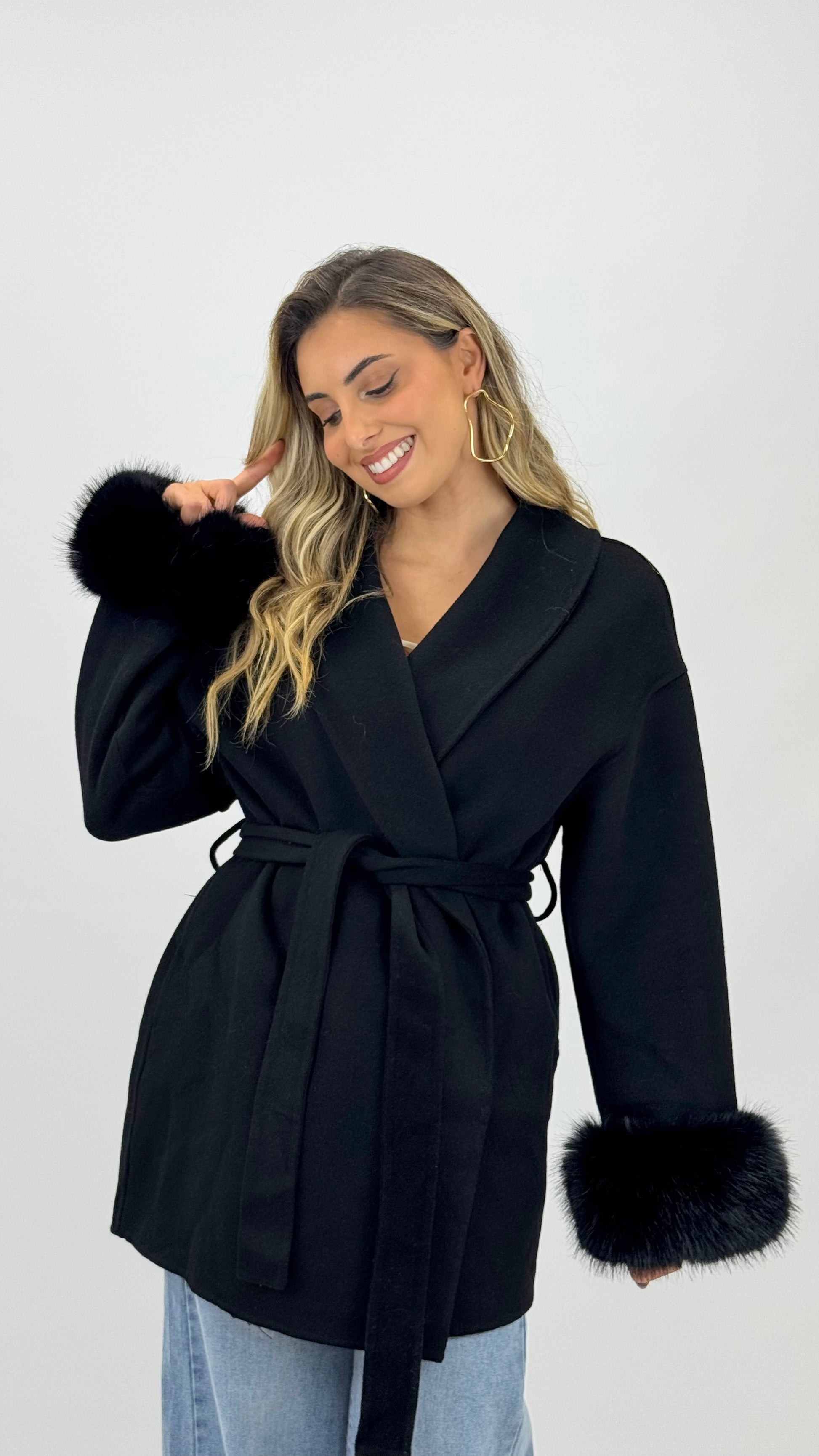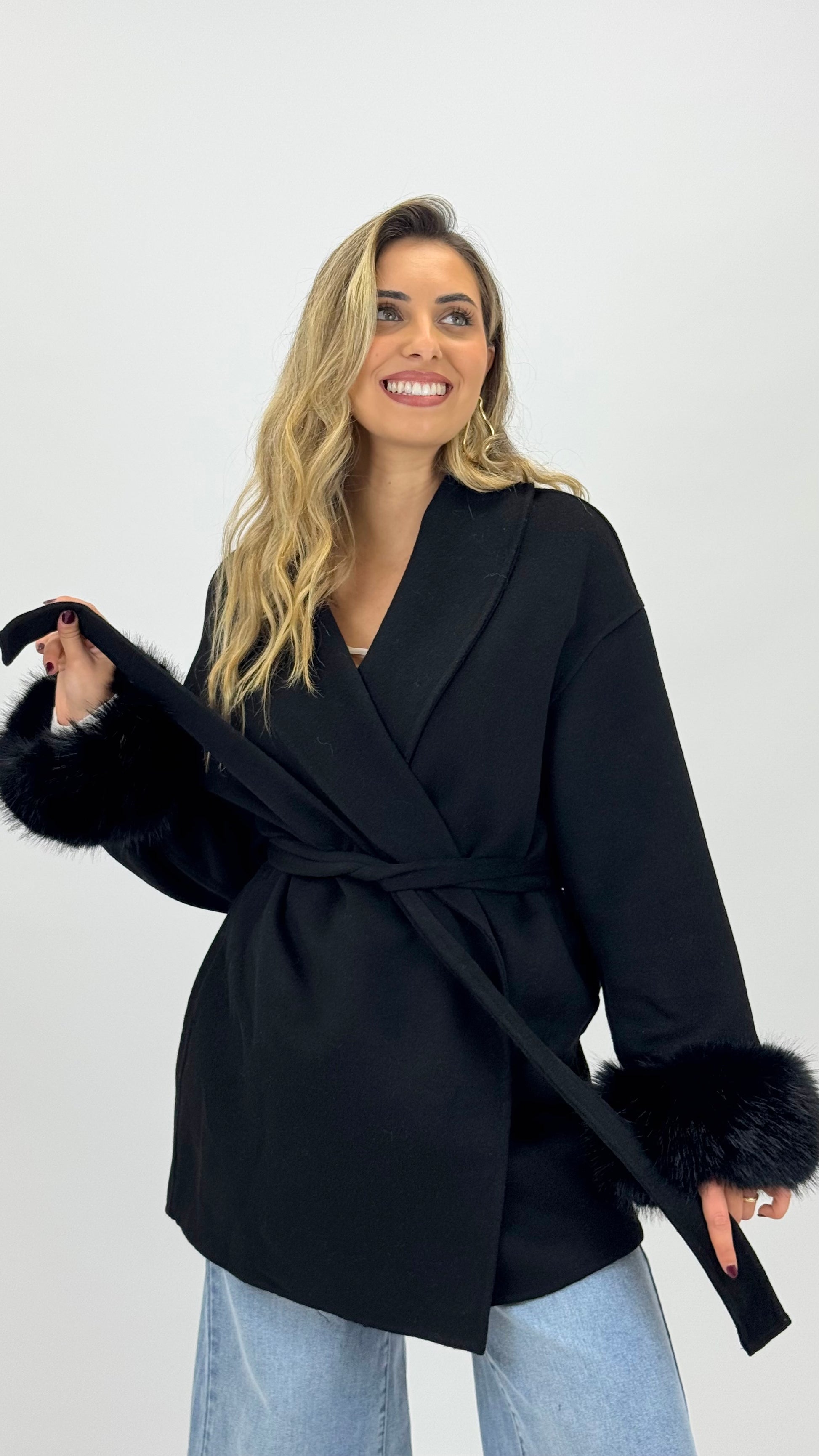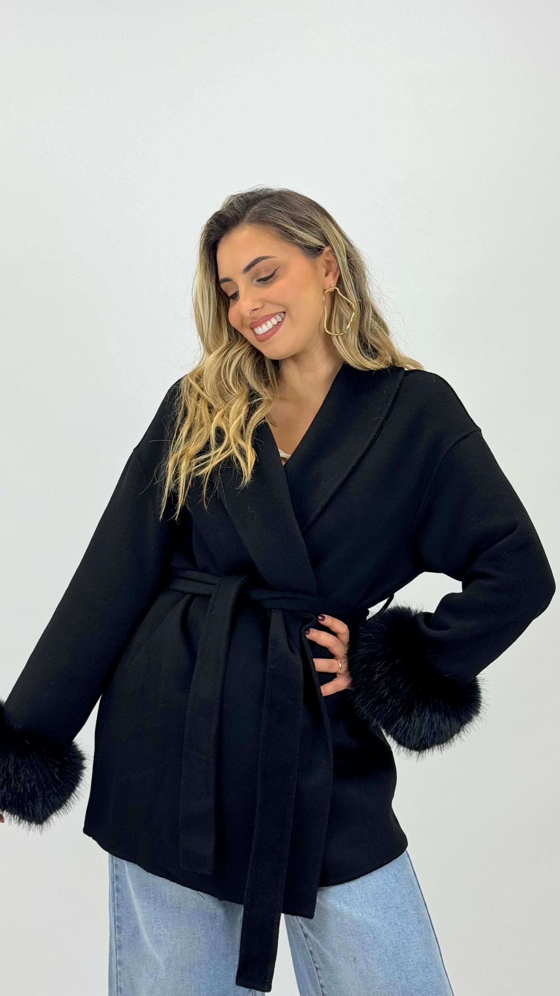 Casaco em fazenda preto, quente e macia. Aperta com cinto da própria fazenda. Pêlo sintético nos punhos.
