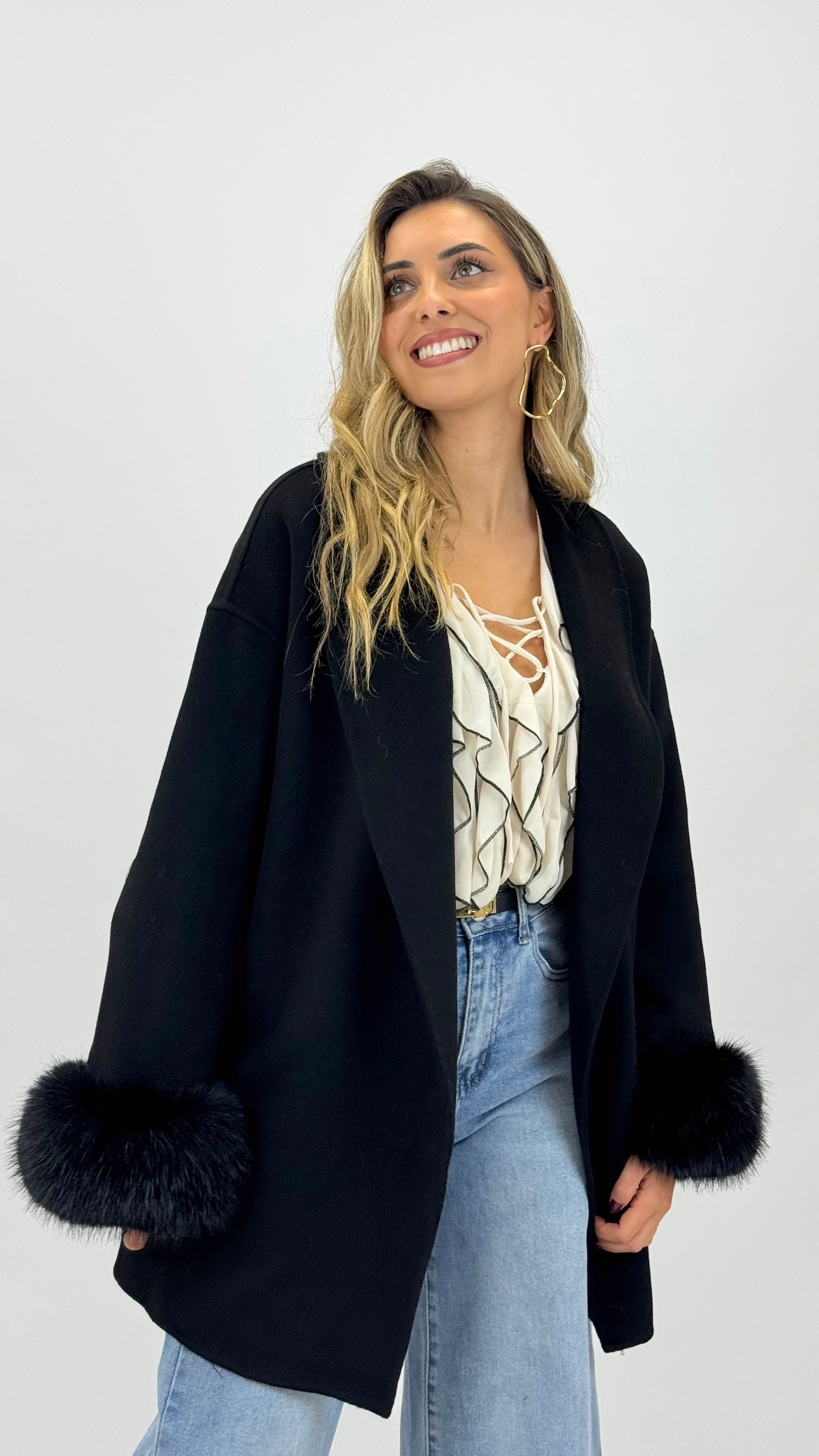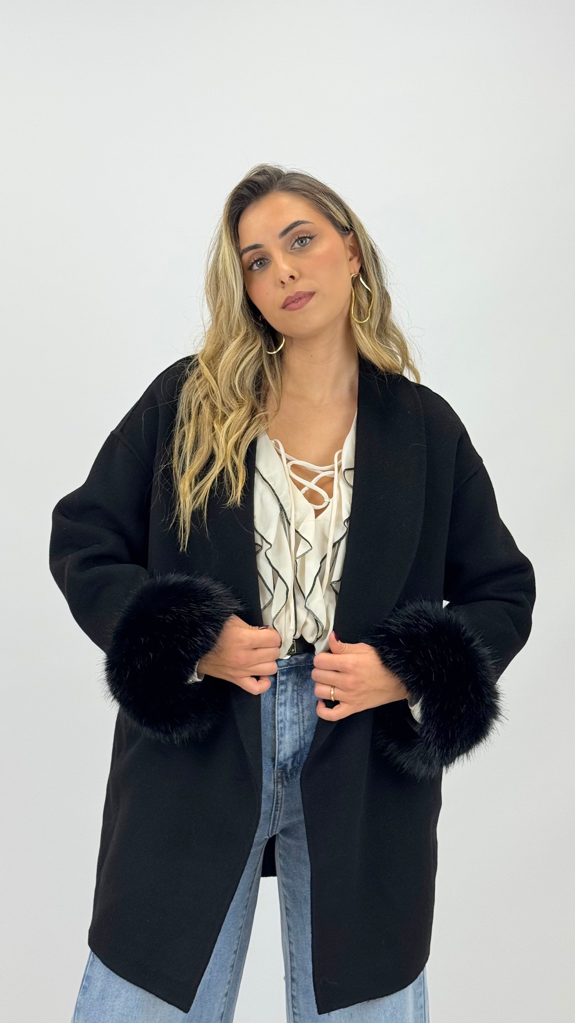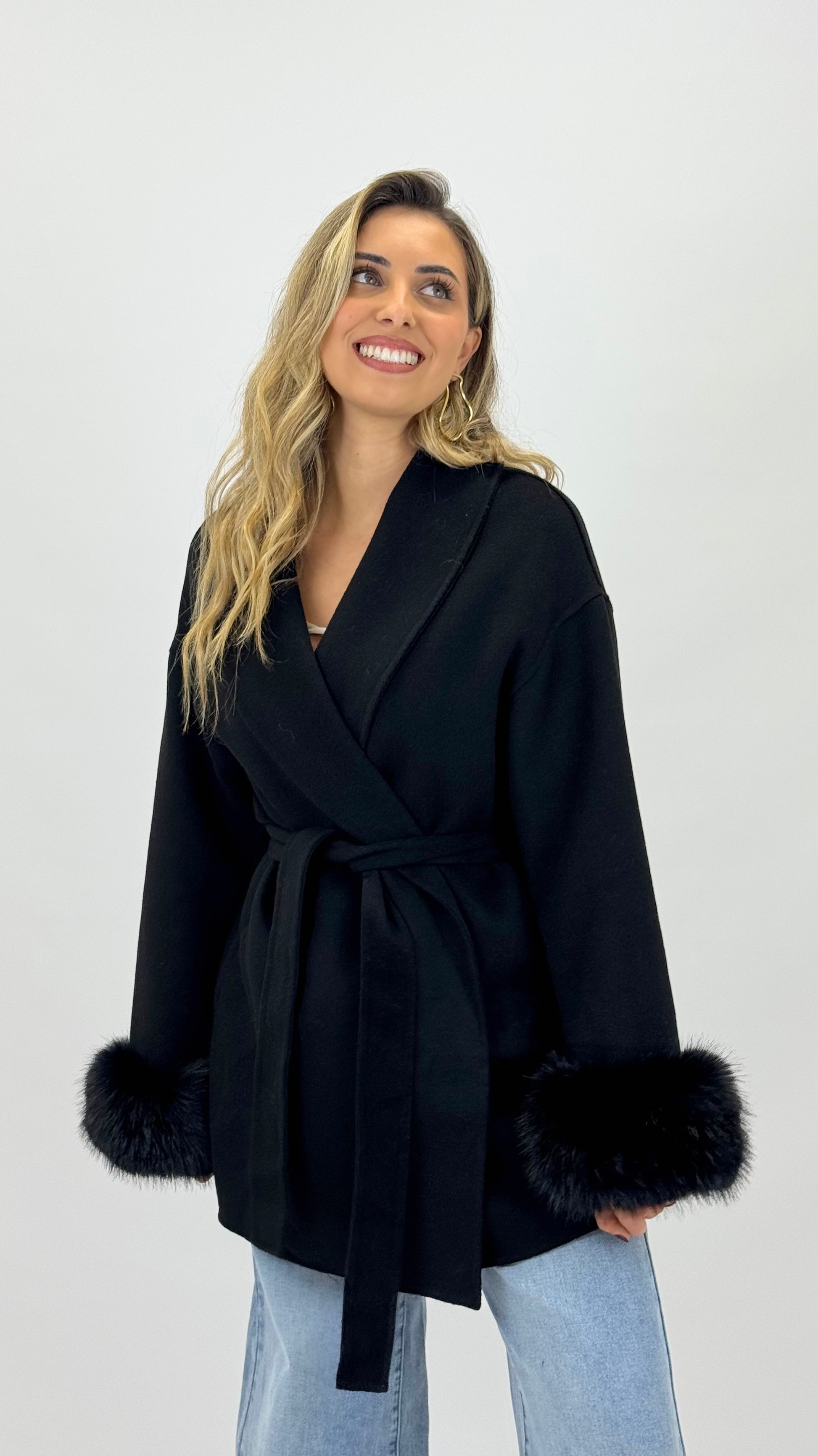 Casaco em fazenda preto, quente e macia. Aperta com cinto da própria fazenda. Pêlo sintético nos punhos.