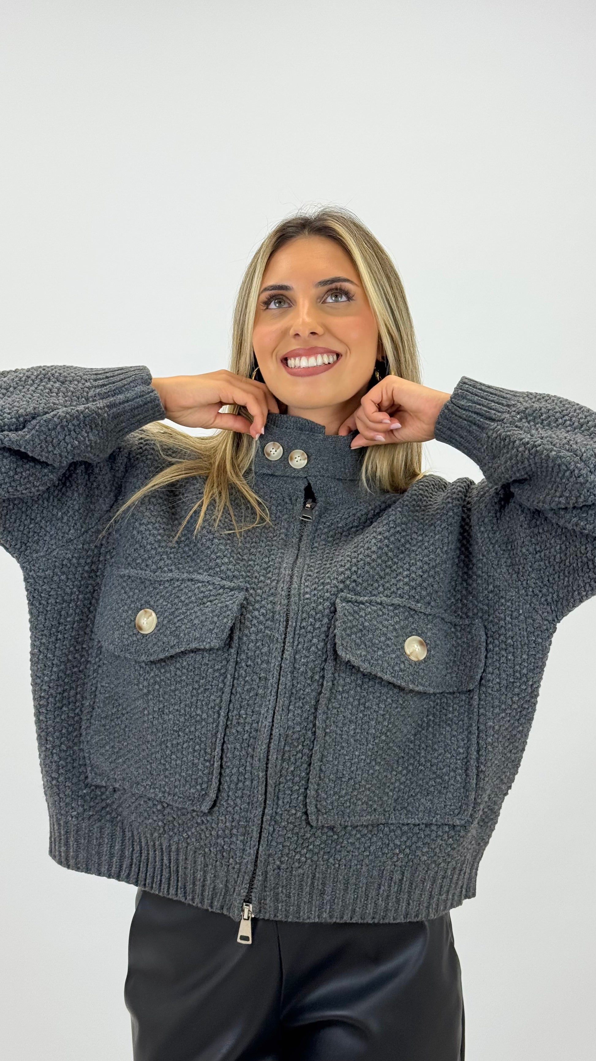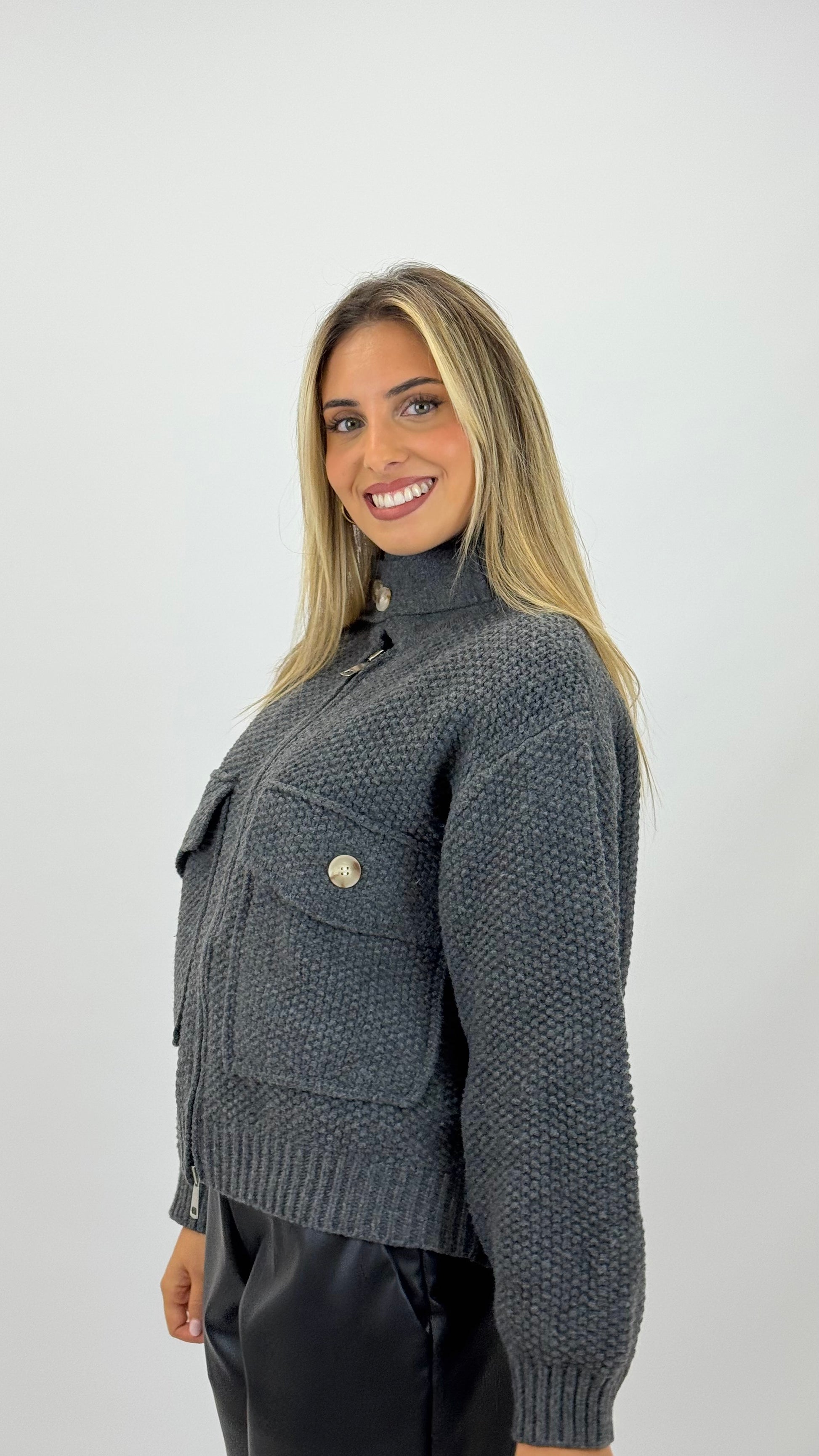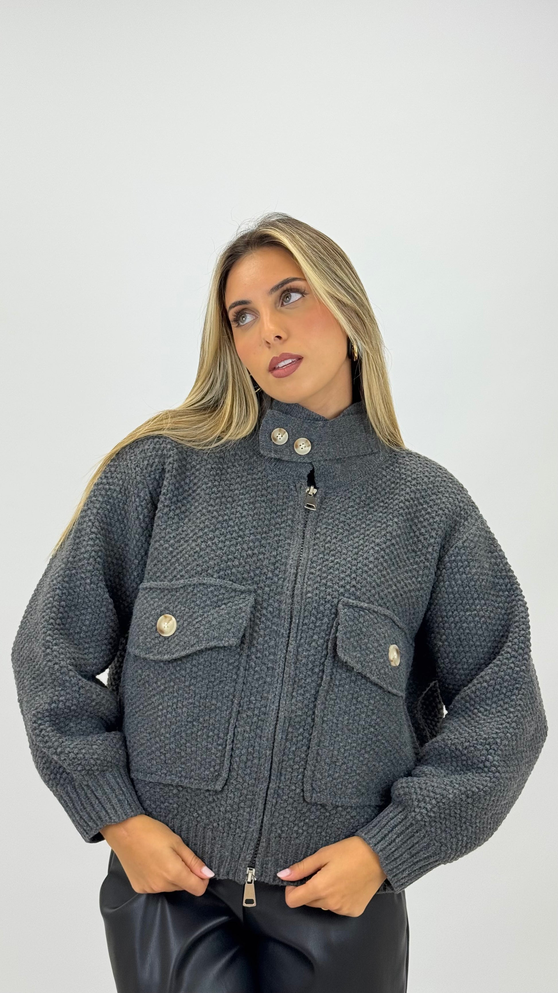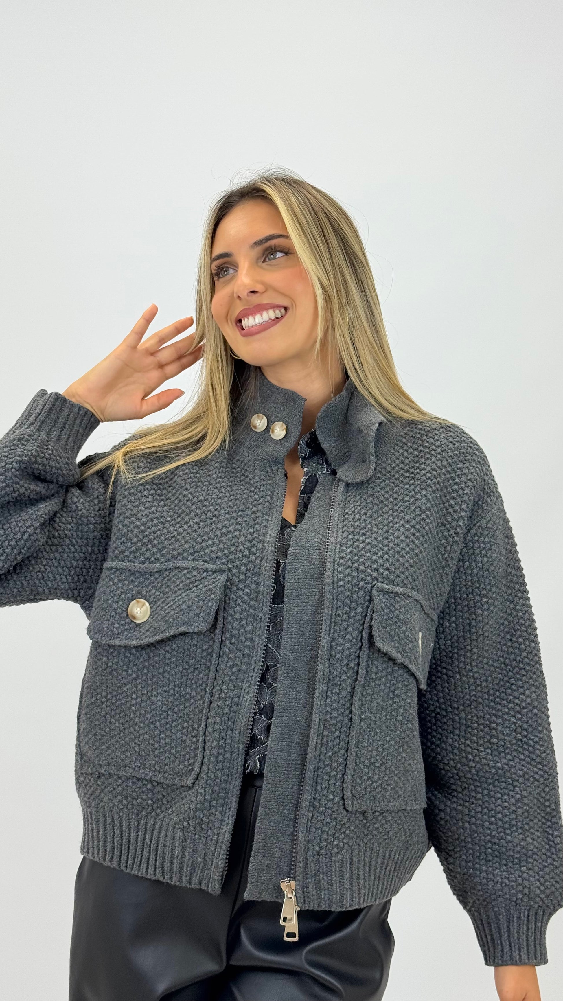 Casaco malha grosso em tricô fechado. Aperta com fecho de correr na parte da frente e botões de massa na gola.