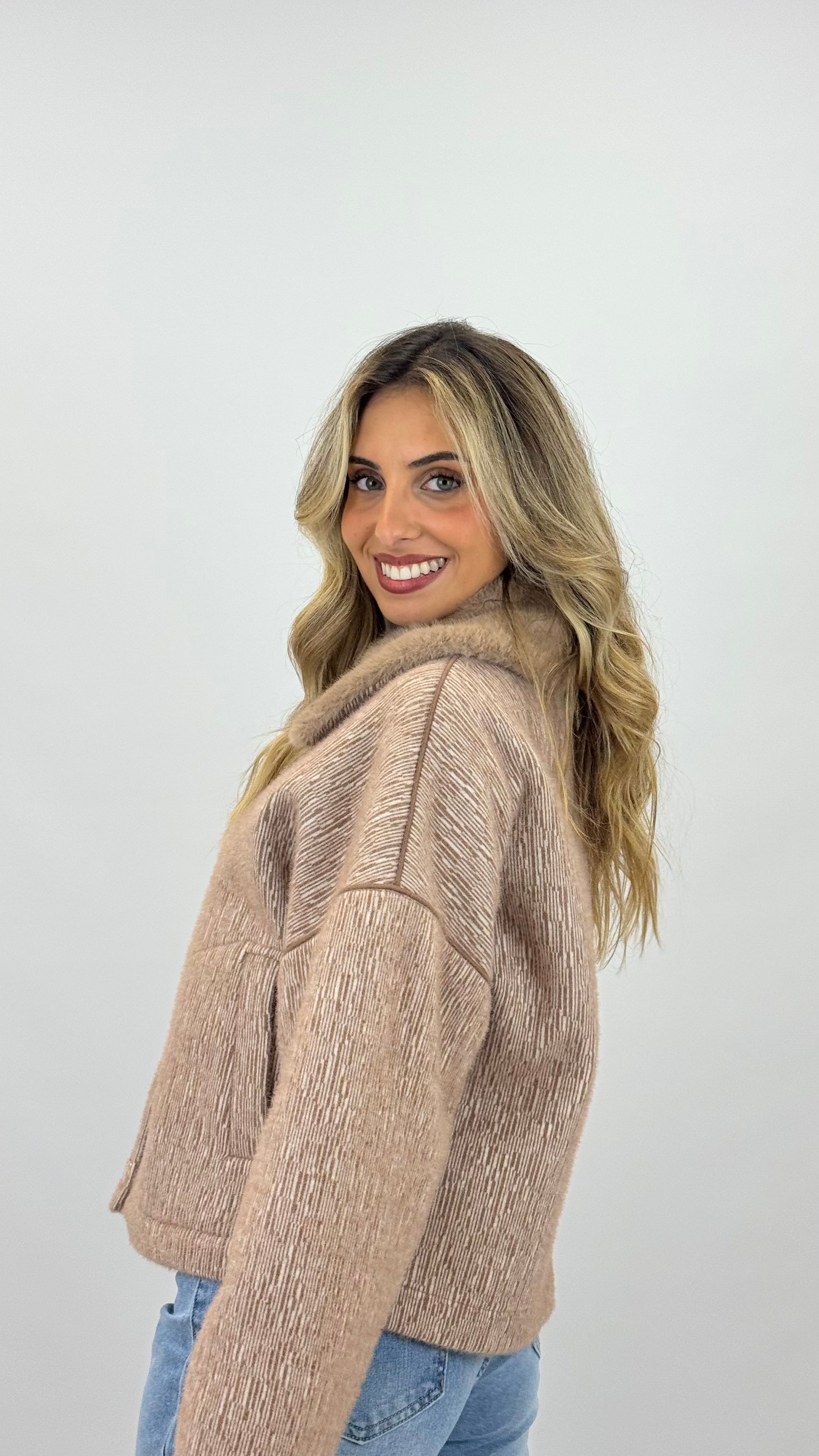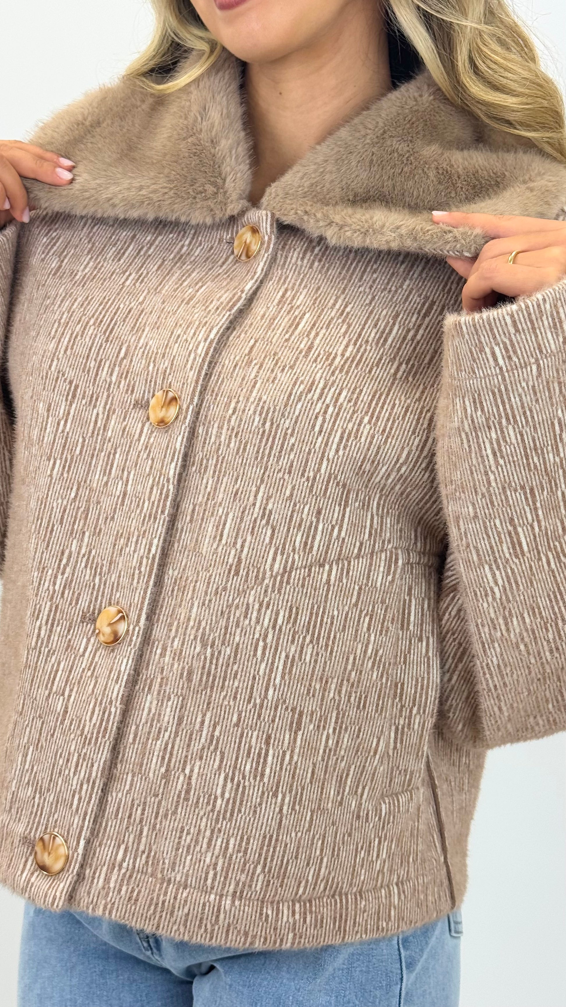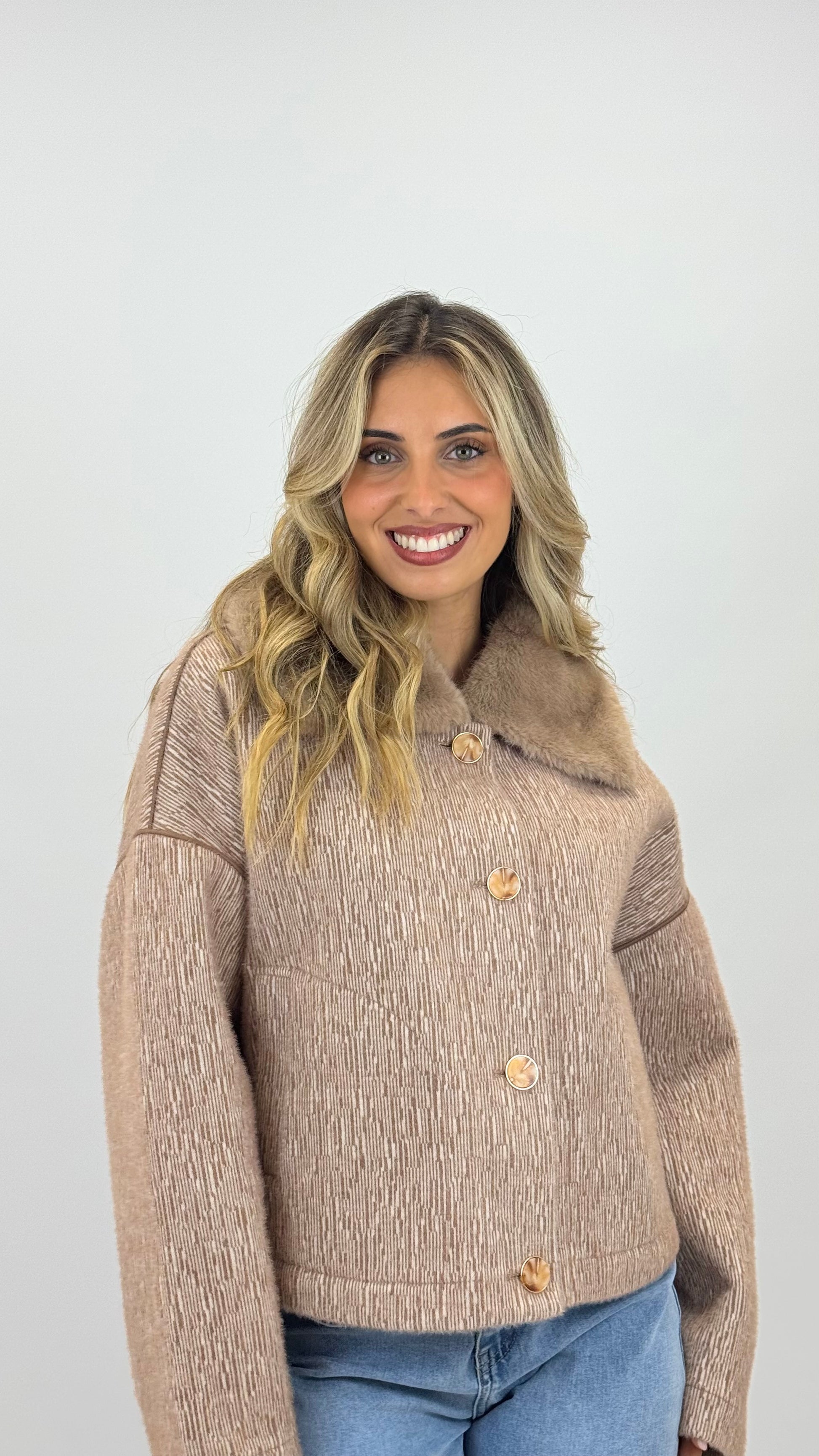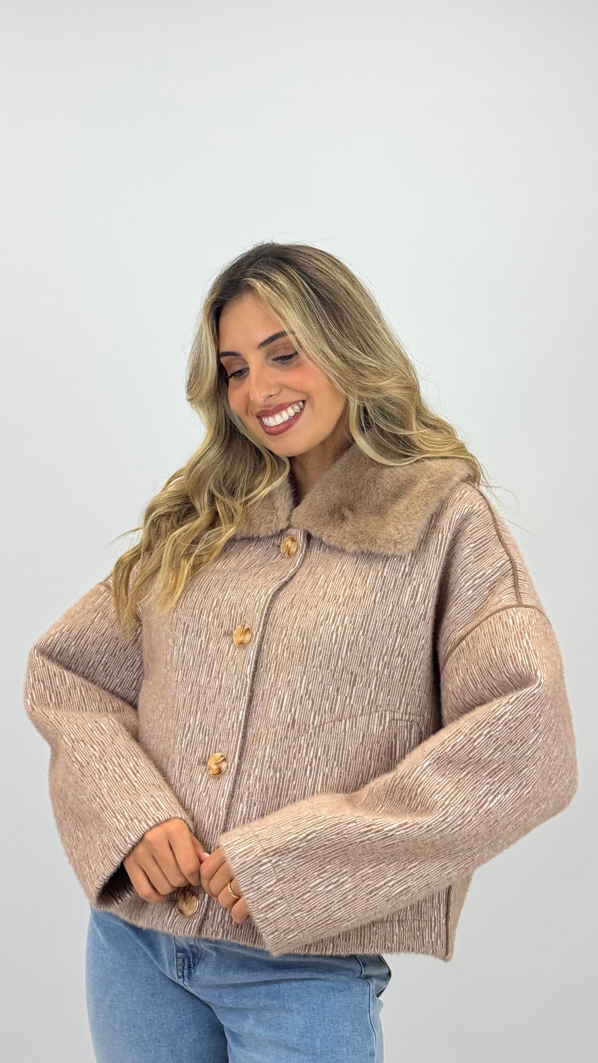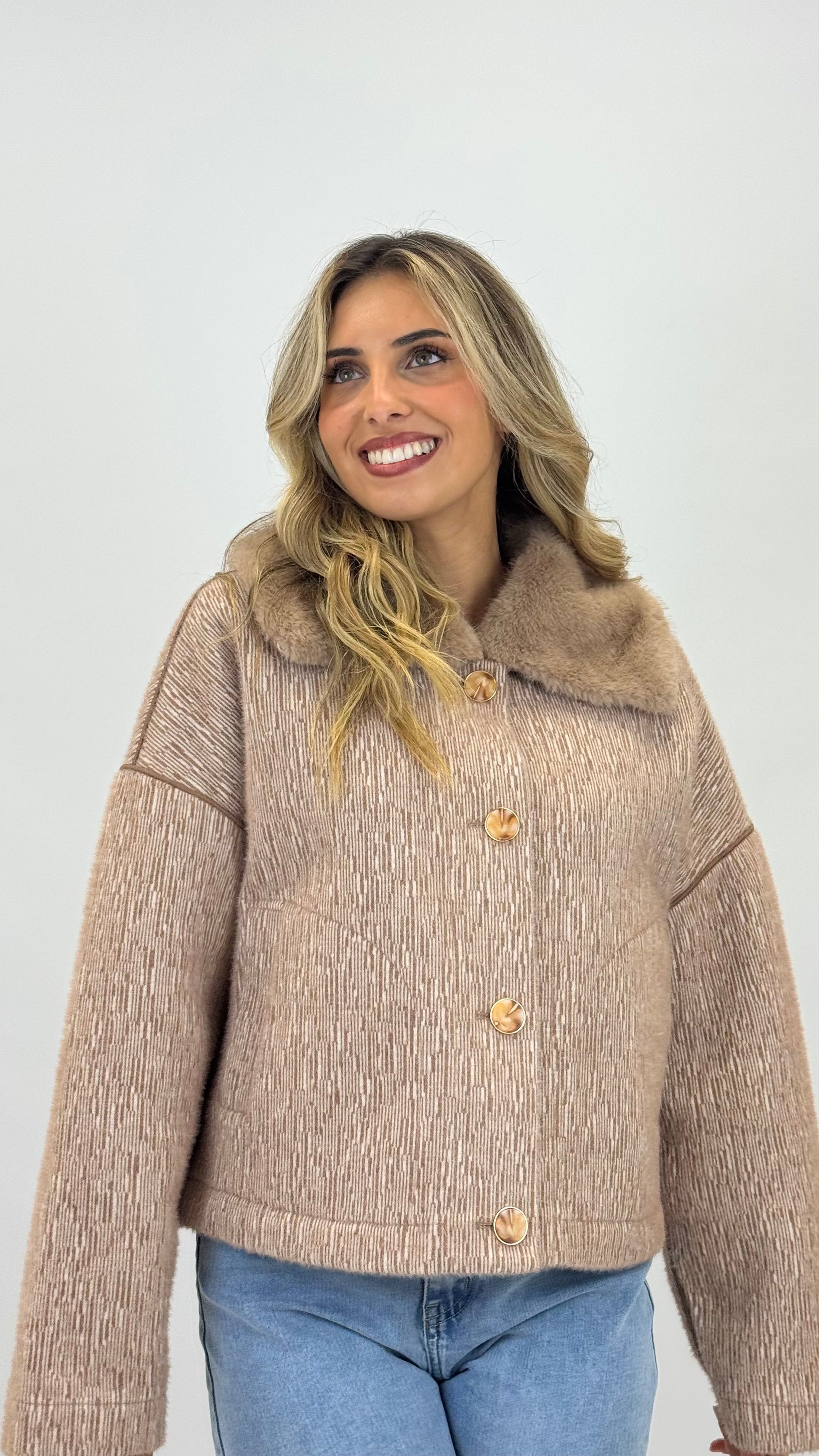 Casaco estilo fazenda compacta com ligeiro "pelinho". Tons de bege e pérola. Aperta com botões na parte da frente. Gola bege em pêlo sintético.
