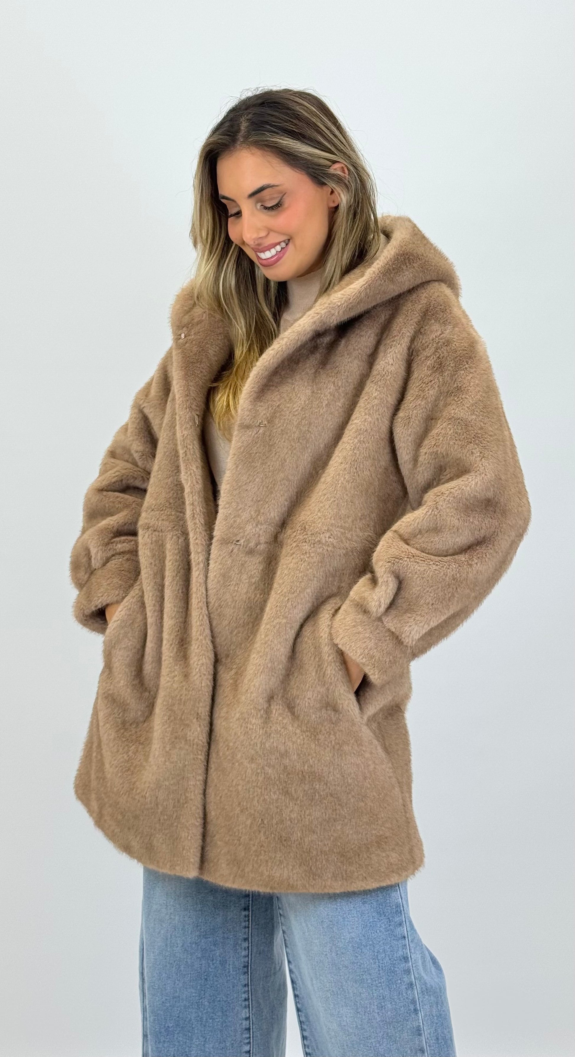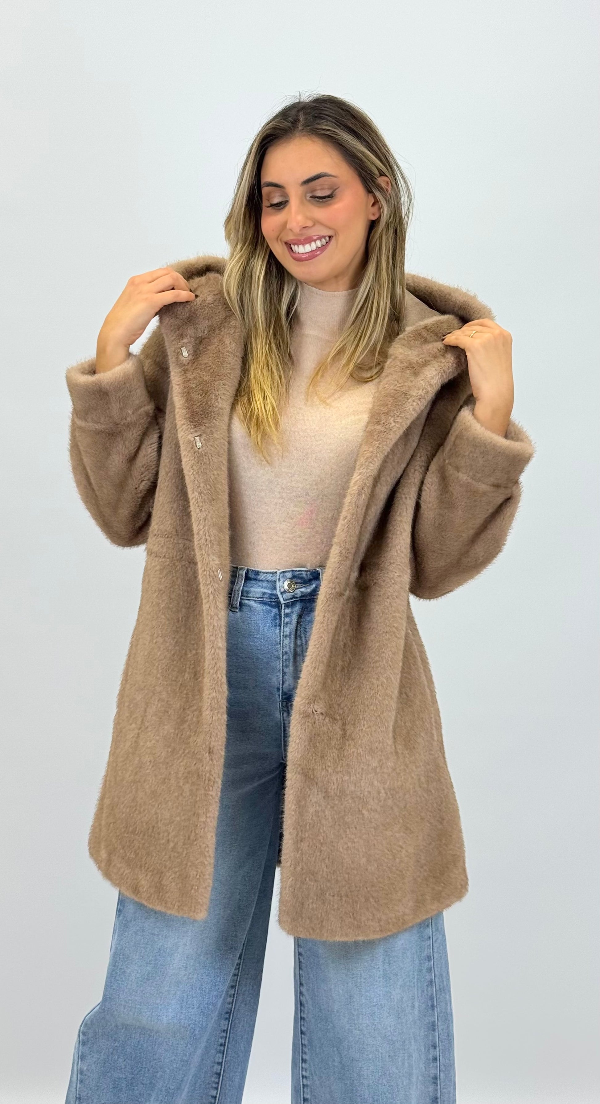 Casaco pêlo sintético 3/4, tom ligeiramente mesclado bege/camel. Contém bolsos nas laterais. Aperta com colchetes na parte da frente. Capuz.