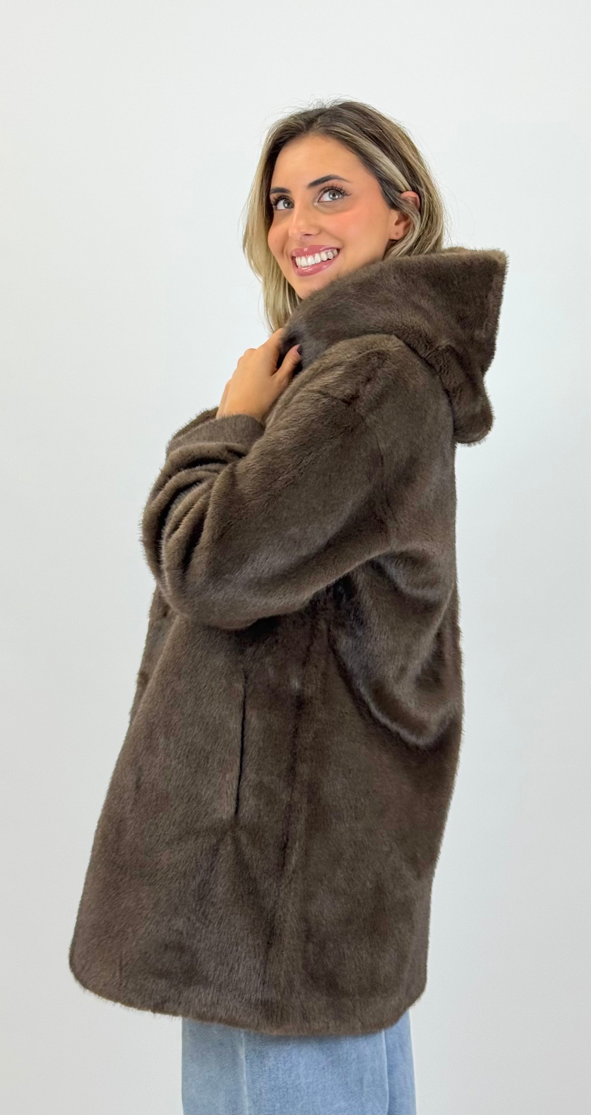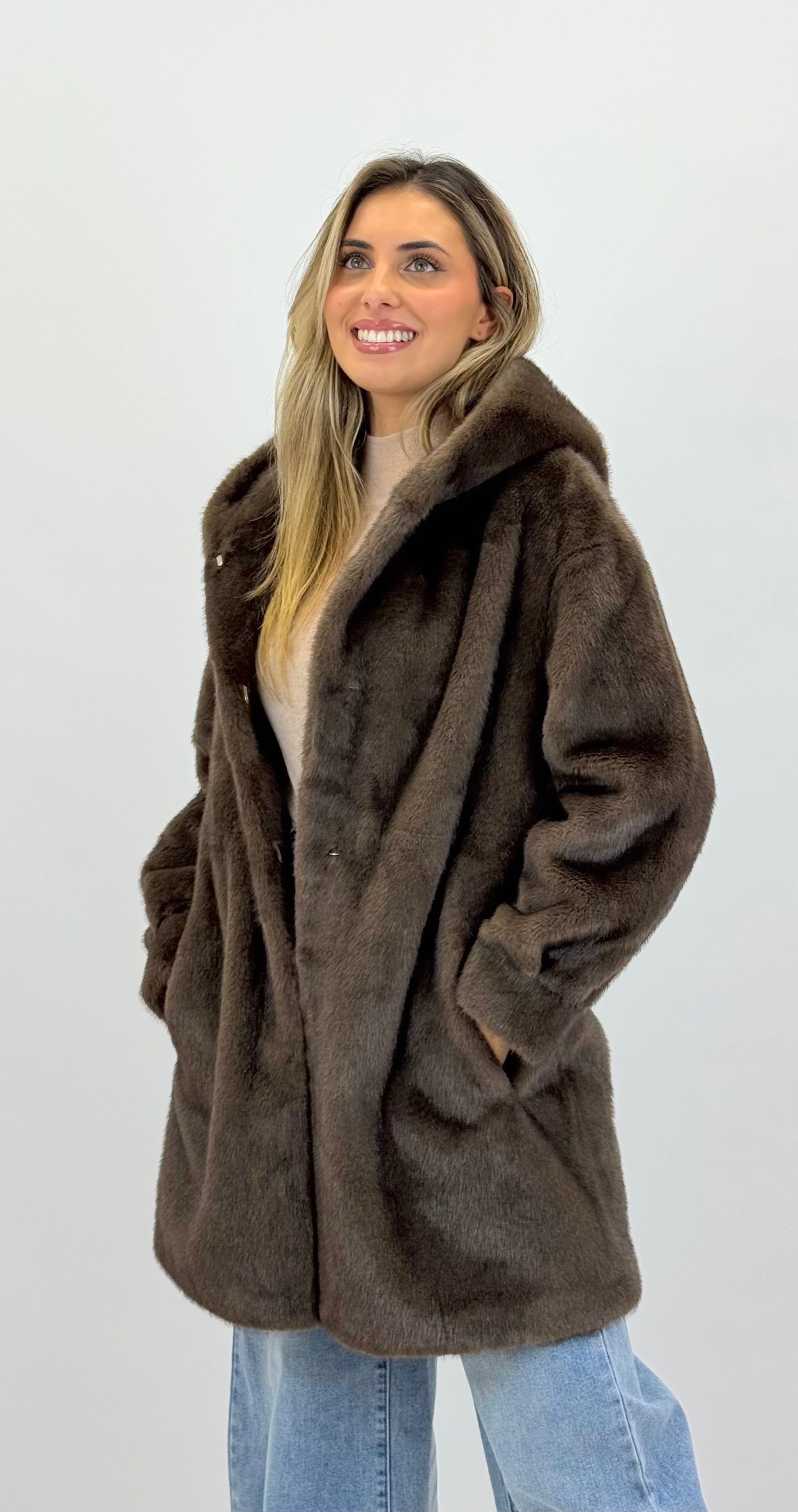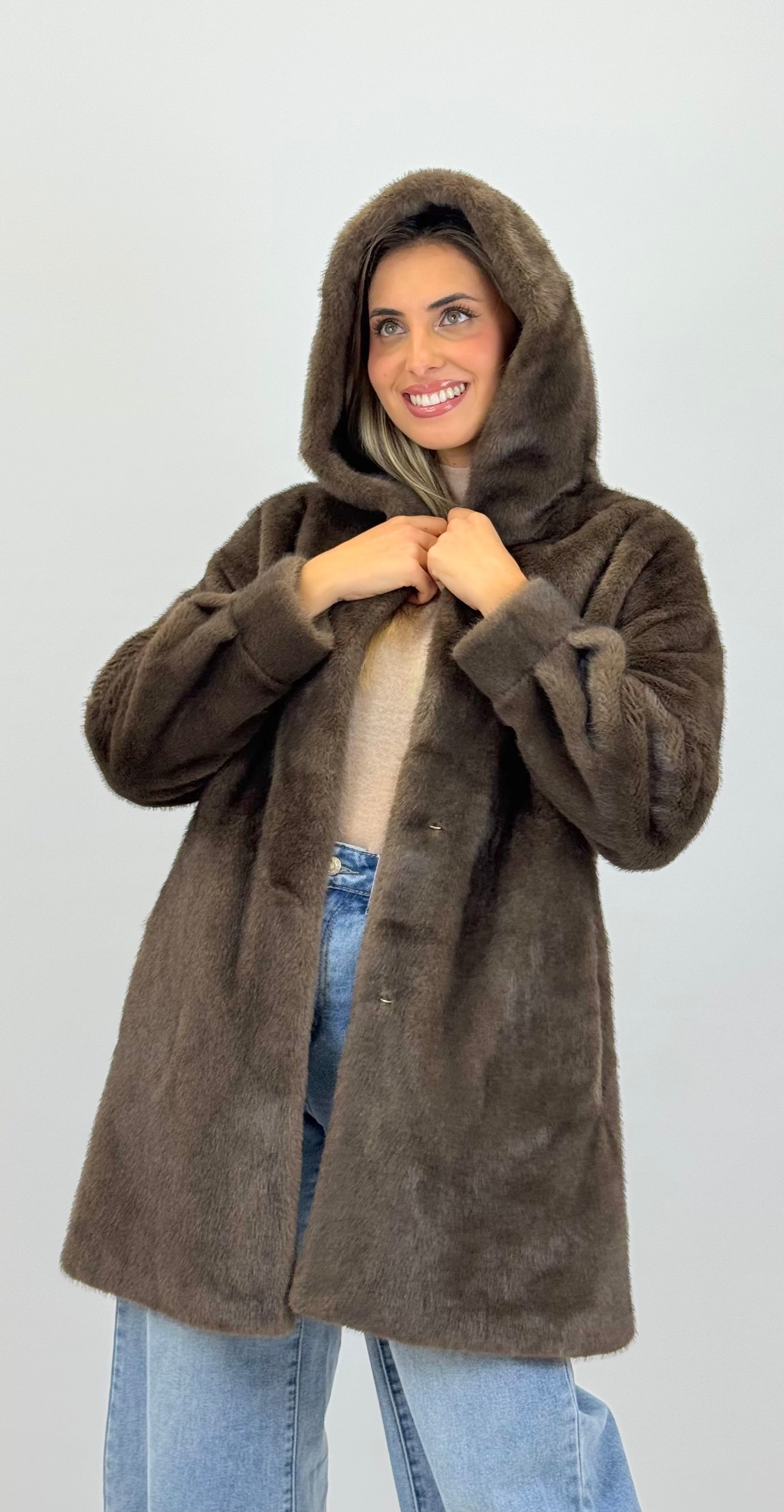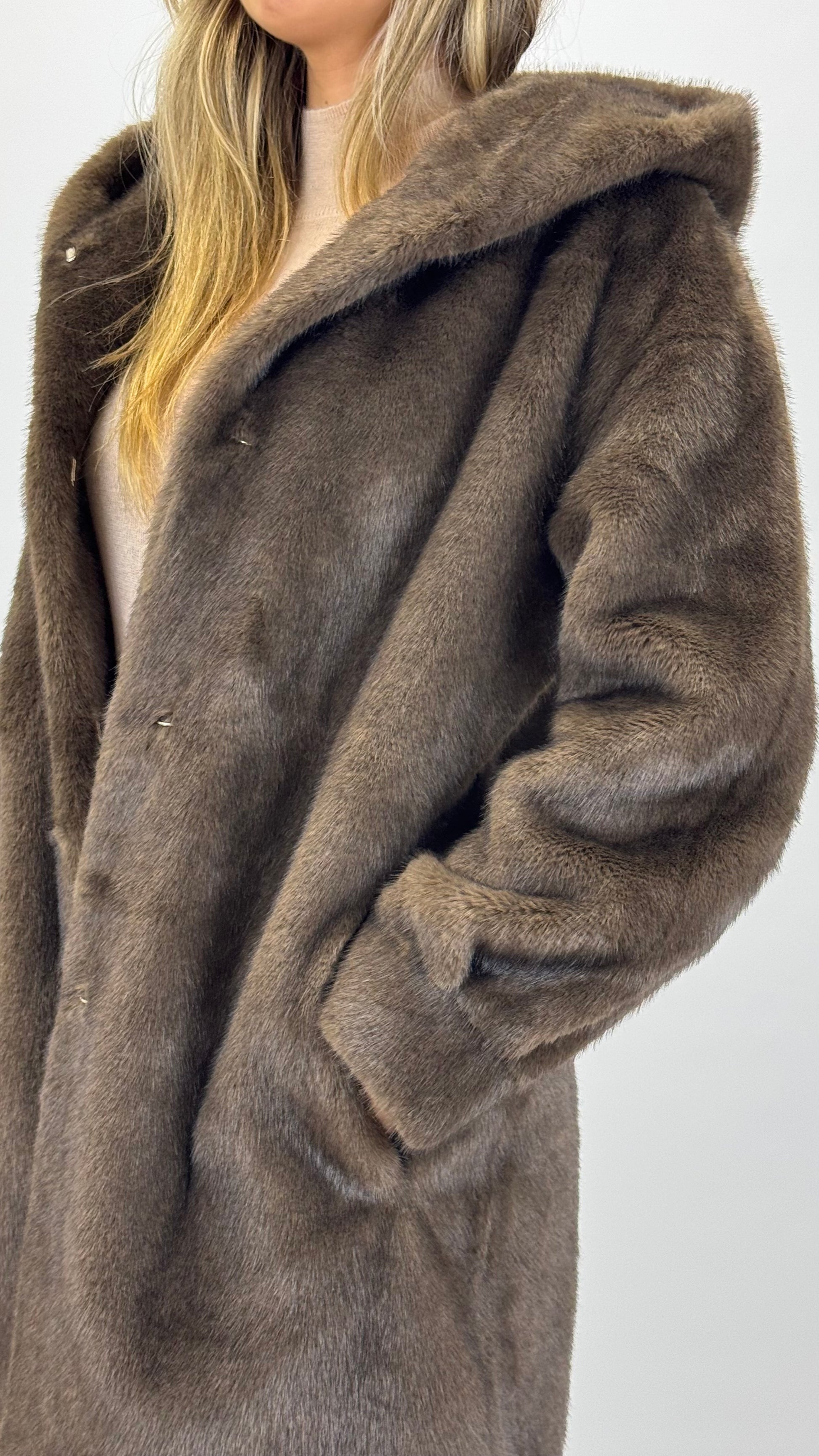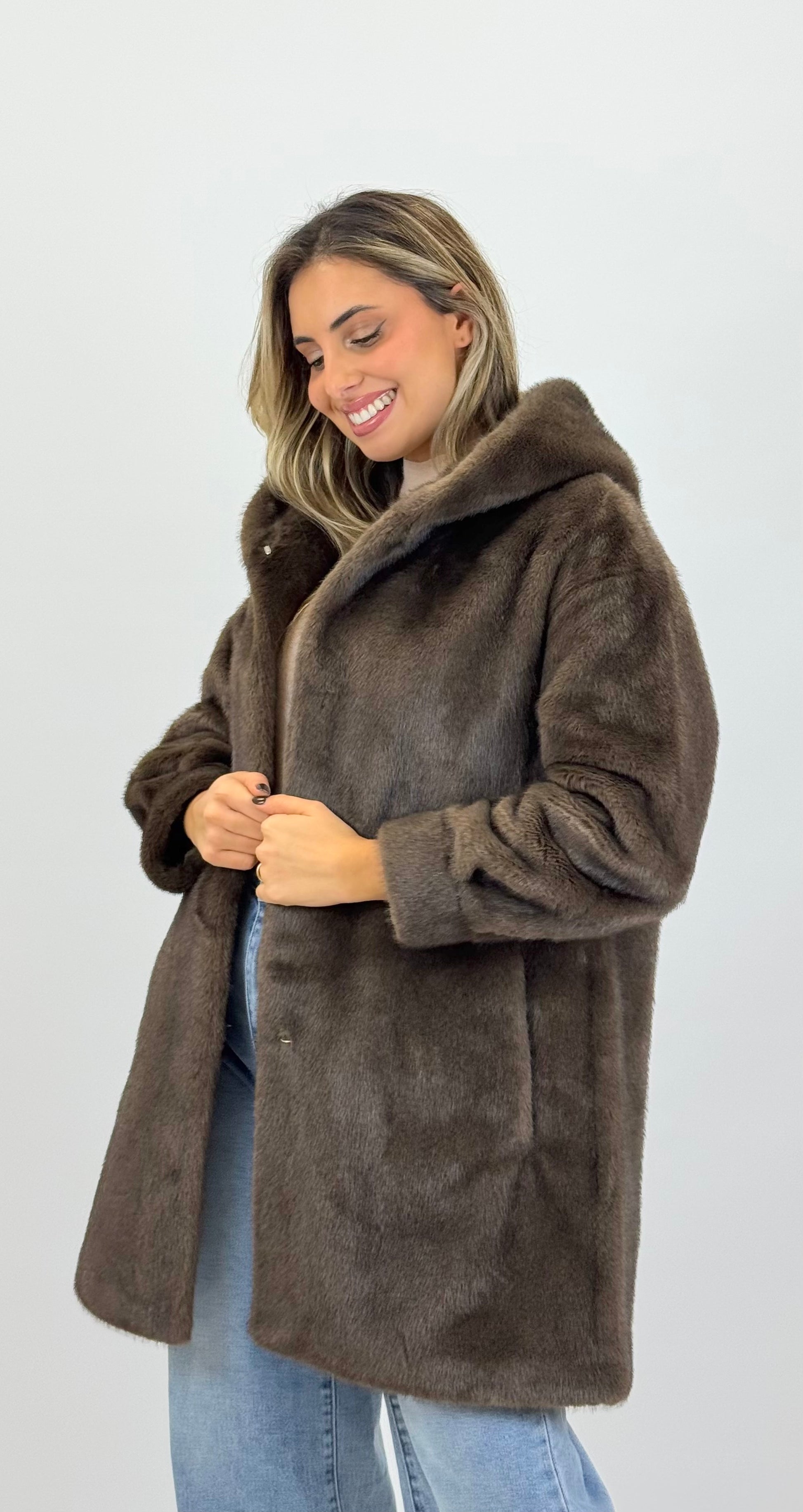 Casaco pêlo sintético 3/4, tom ligeiramente mesclado castanho. Contém bolsos nas laterais. Aperta com colchetes na parte da frente. Capuz.