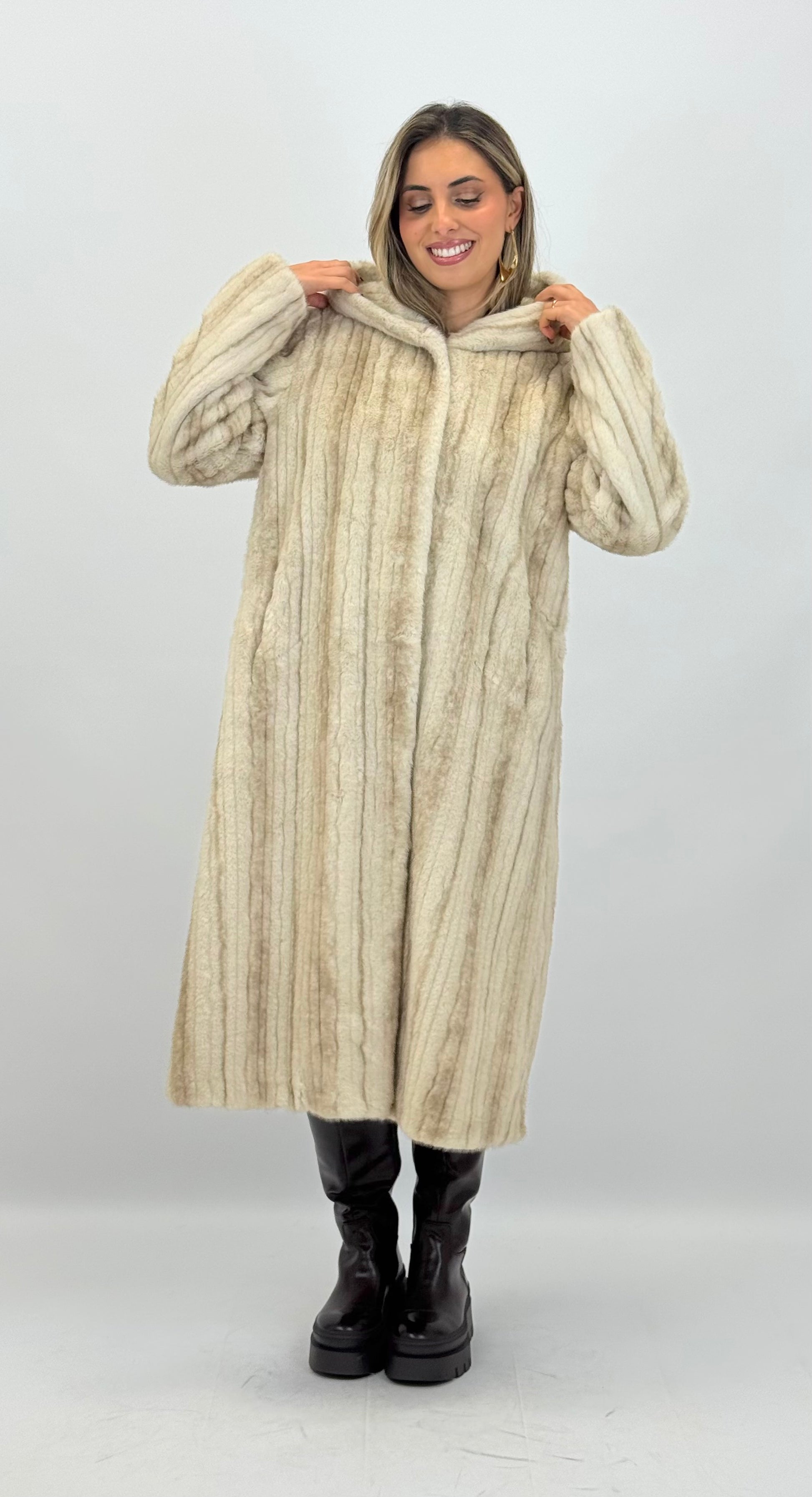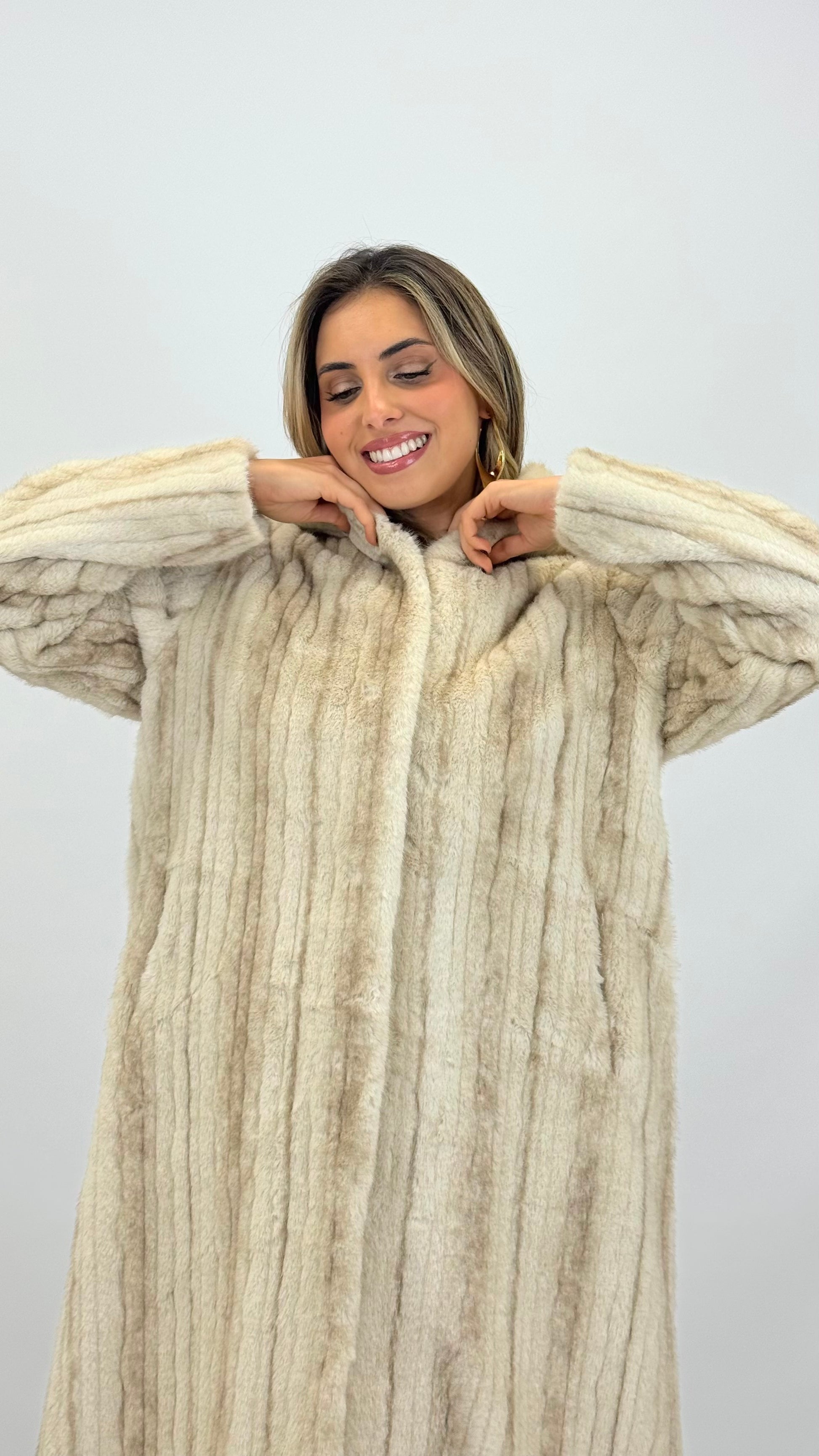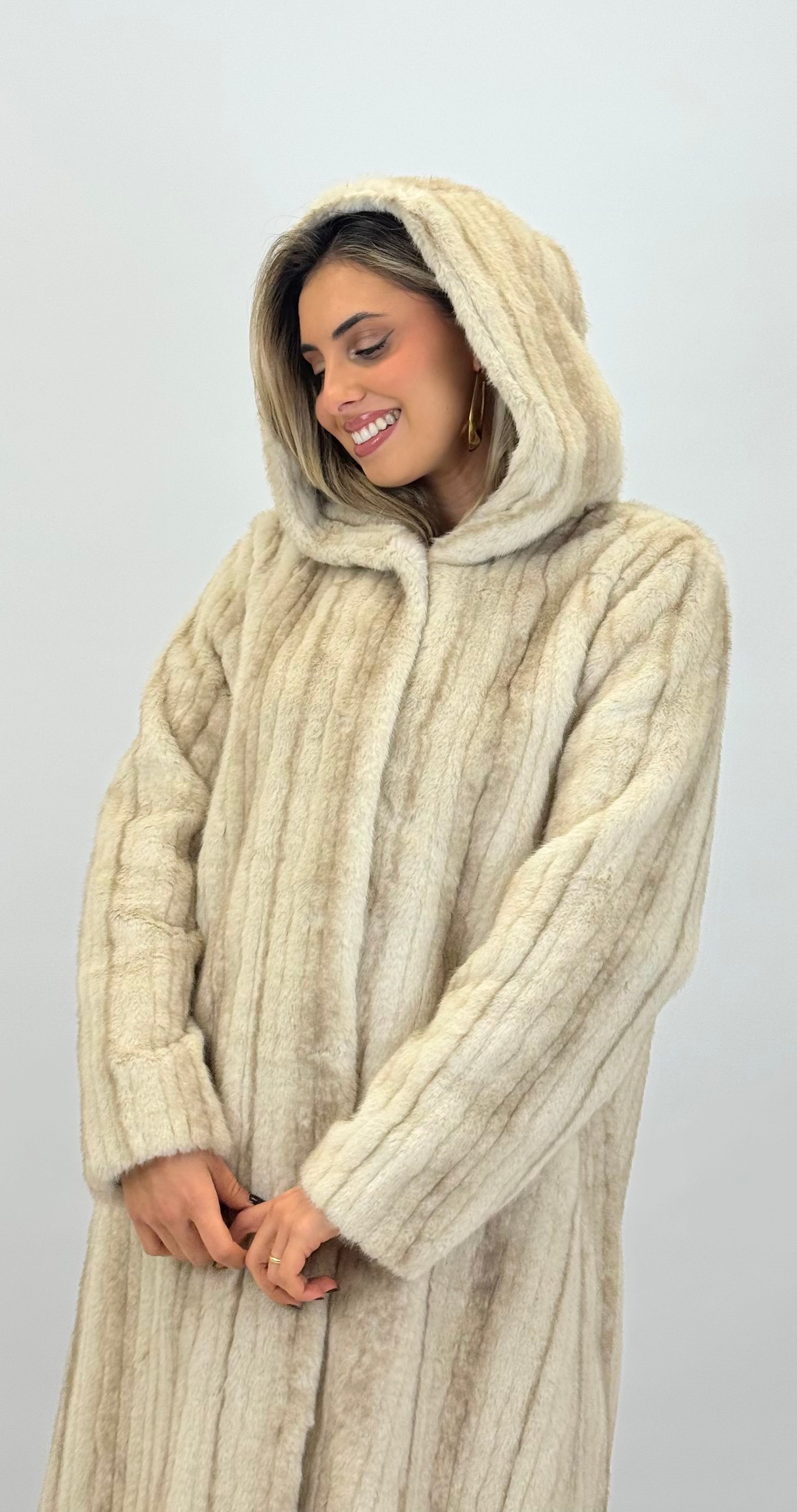 Casaco comprido em pêlo sintético ligeiramente matizado com leve risca. Aperta com colchetes na parte da frente. Contém capuz e bolsos nas laterais.