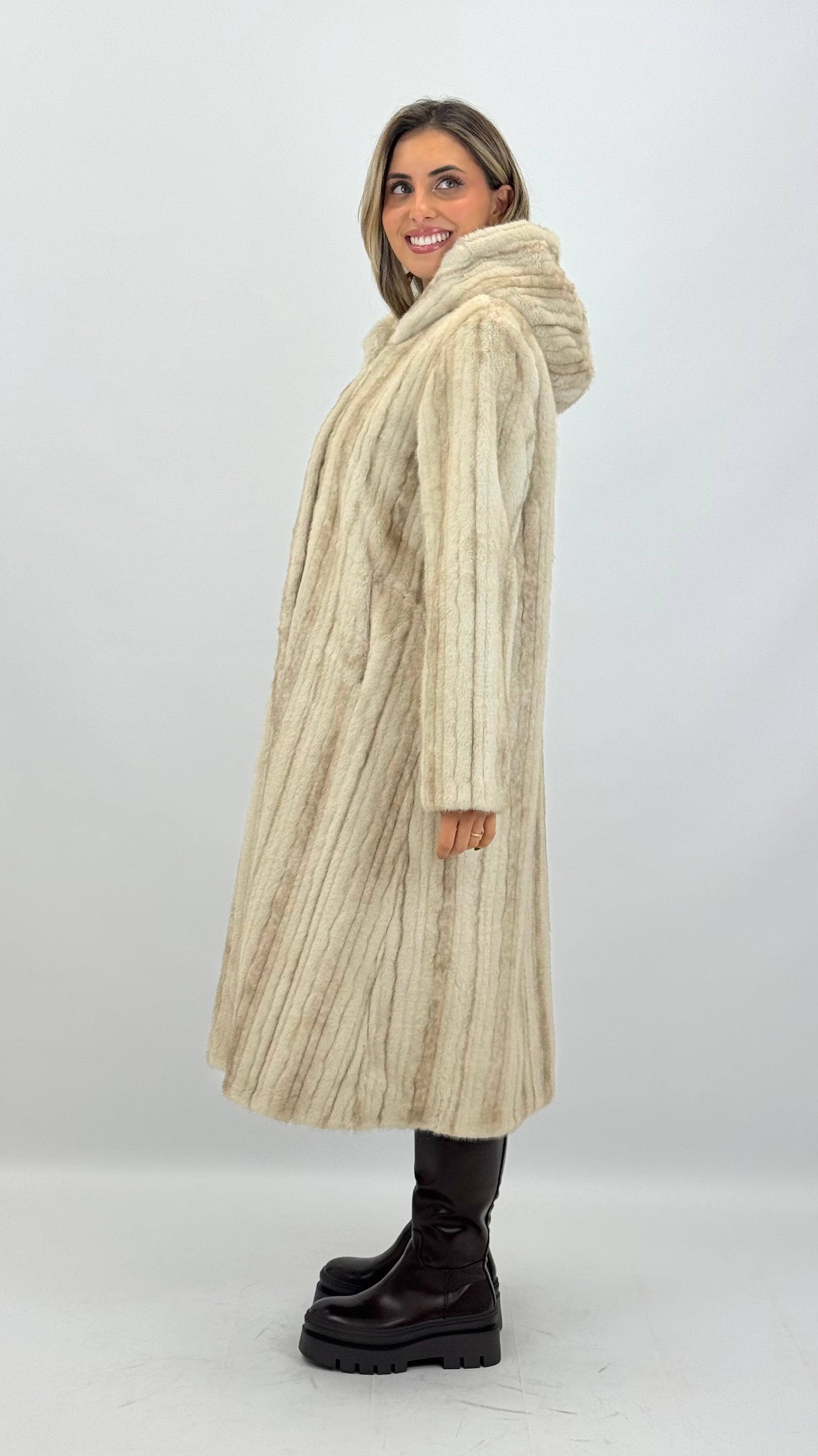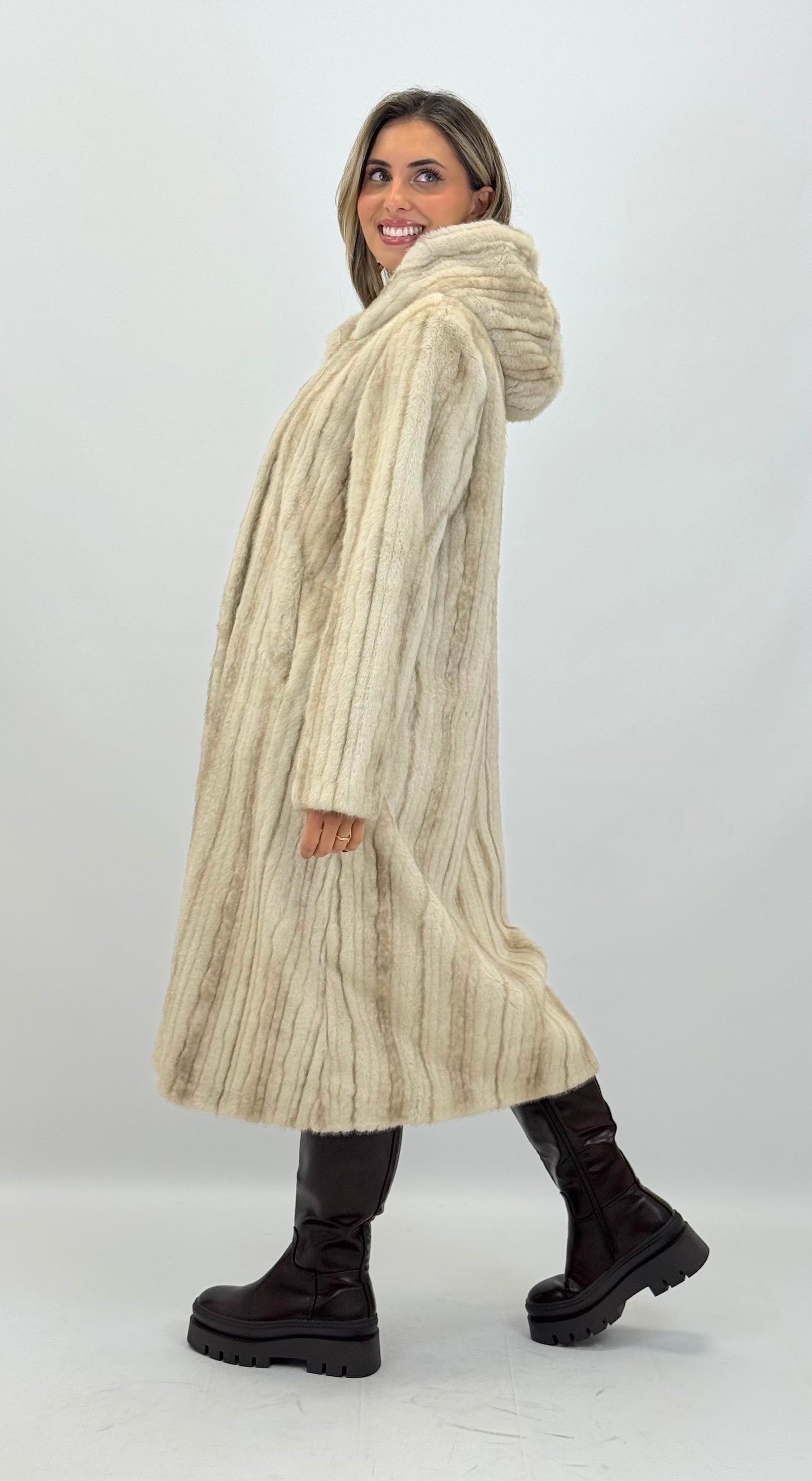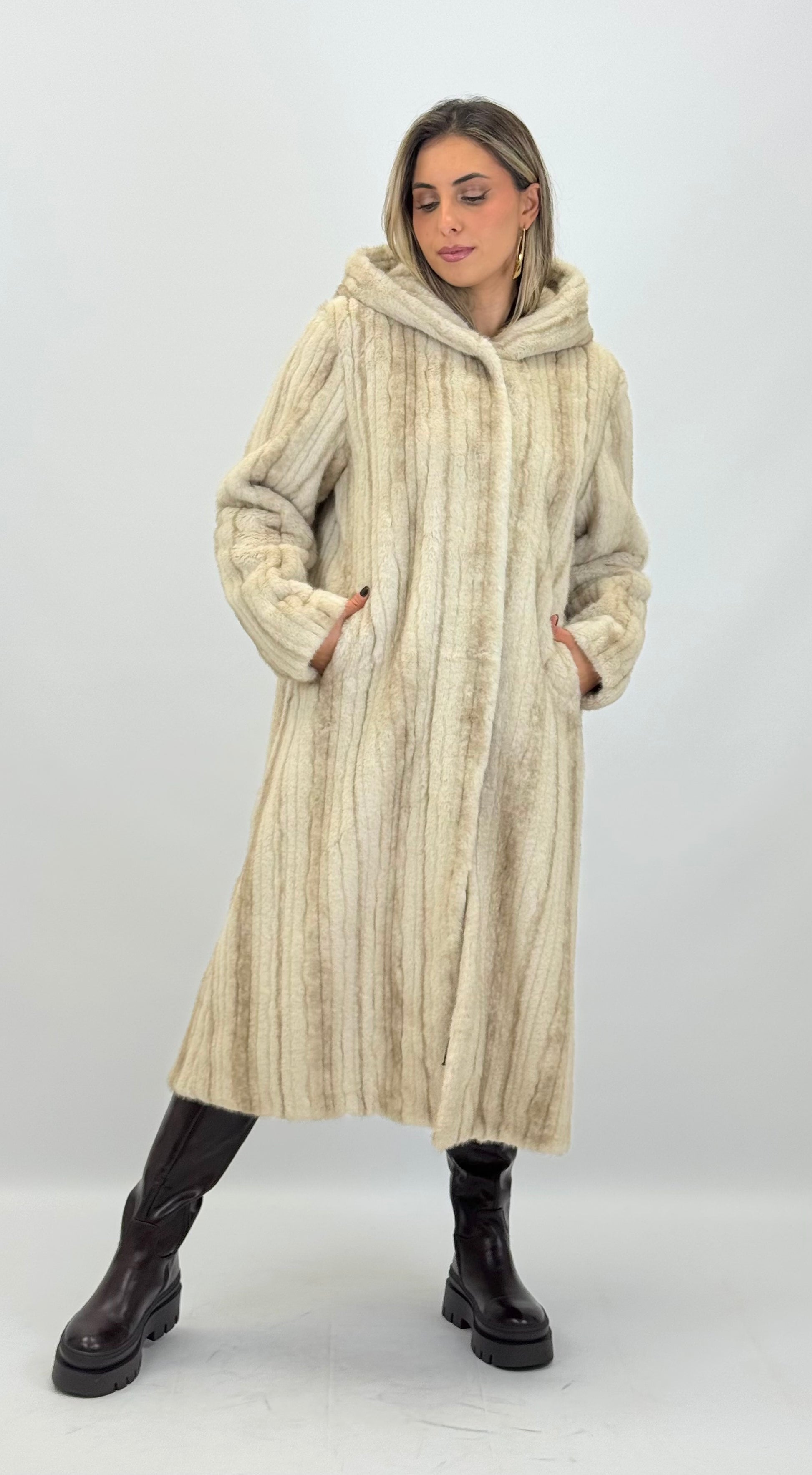 Casaco comprido em pêlo sintético ligeiramente matizado com leve risca. Aperta com colchetes na parte da frente. Contém capuz e bolsos nas laterais.