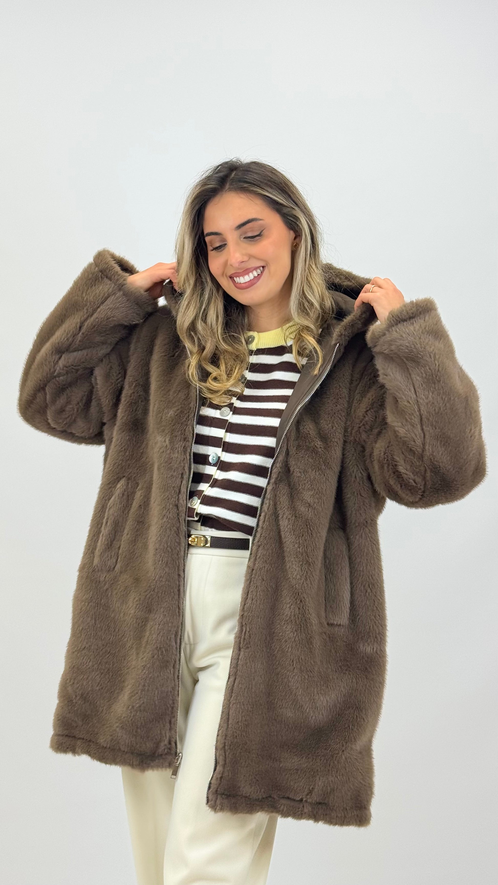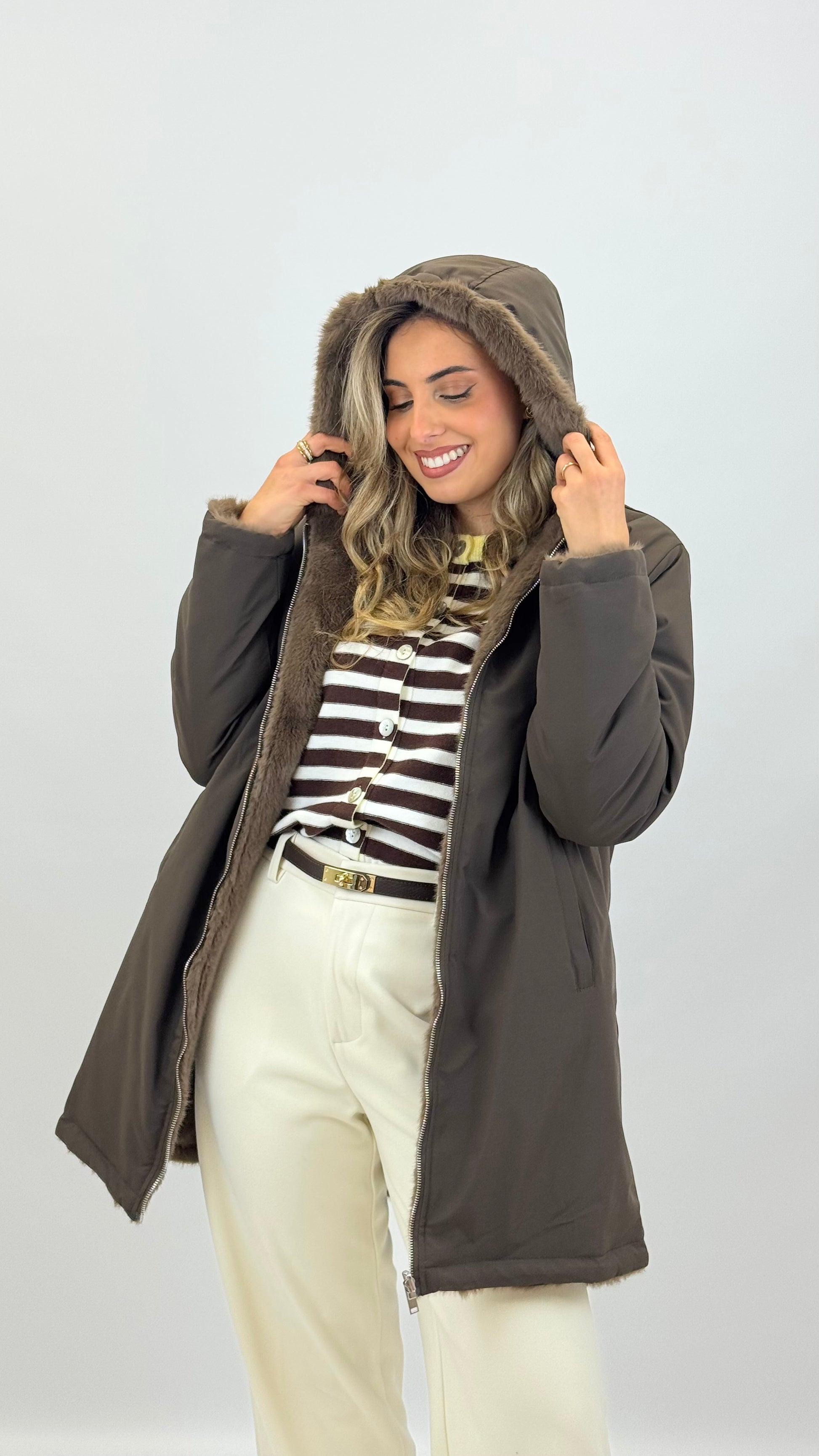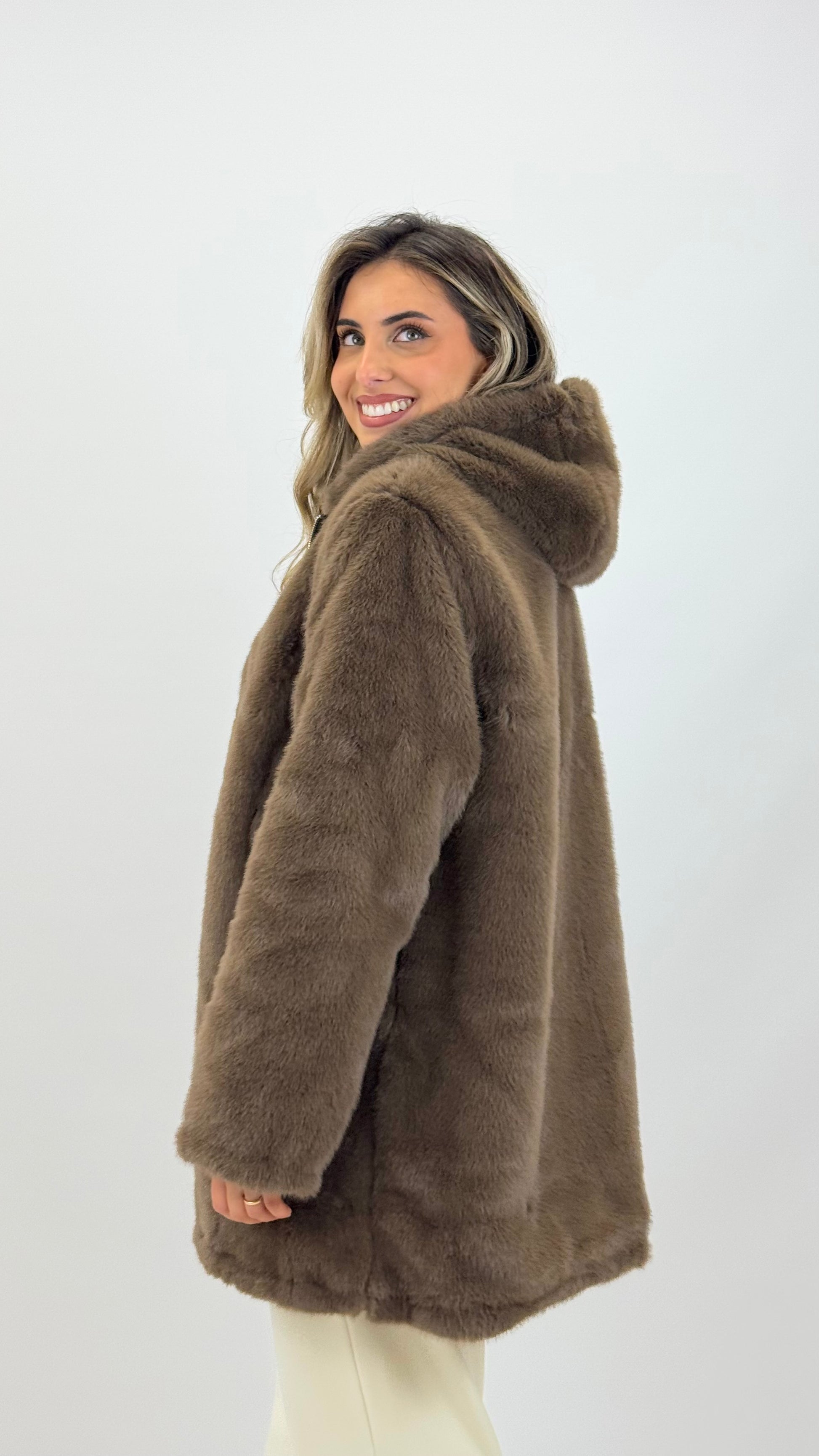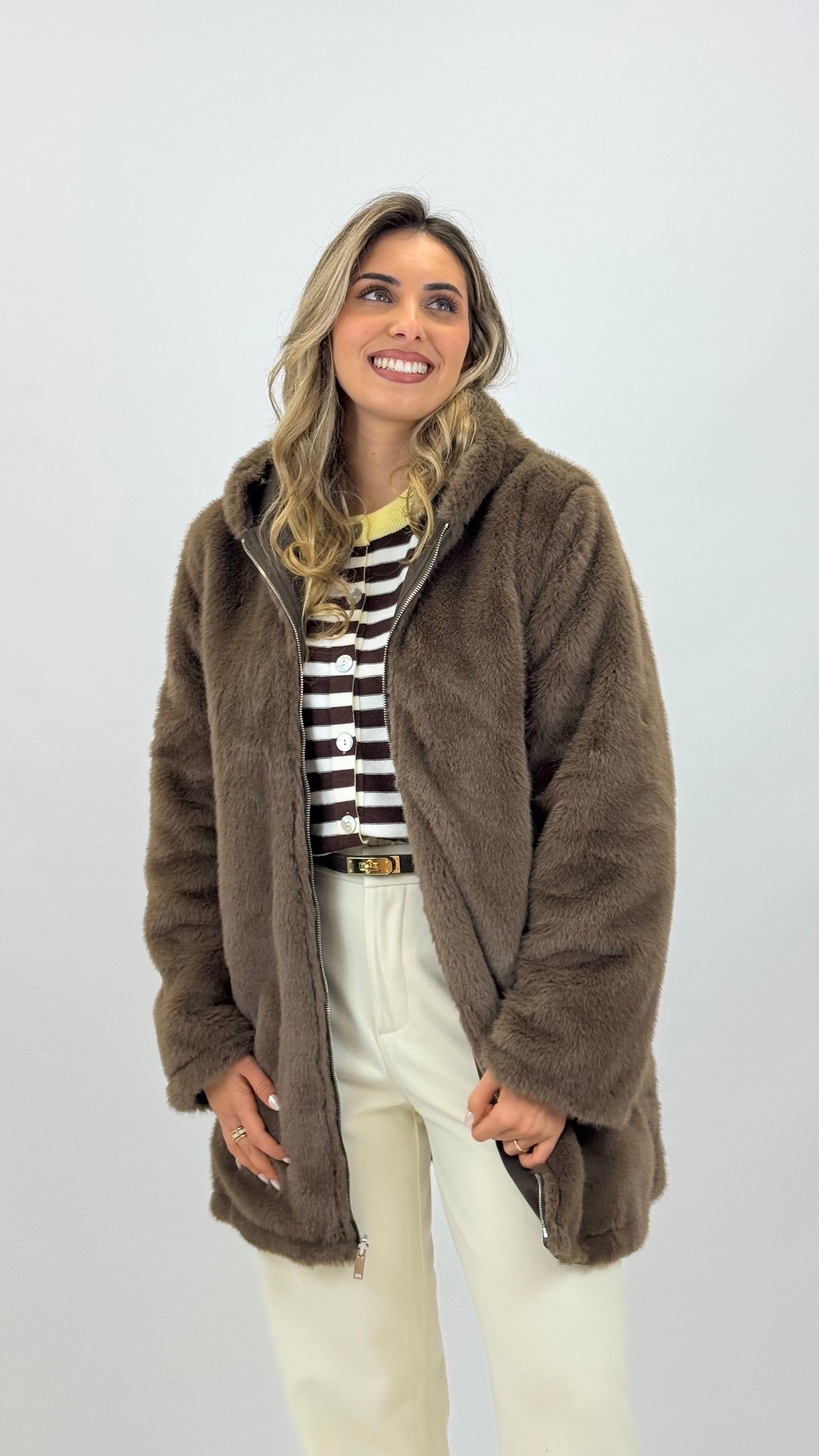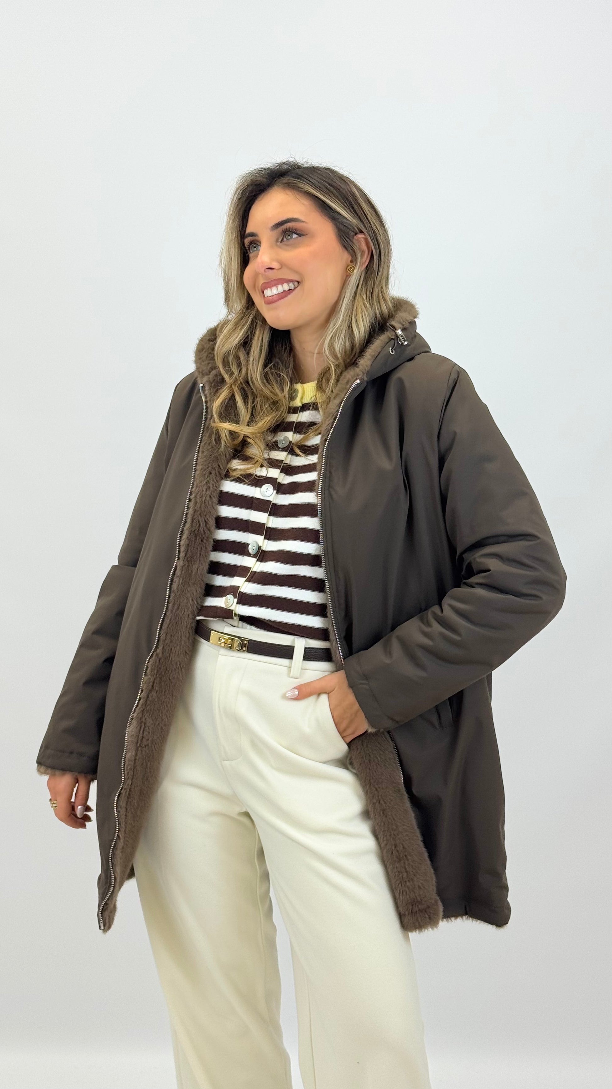 Casaco impermeável de um lado e pêlo sintético do outro. Contém capuz. Bolsos nas duas faces. Aperta com fecho de correr.