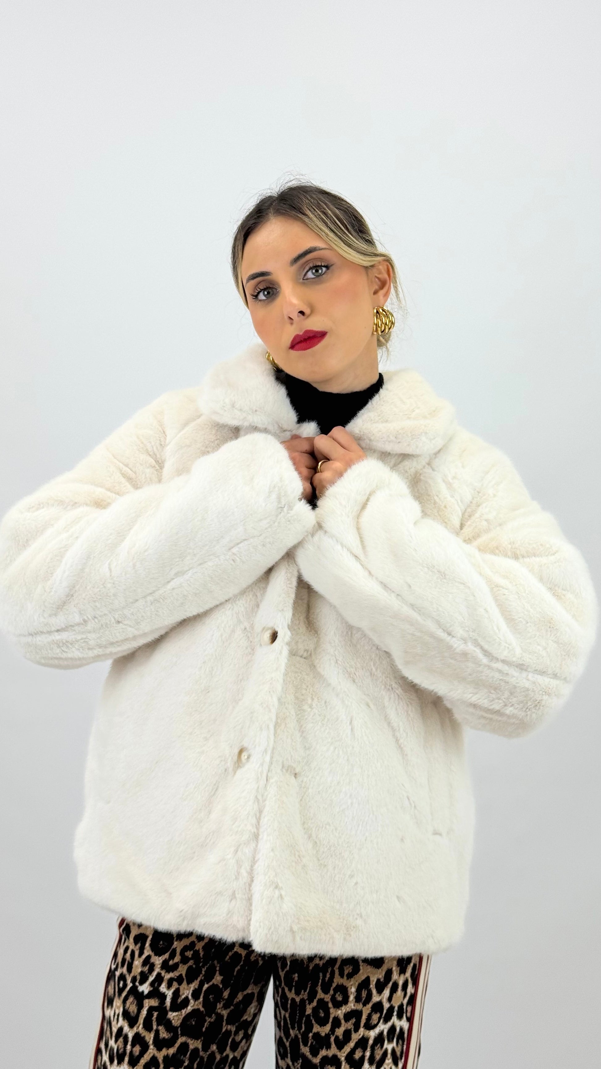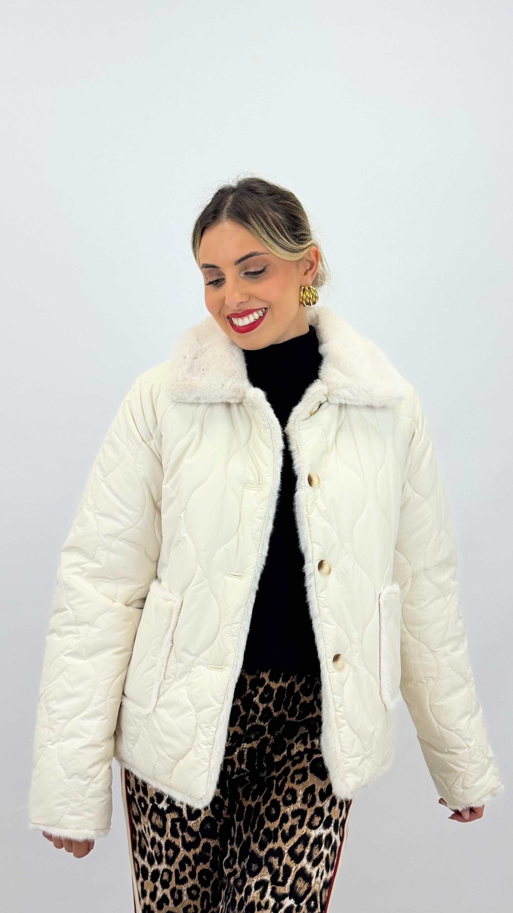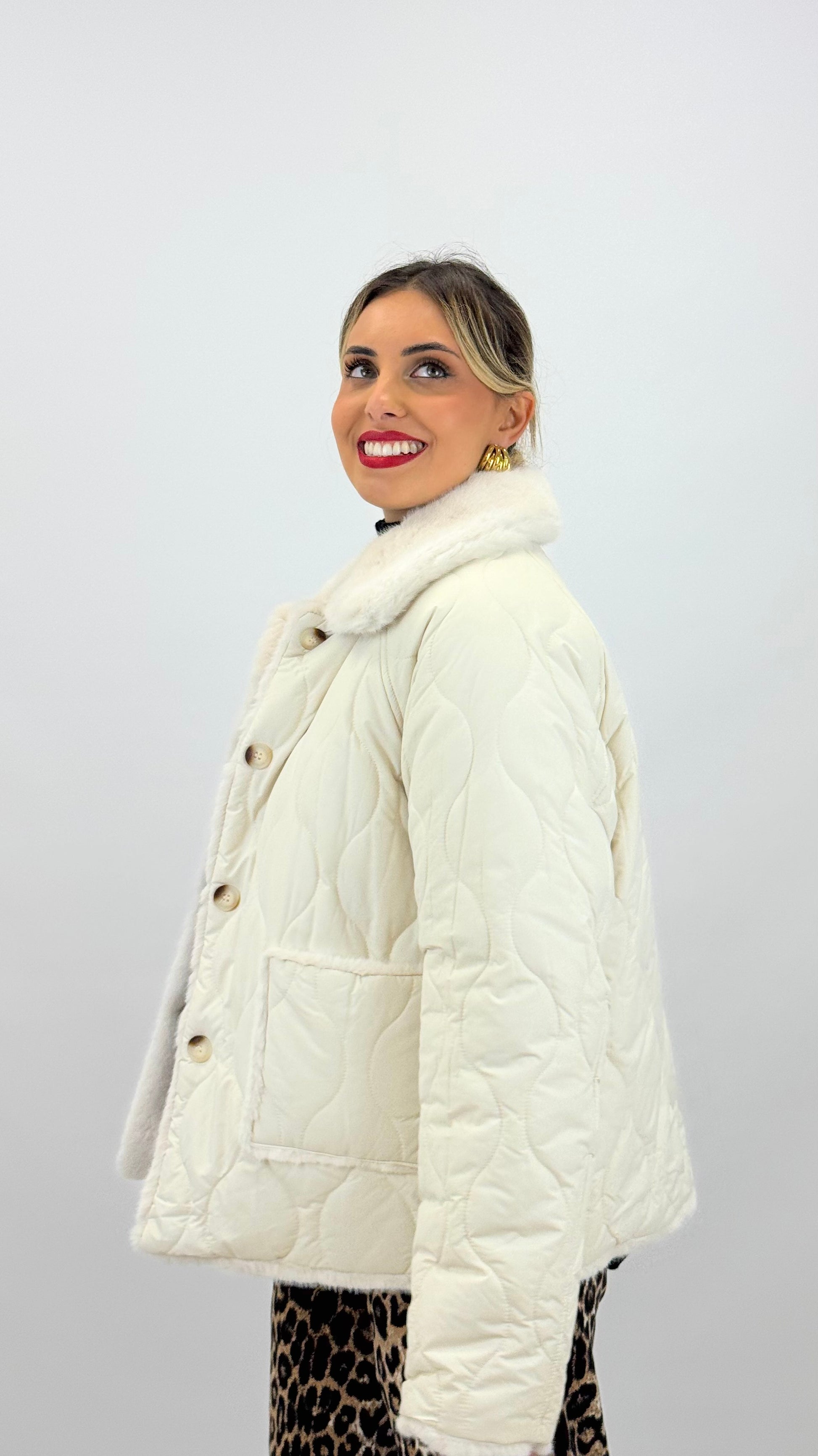 Casaco acolchoado impermeável pérola. O lado reverso em pêlo sintético. Bolsos nas laterais. Aperta com botões na parte da frente.
