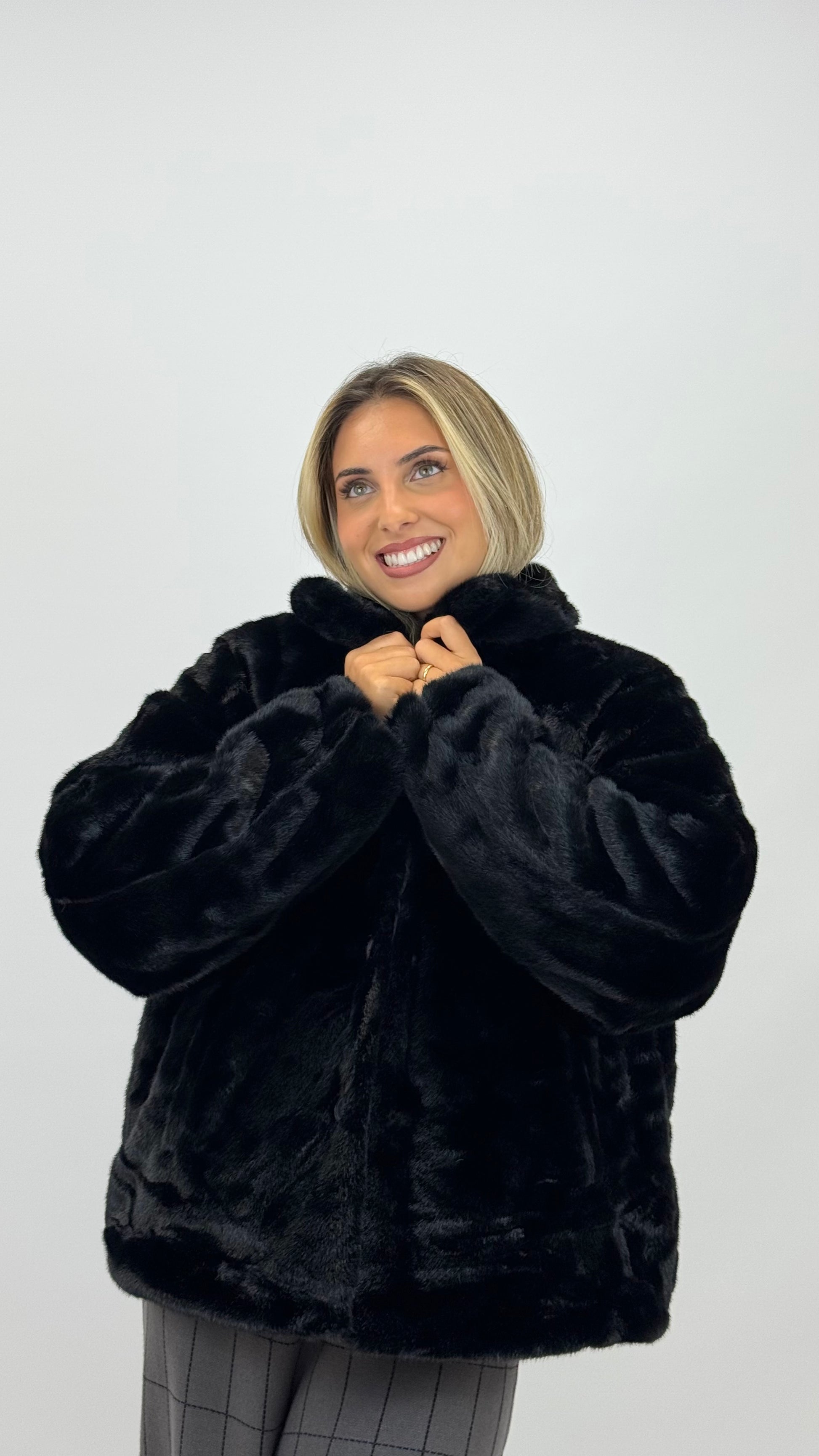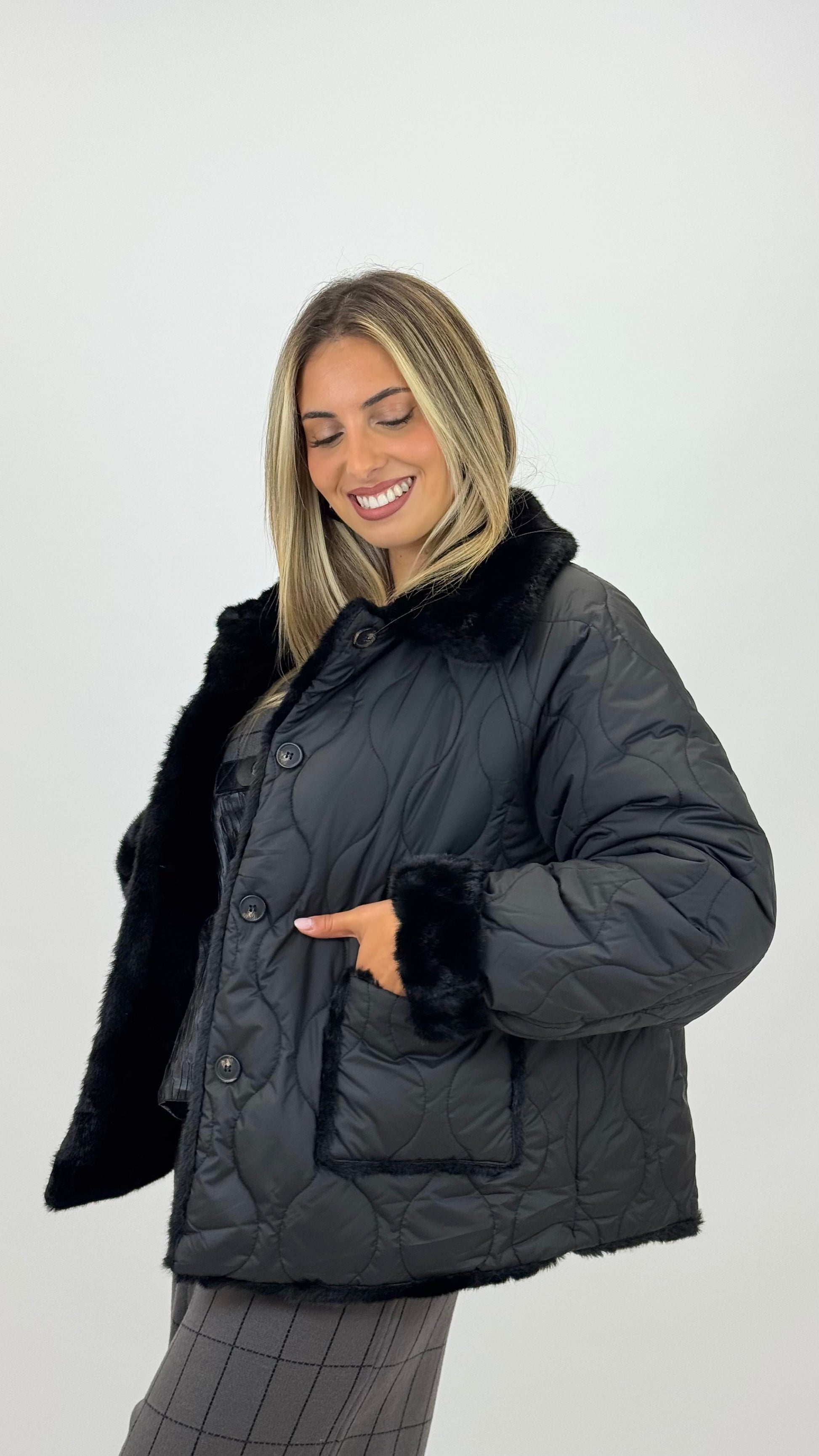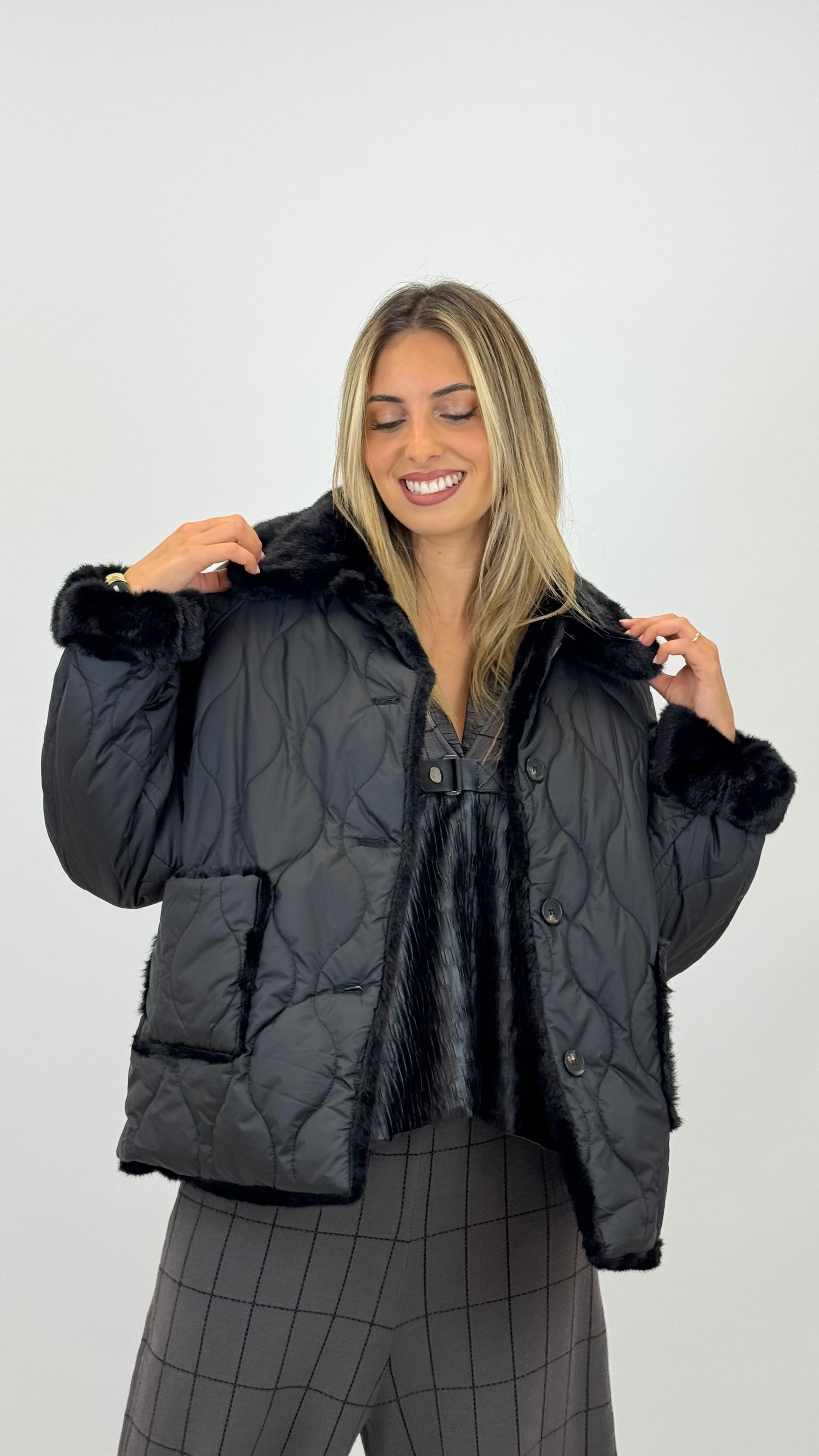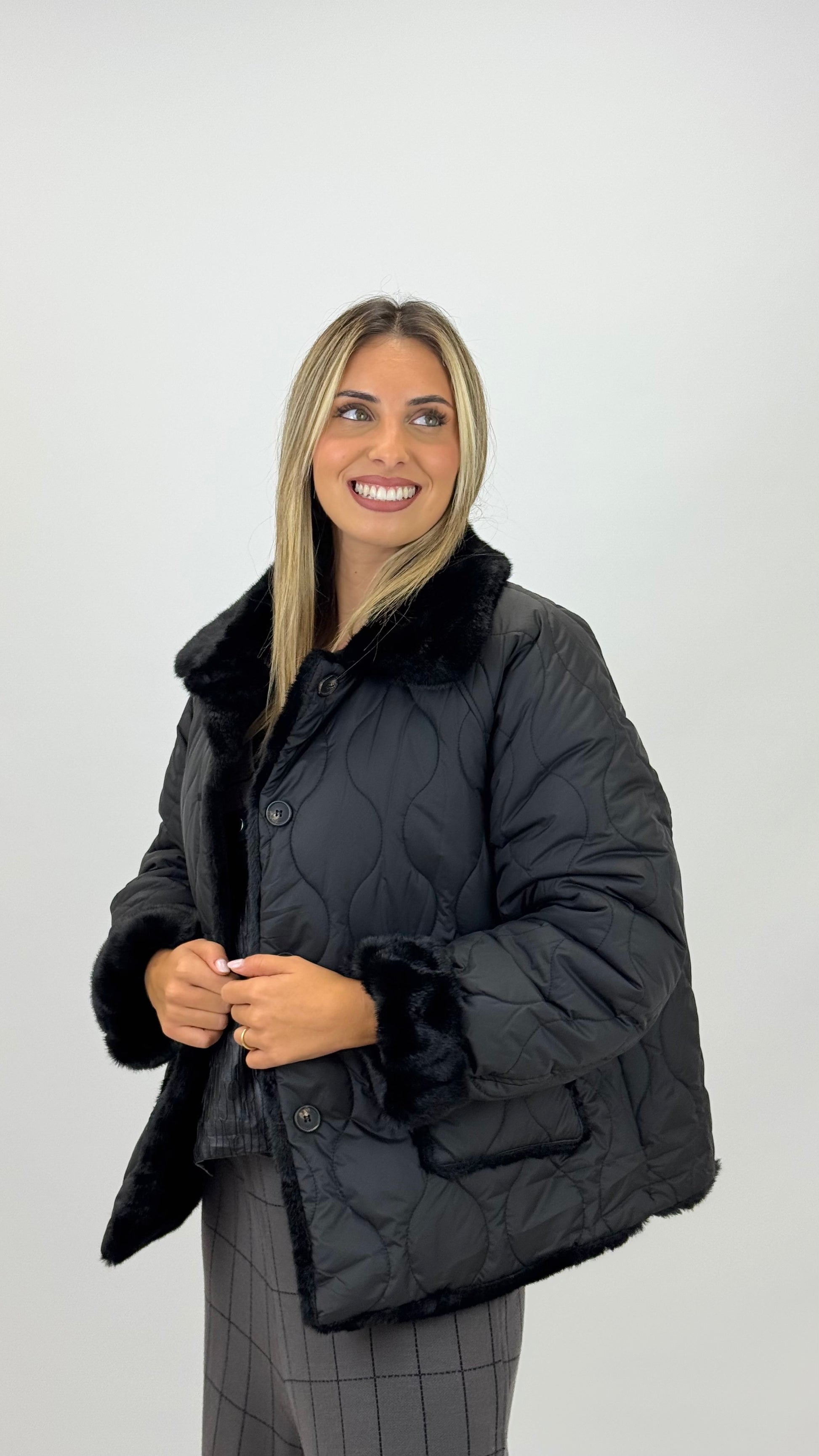 Casaco acolchoado impermeável preto. O lado reverso em pêlo sintético. Bolsos nas laterais. Aperta com botões na parte da frente.