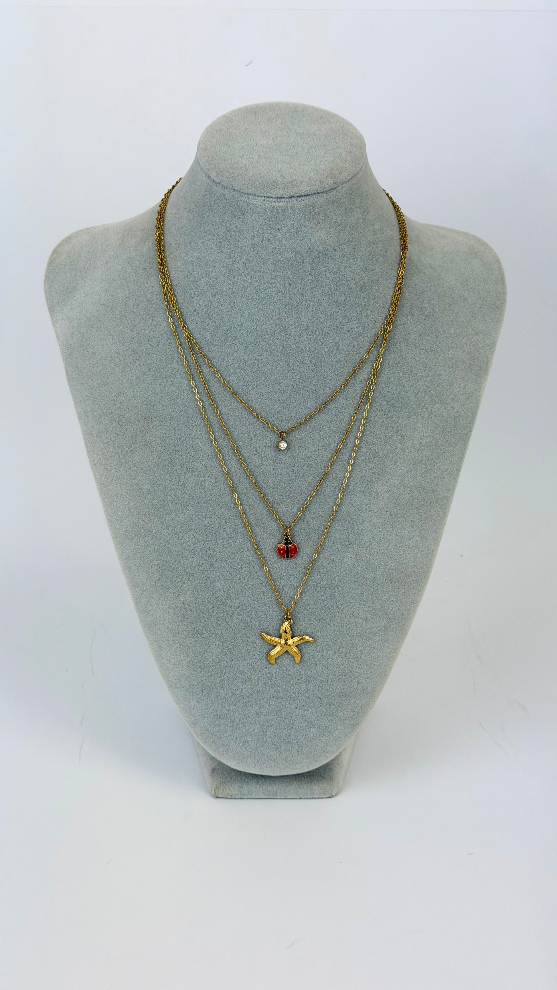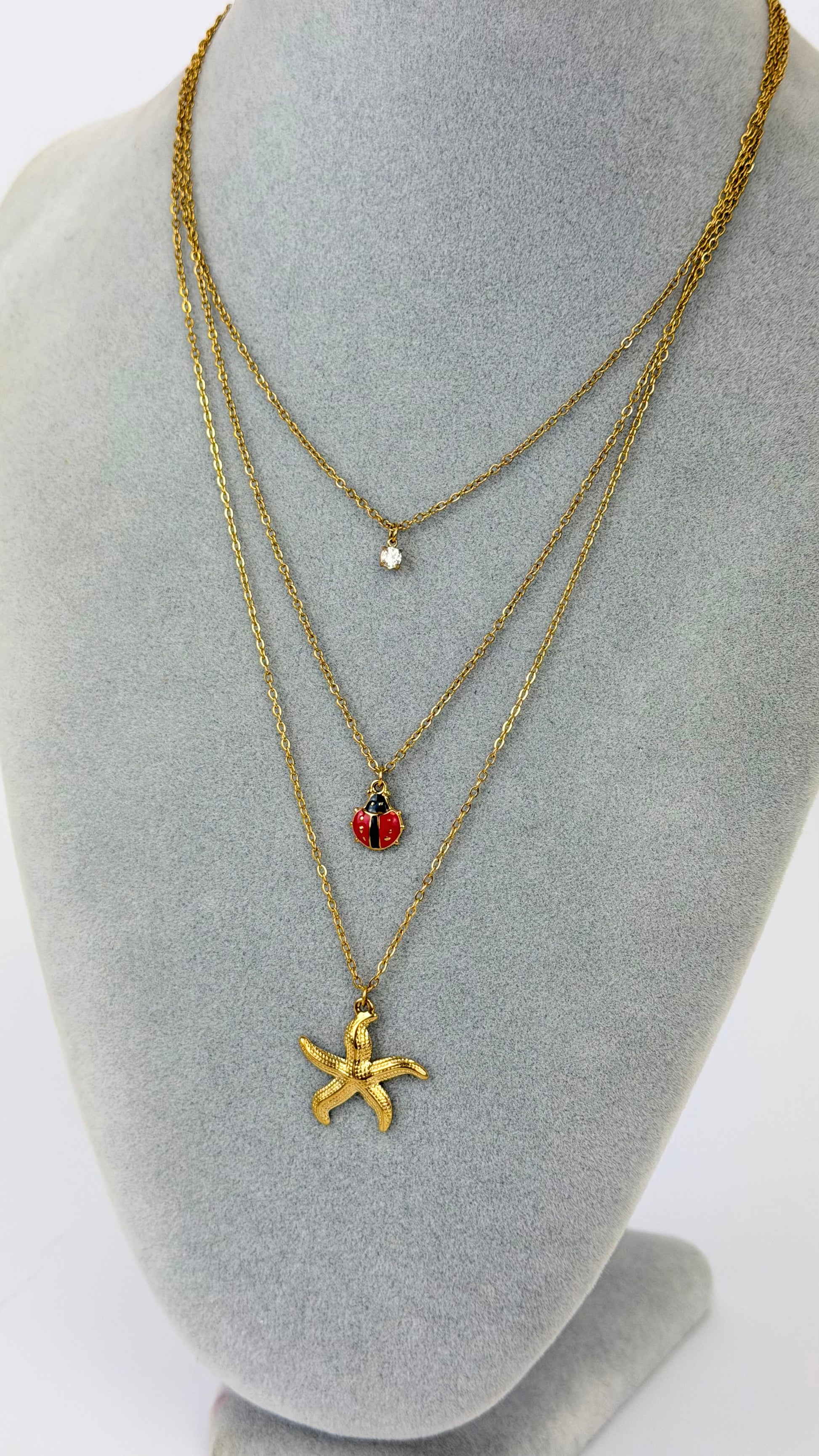 Colar 3 voltas aço com joaninha vermelha