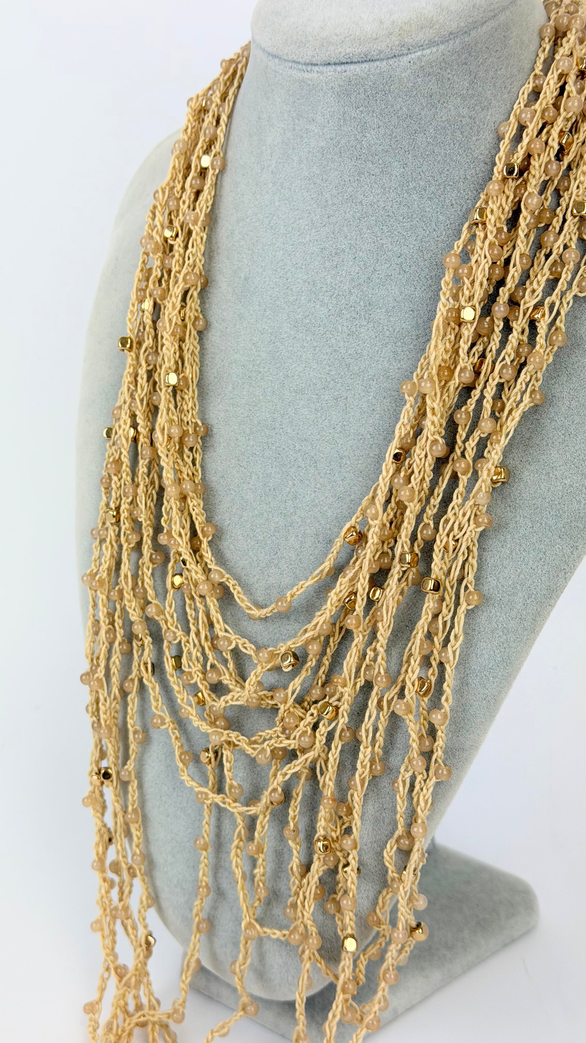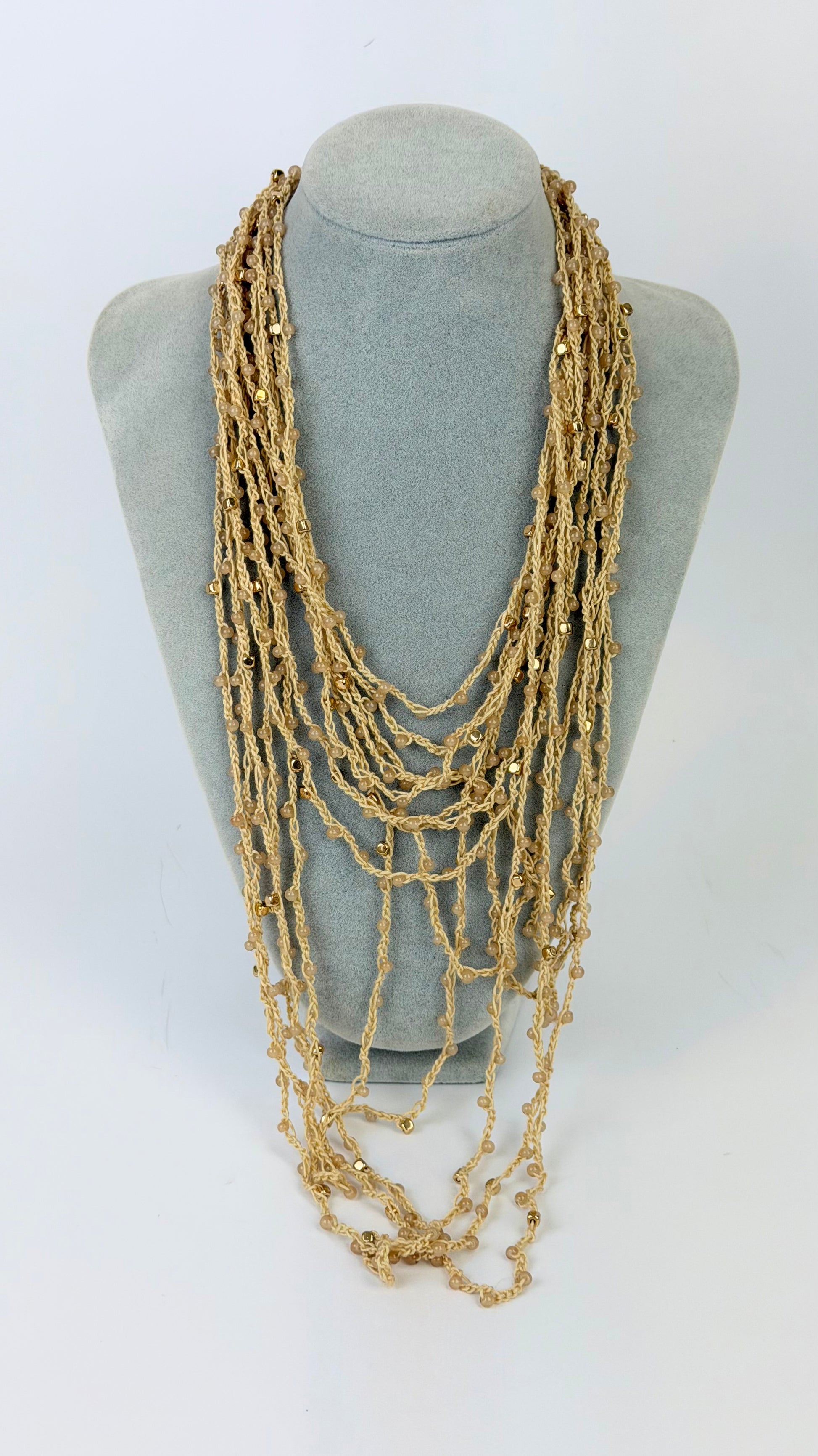 Colar várias voltas em croché e missangas bege