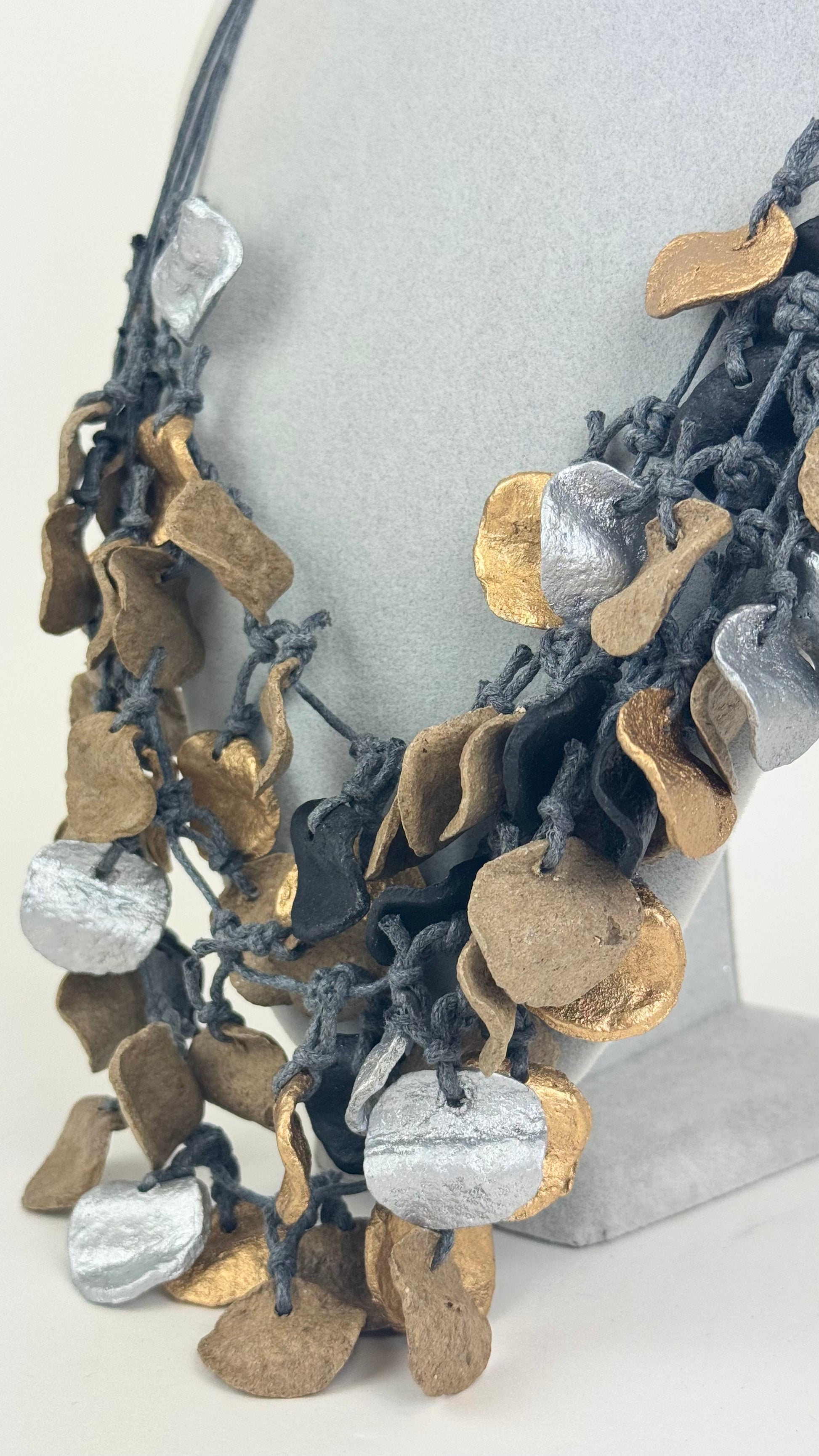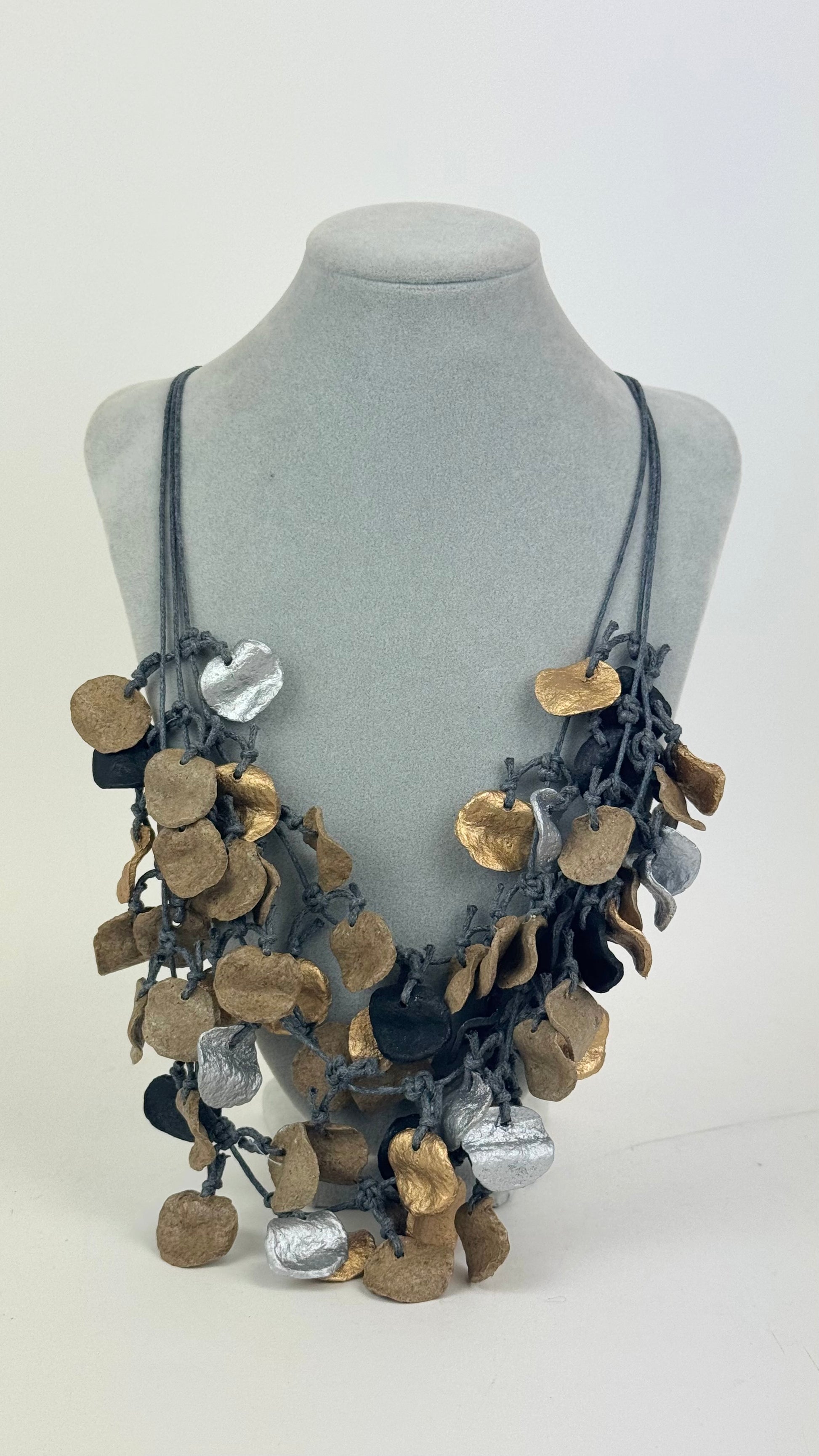 Colar comprido pétalas bege, douradas e cinza