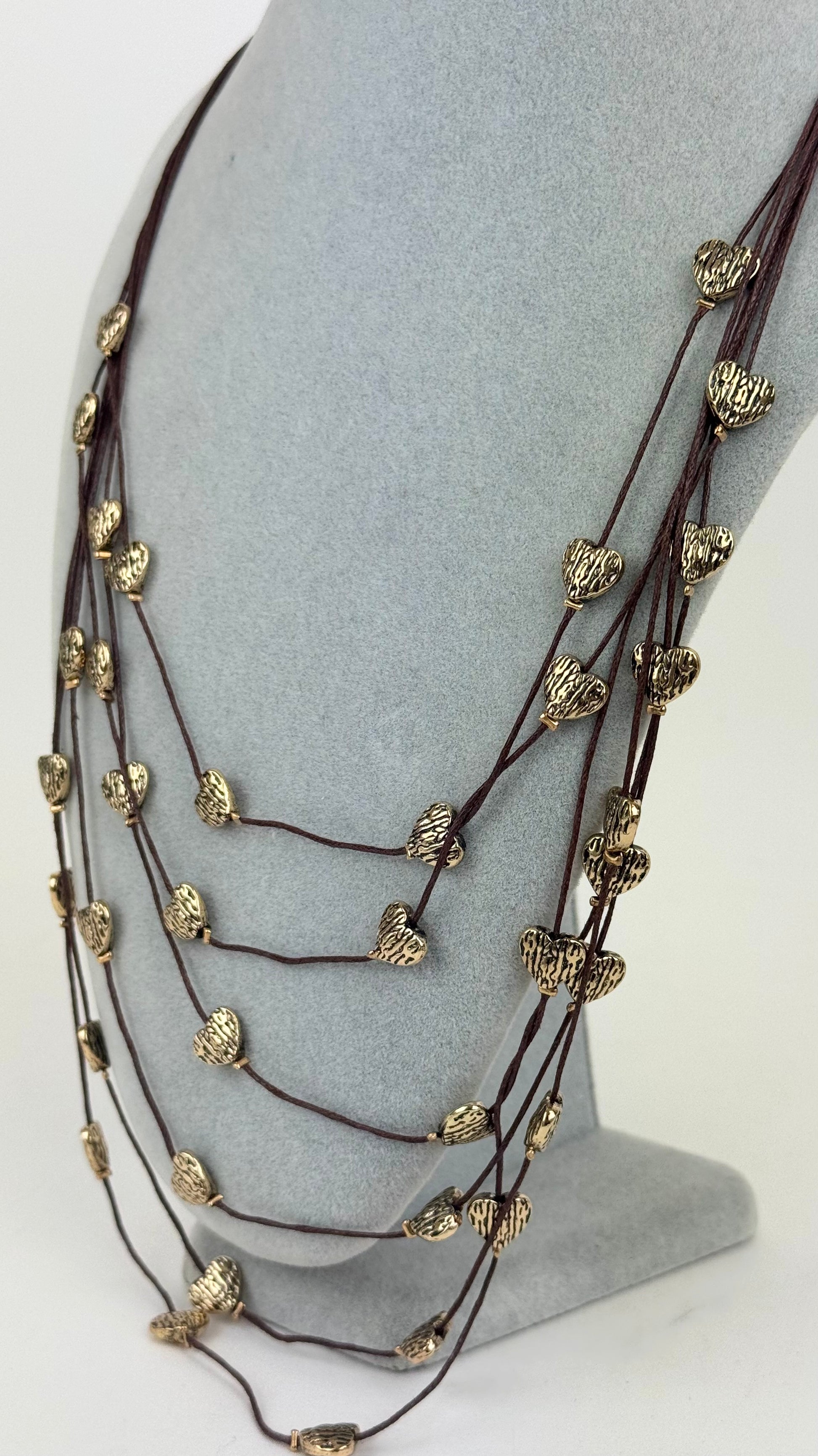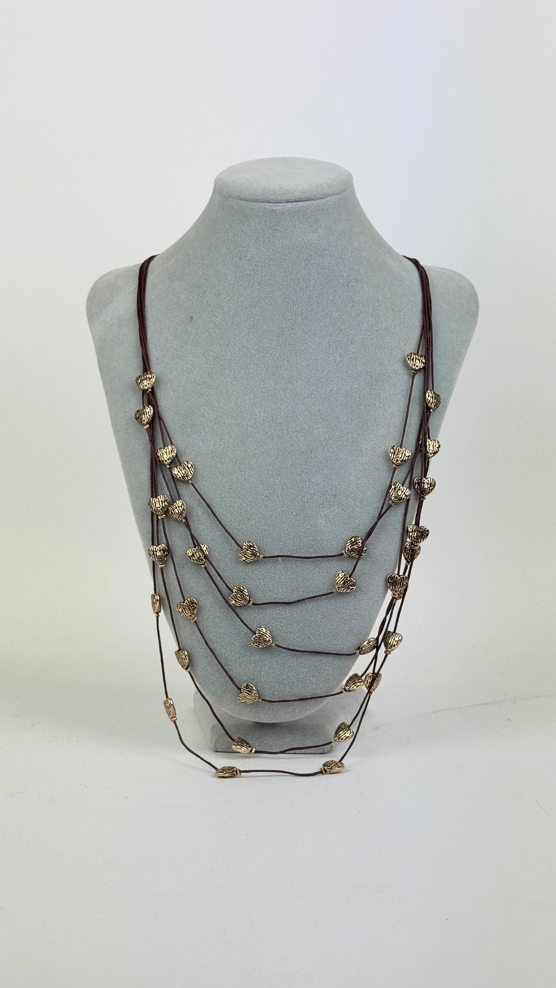 Colar fios castanhos com corações dourados