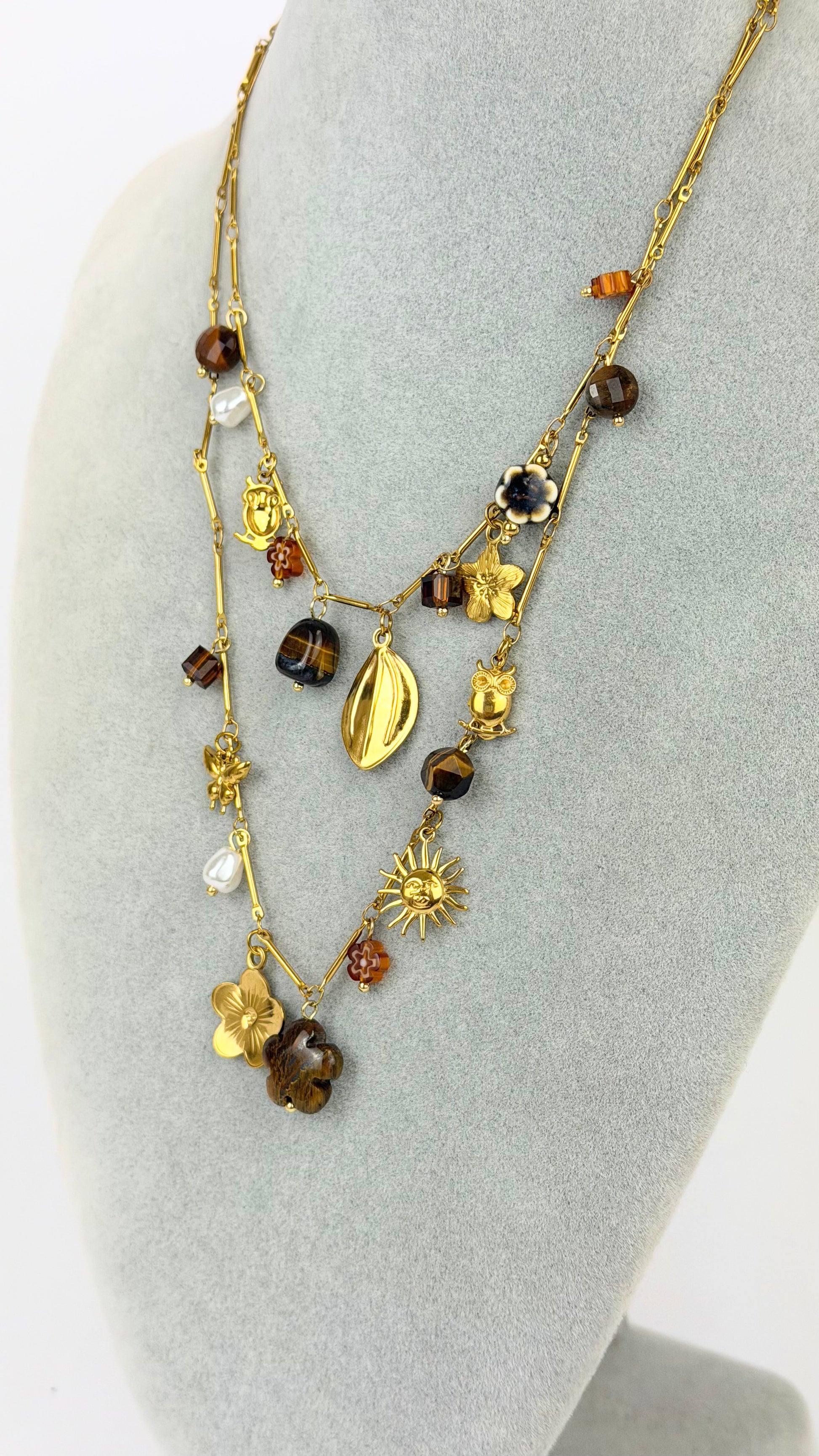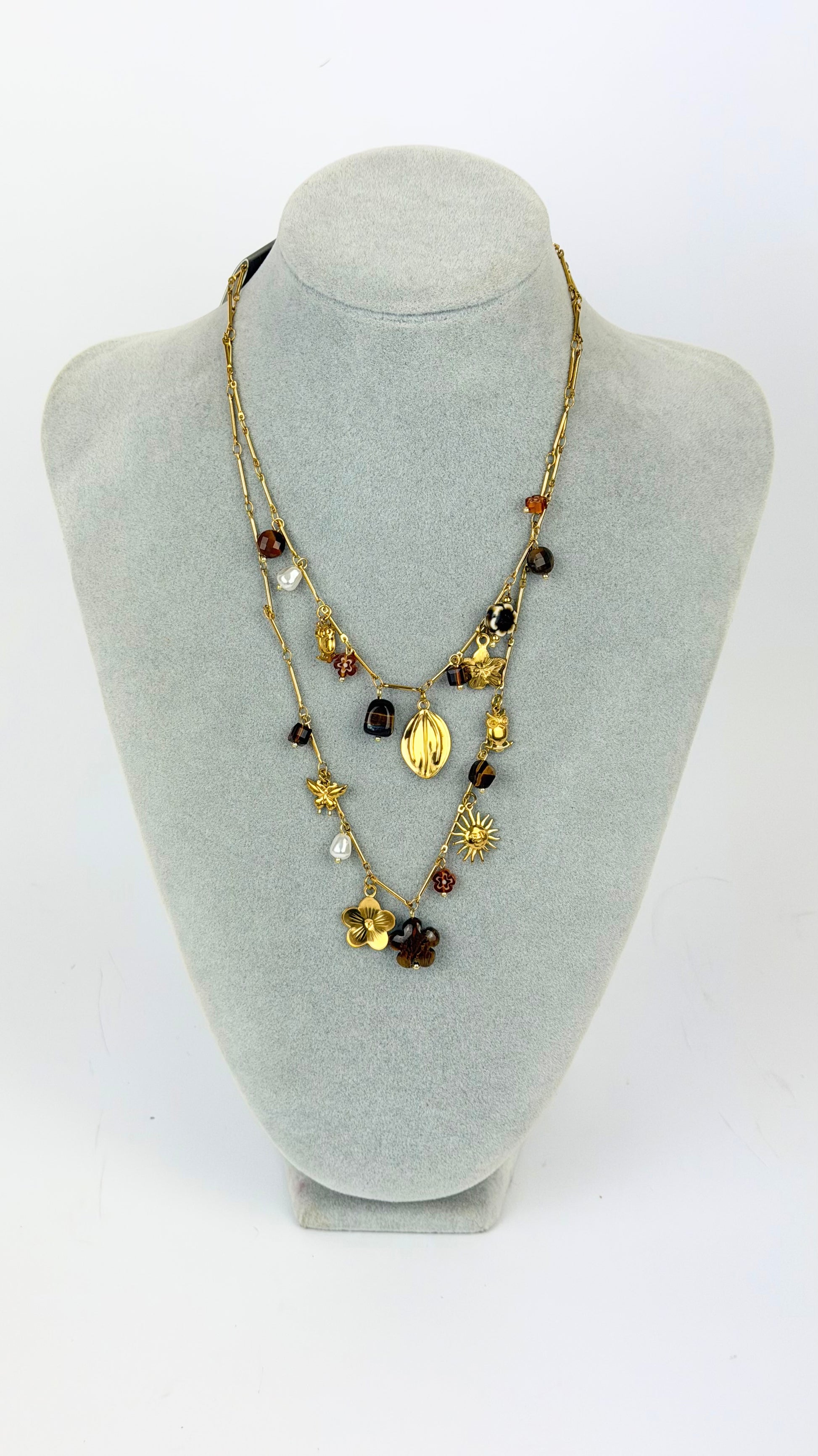 Fio duas voltas aço dourado com pendentes tons castanho