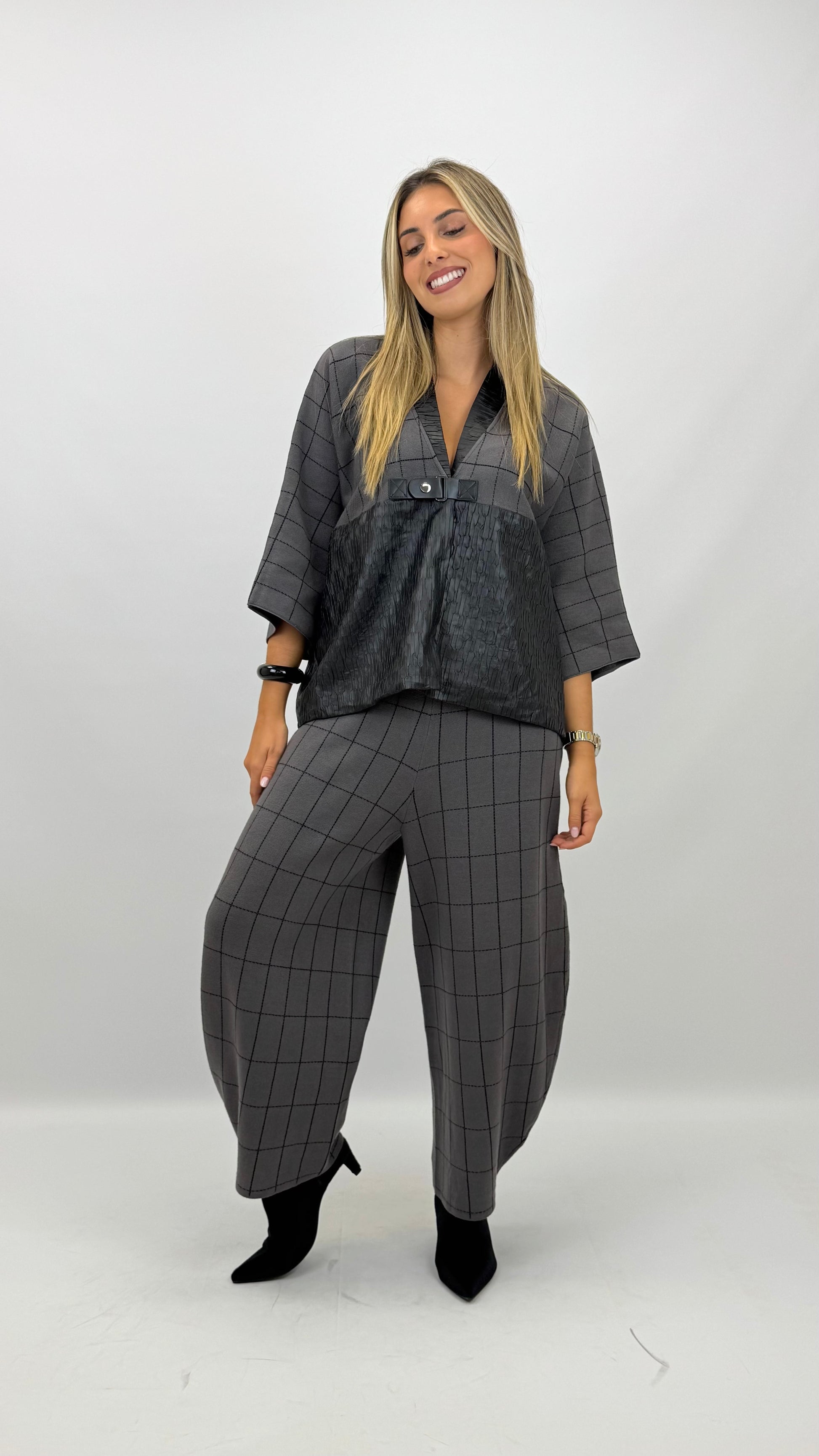 Conjunto malha cinza e preto com detalhes eco-pele