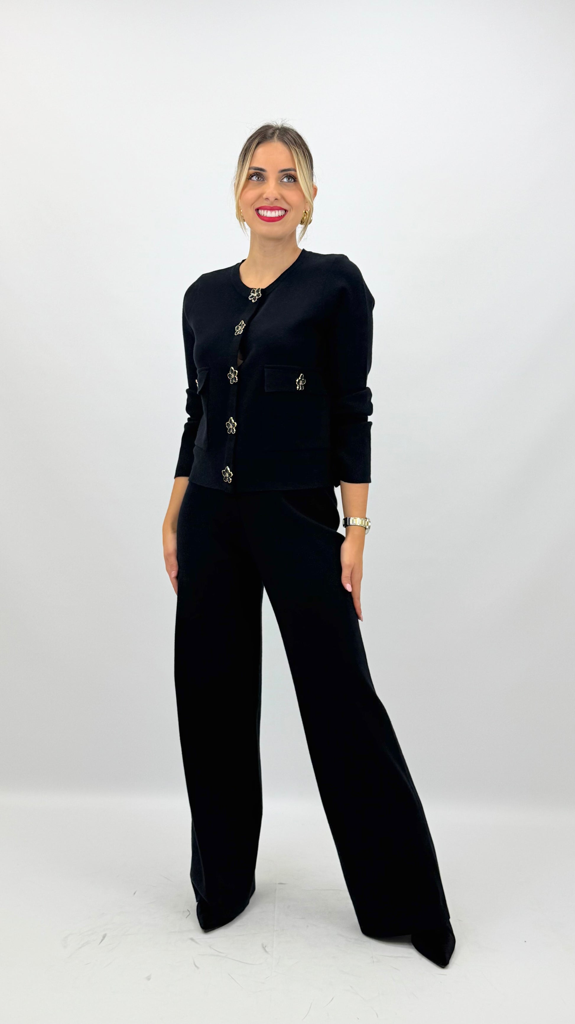 Conjunto em malha macia e compacta composto por casaco e pantalona. Casaco em malha com botões em metal formato flor tons preto e dourado.