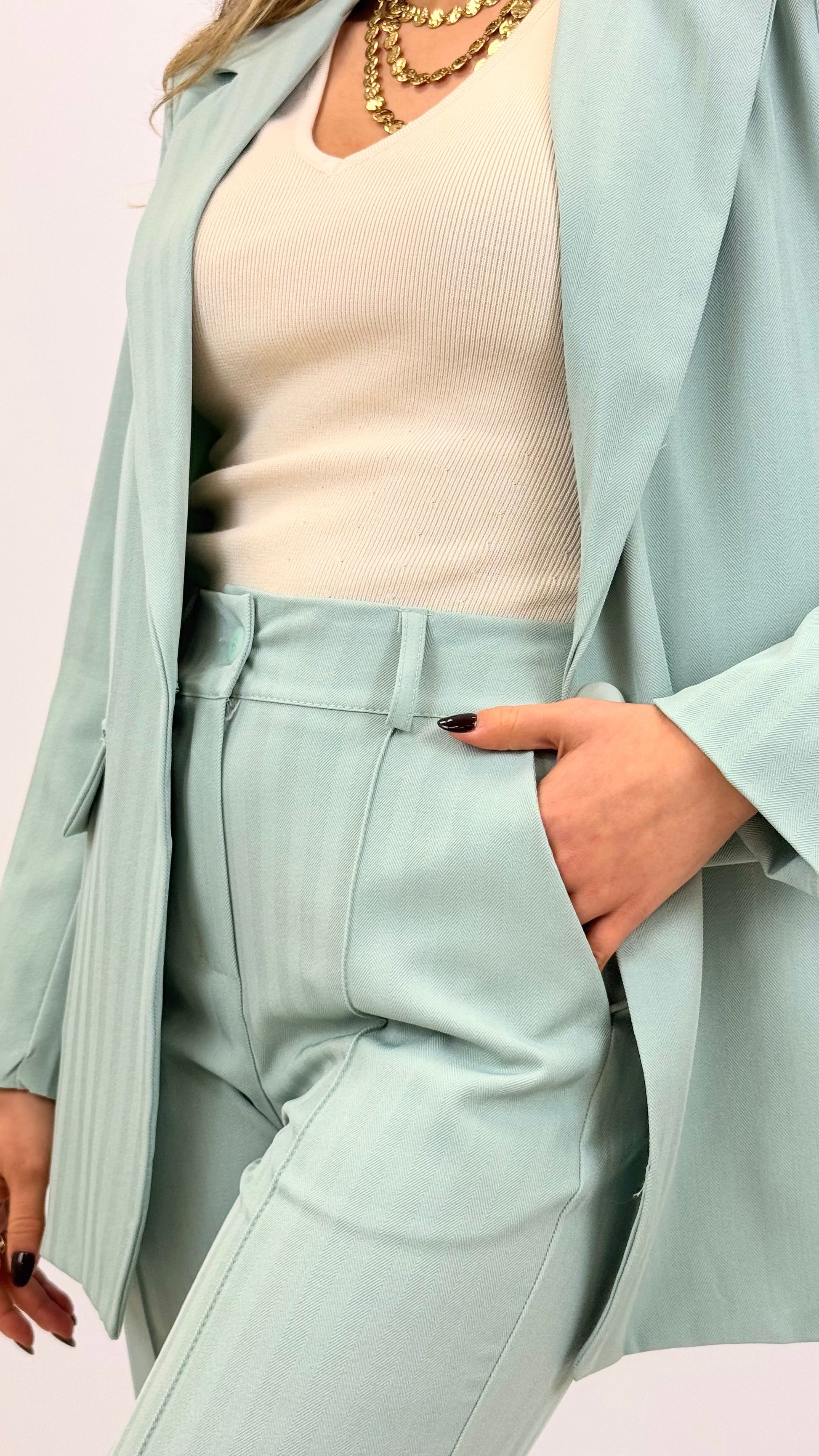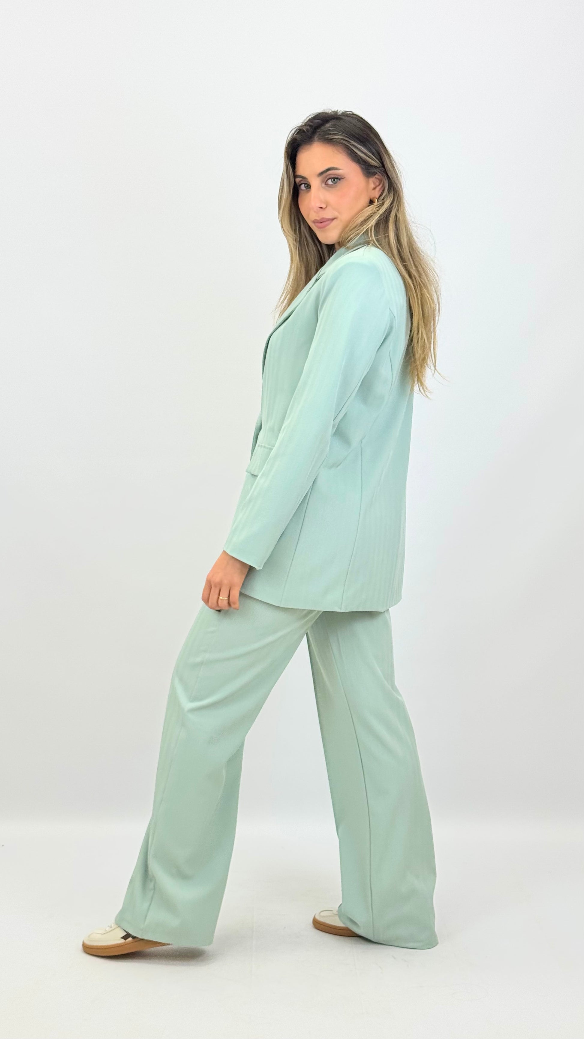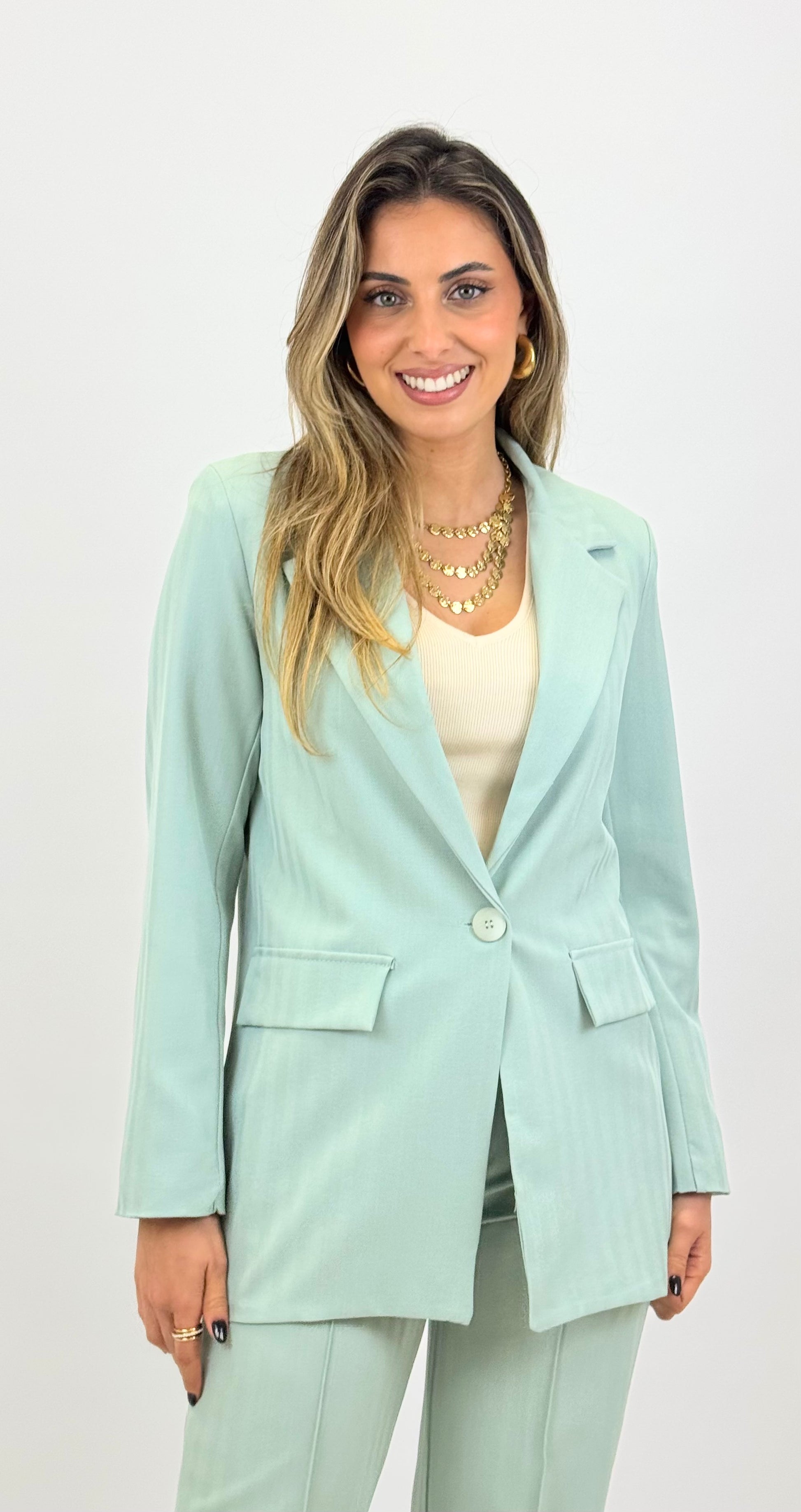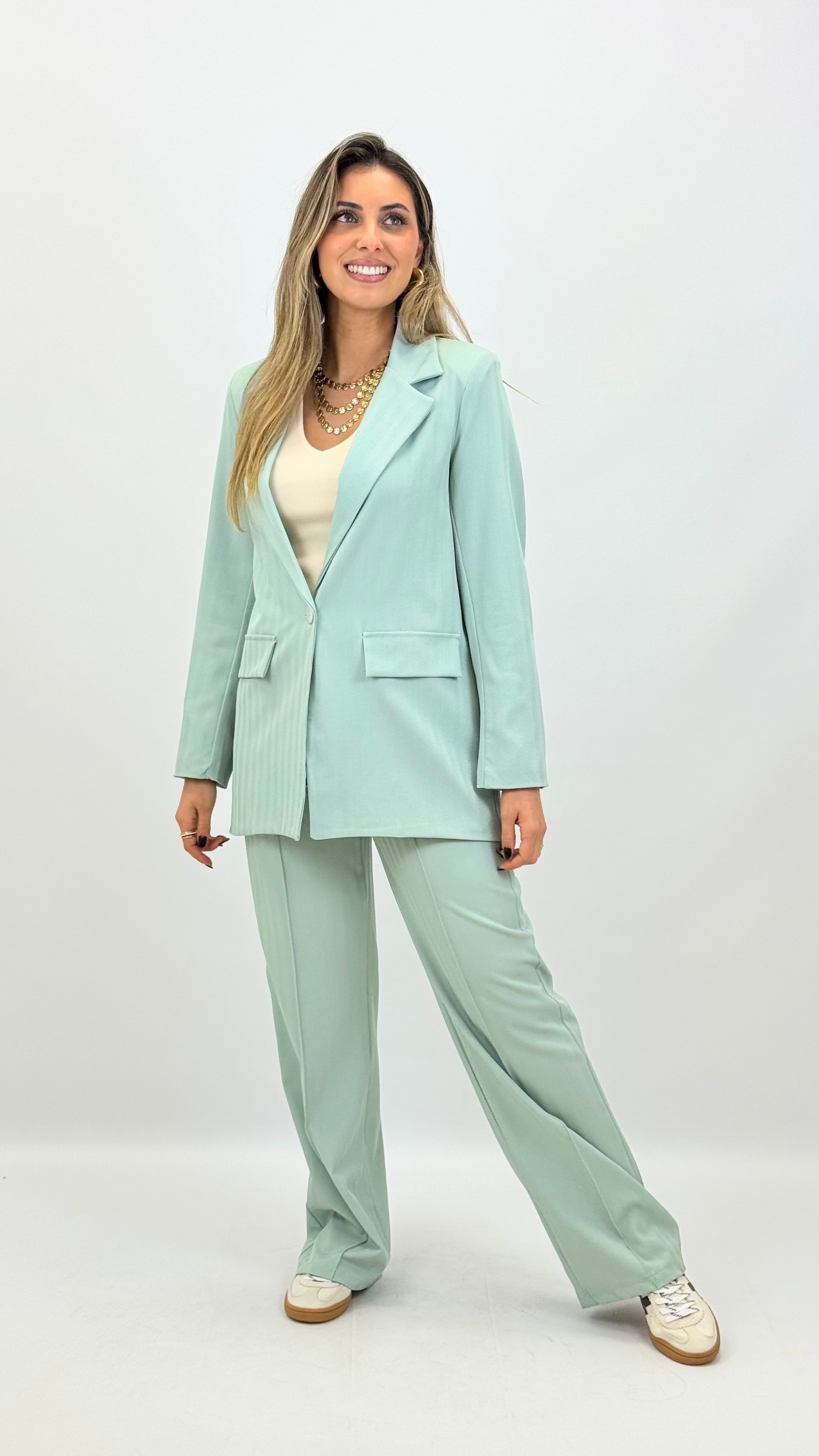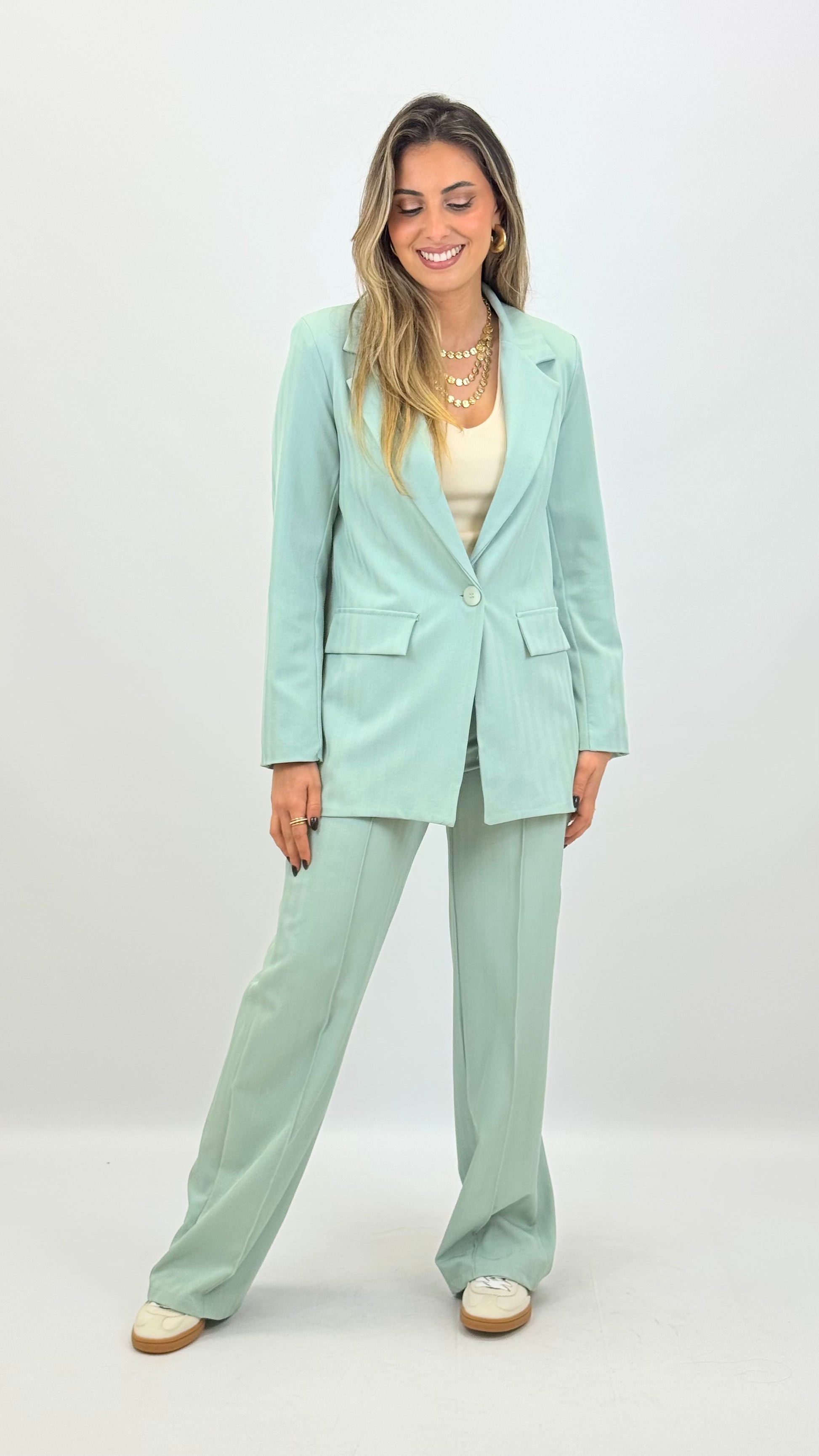 Fato composto por blazer e calça. Blazer em tecido forrado, aperta coom botão na parte da frente.
