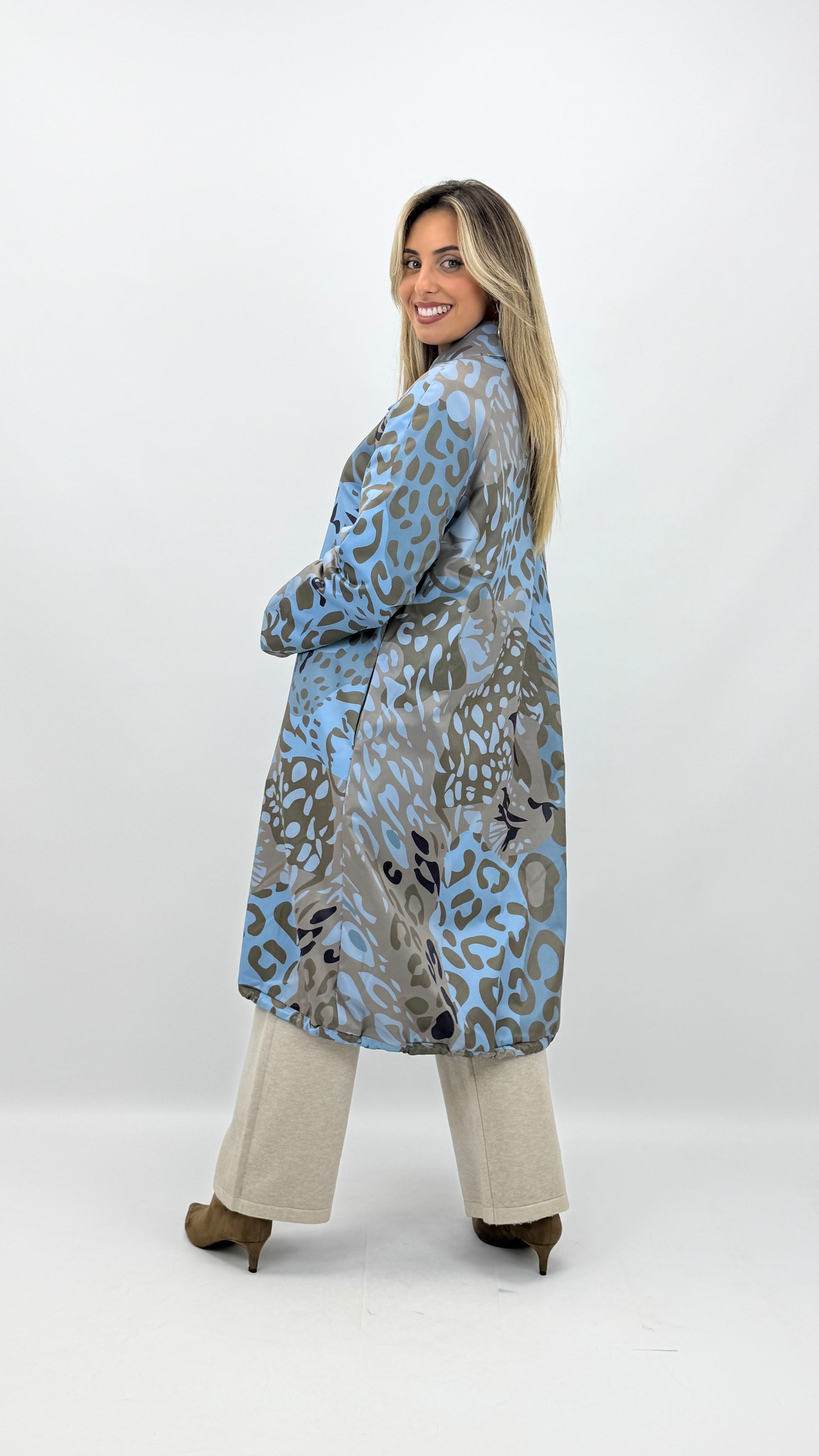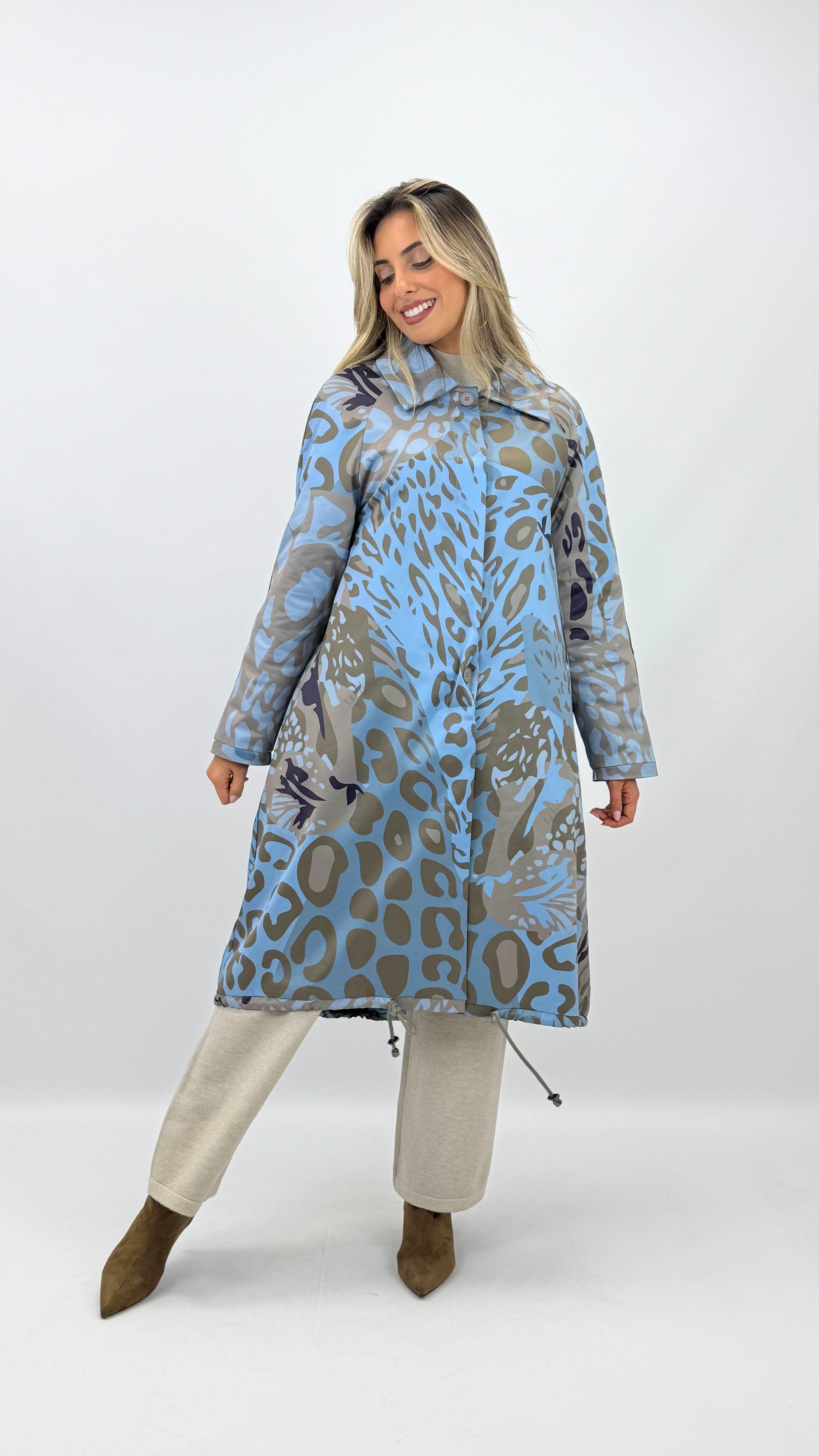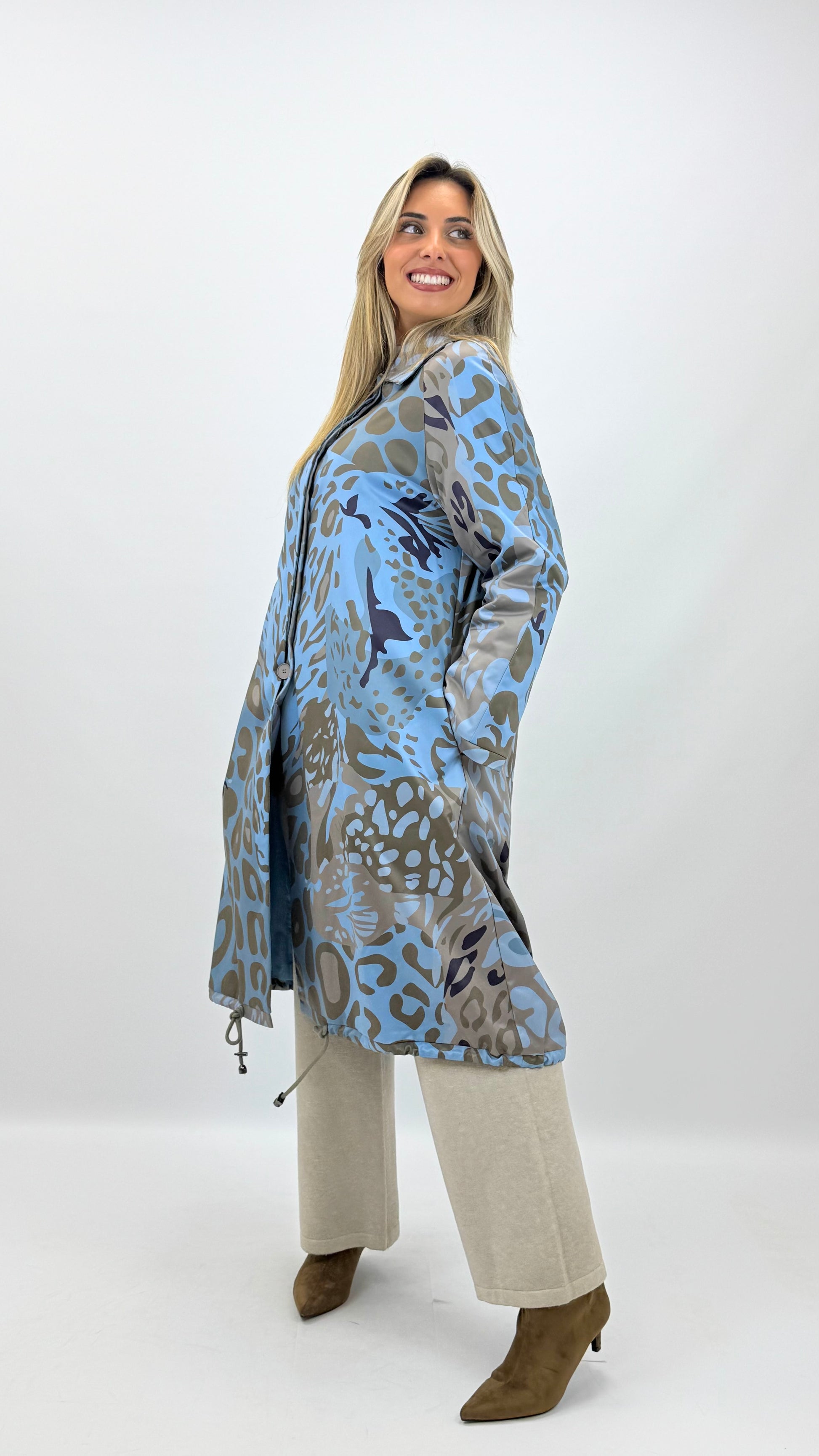 Parka/gabardine em tecido. Modelo todo forrado. Aperta com botões na parte da frente, bolsos nas laterais. Estampado abstrato tons verde-seco e azul-céu. Estampado exclusivo da marca Espanhola Mercedes de Miguel.
