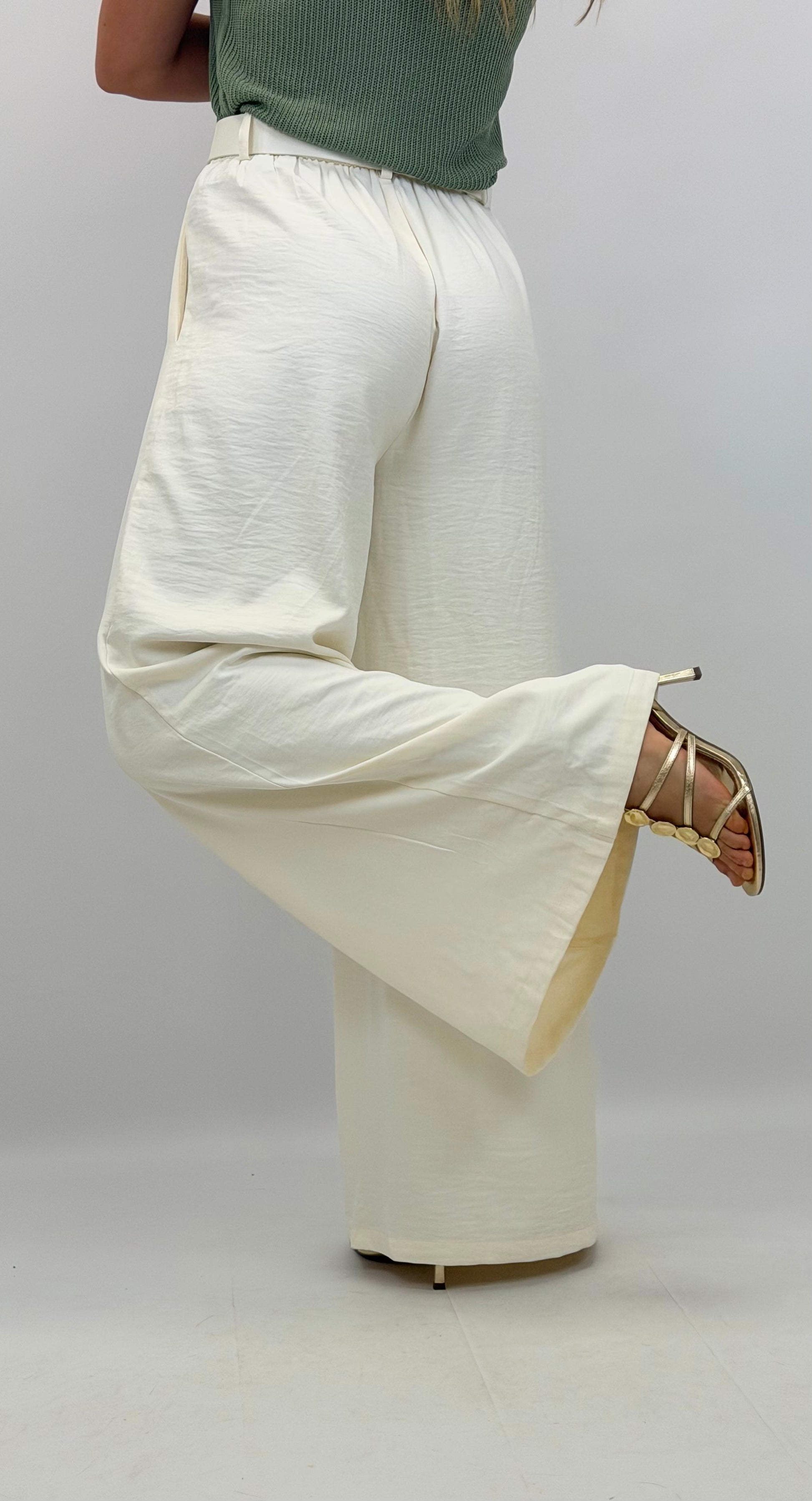 Pantalona branco/pérola em tecido macio ligeiramente acetinado. Elástico na parte de trás da cintura e bolsos nas laterais. Contém cinto em eco-pele na mesma cor com fivela em metal dourado.