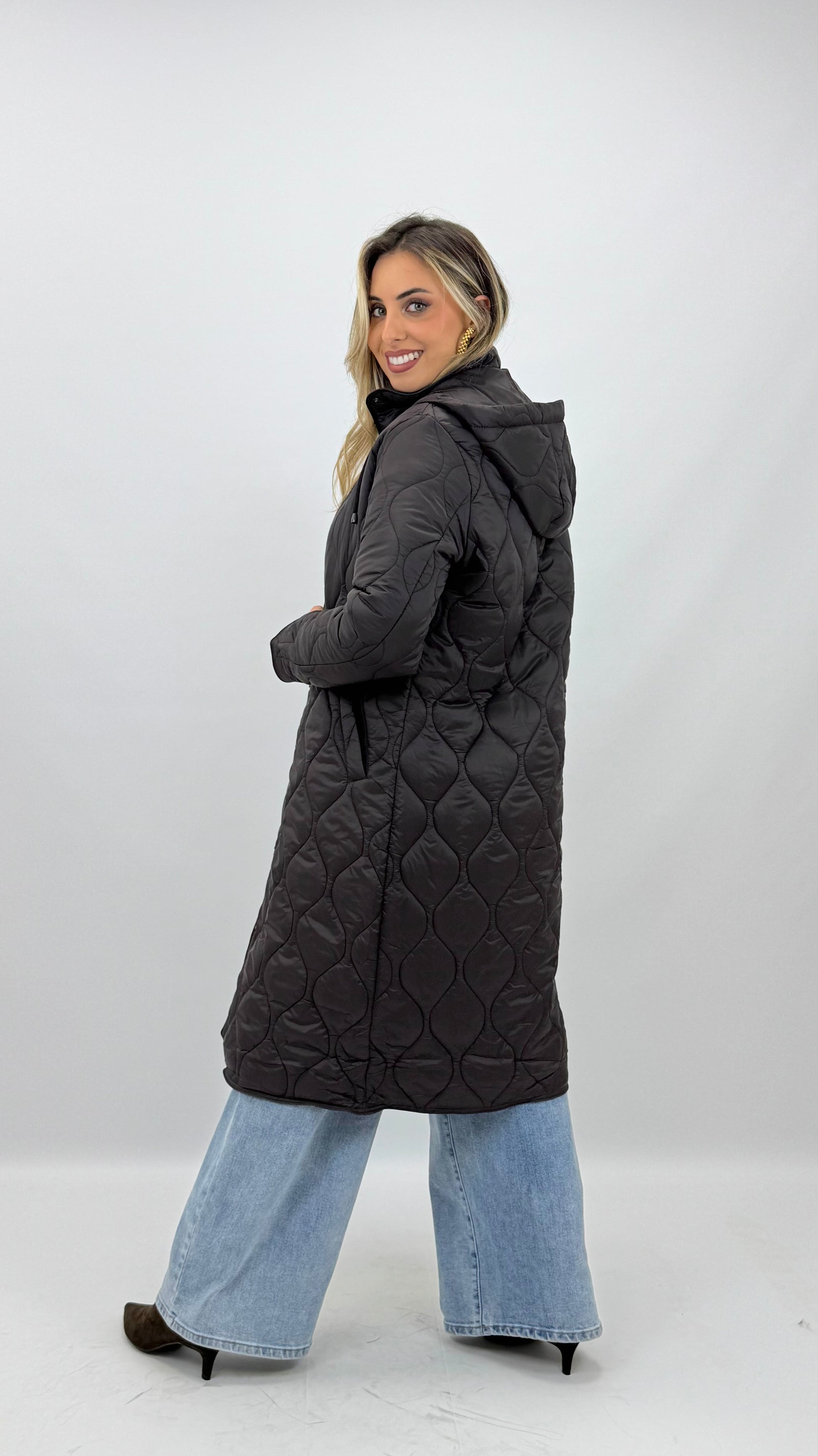 Parka acolchoada fina, leve e confortável. Aperta com molas de pressão na parte da frente. Bolsos nas laterais. Contém capuz amovível.