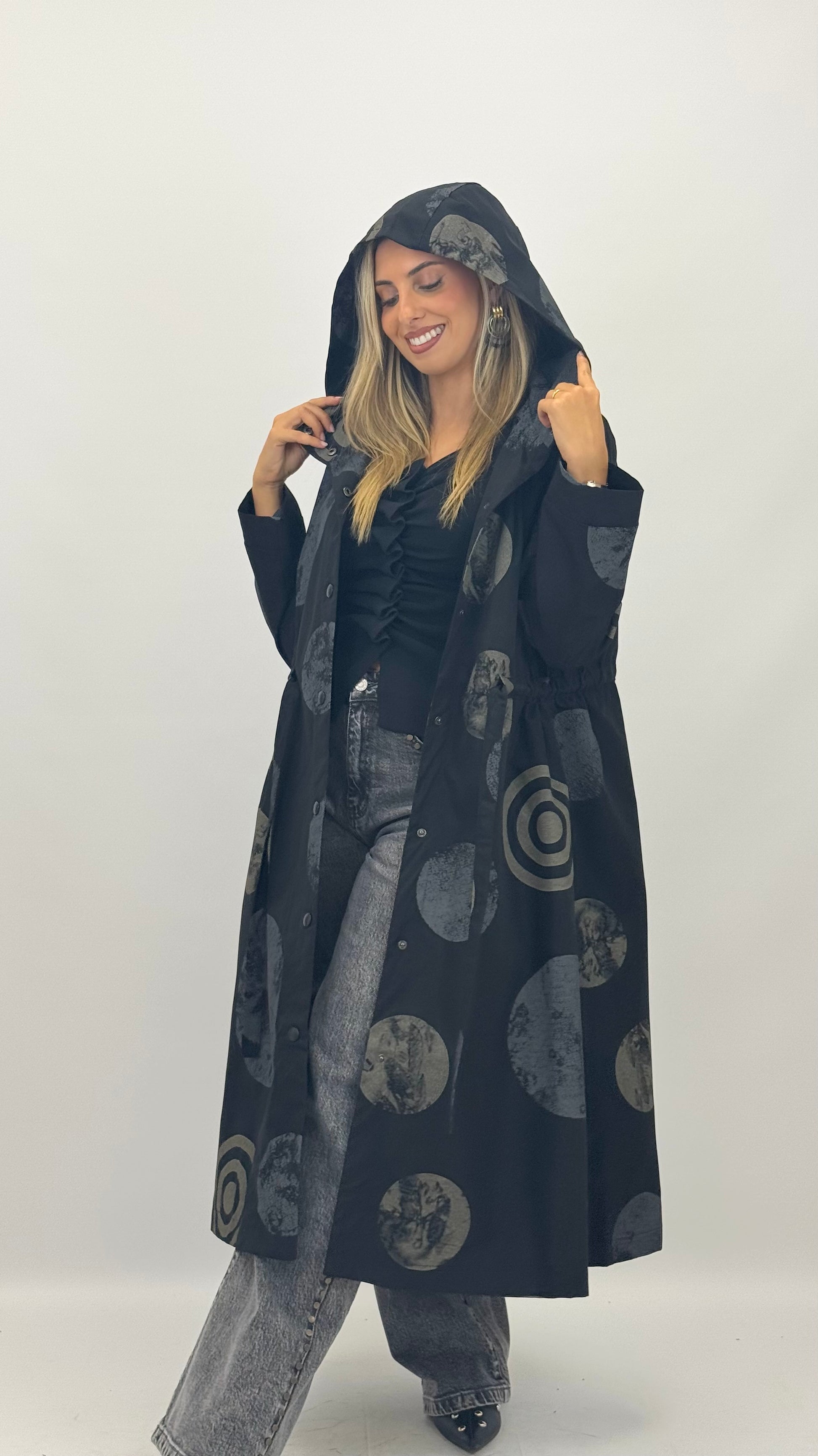 Parka comprida em tecido fundo preto com bolas em tom cinza e taupe. Aperta com molas de pressão na parte da frente. Atilho ajustável na cintura. Bolsos nas laterais. Modelo forrado.