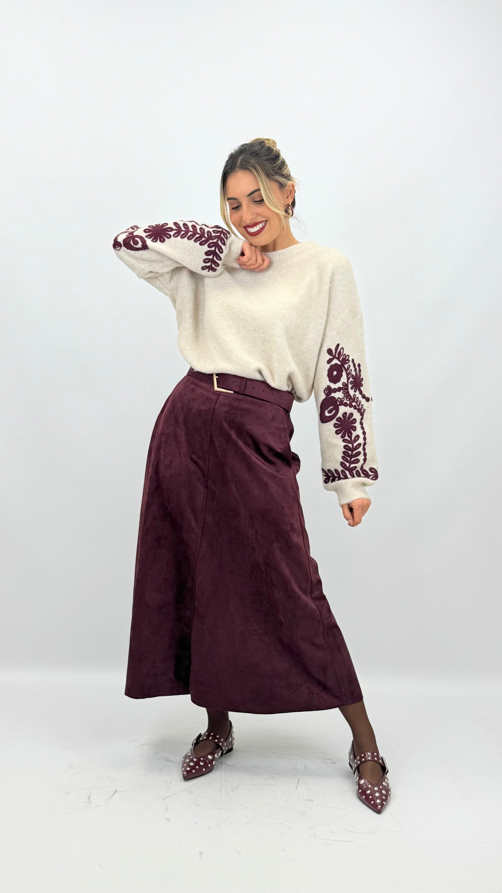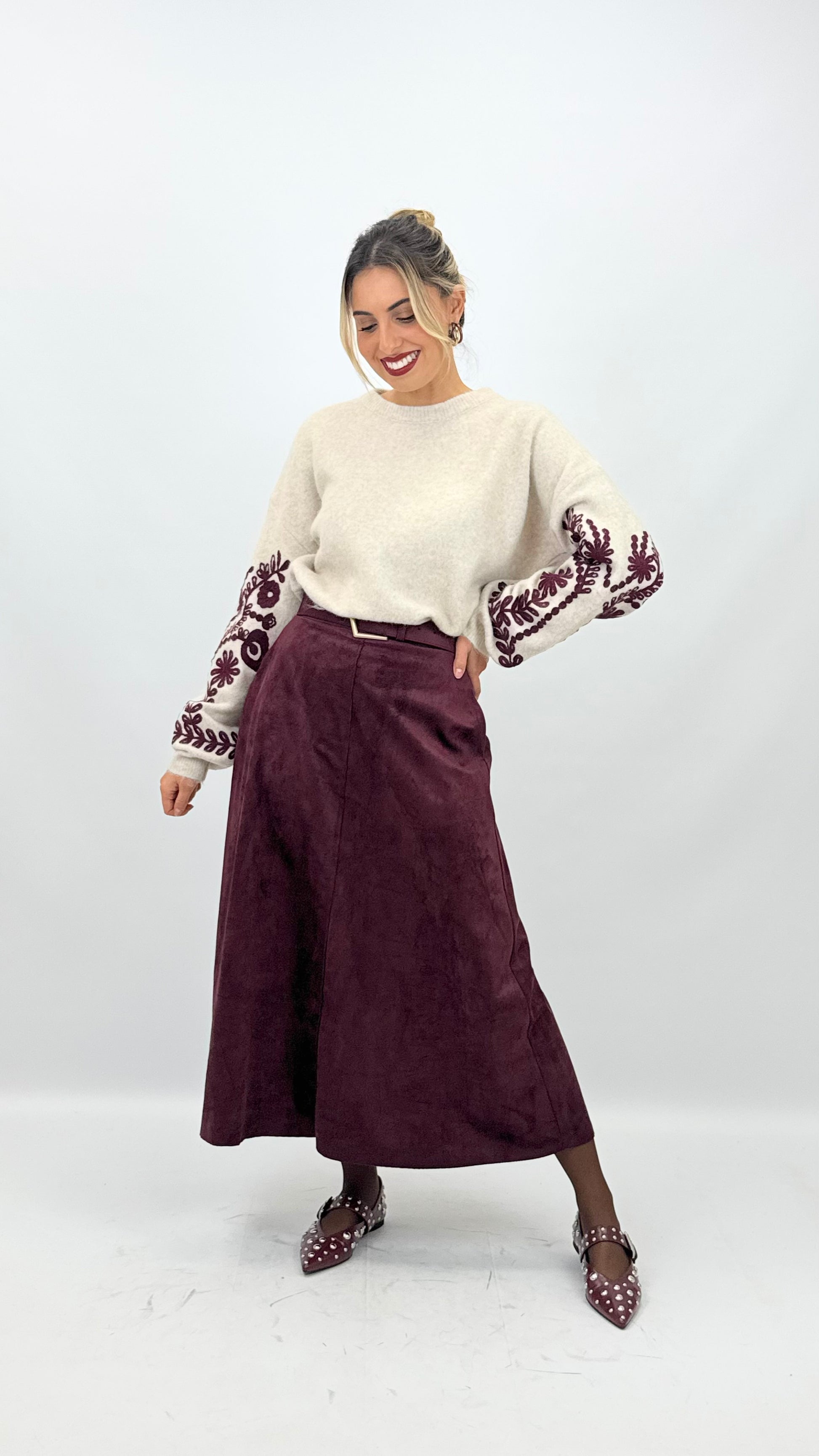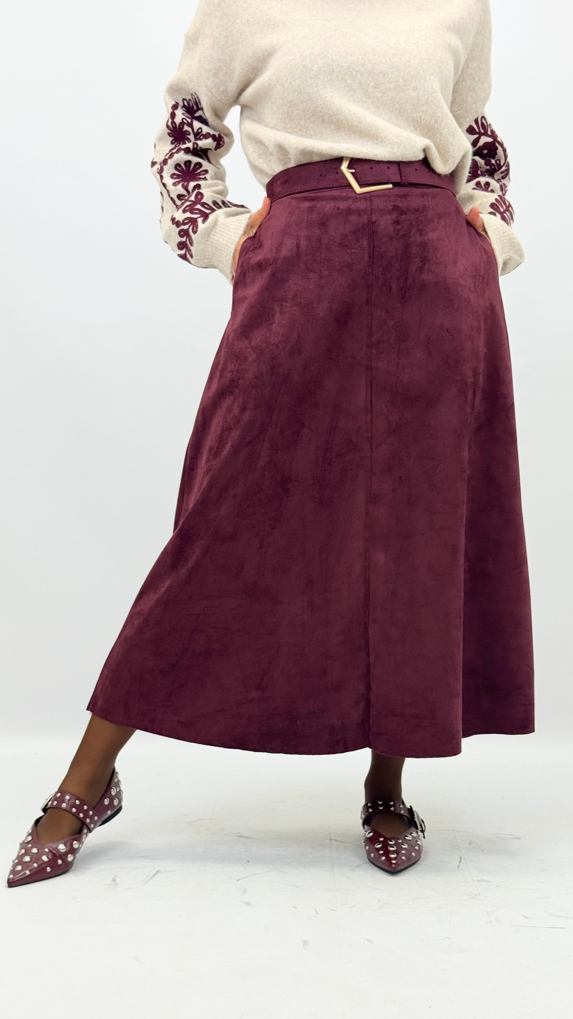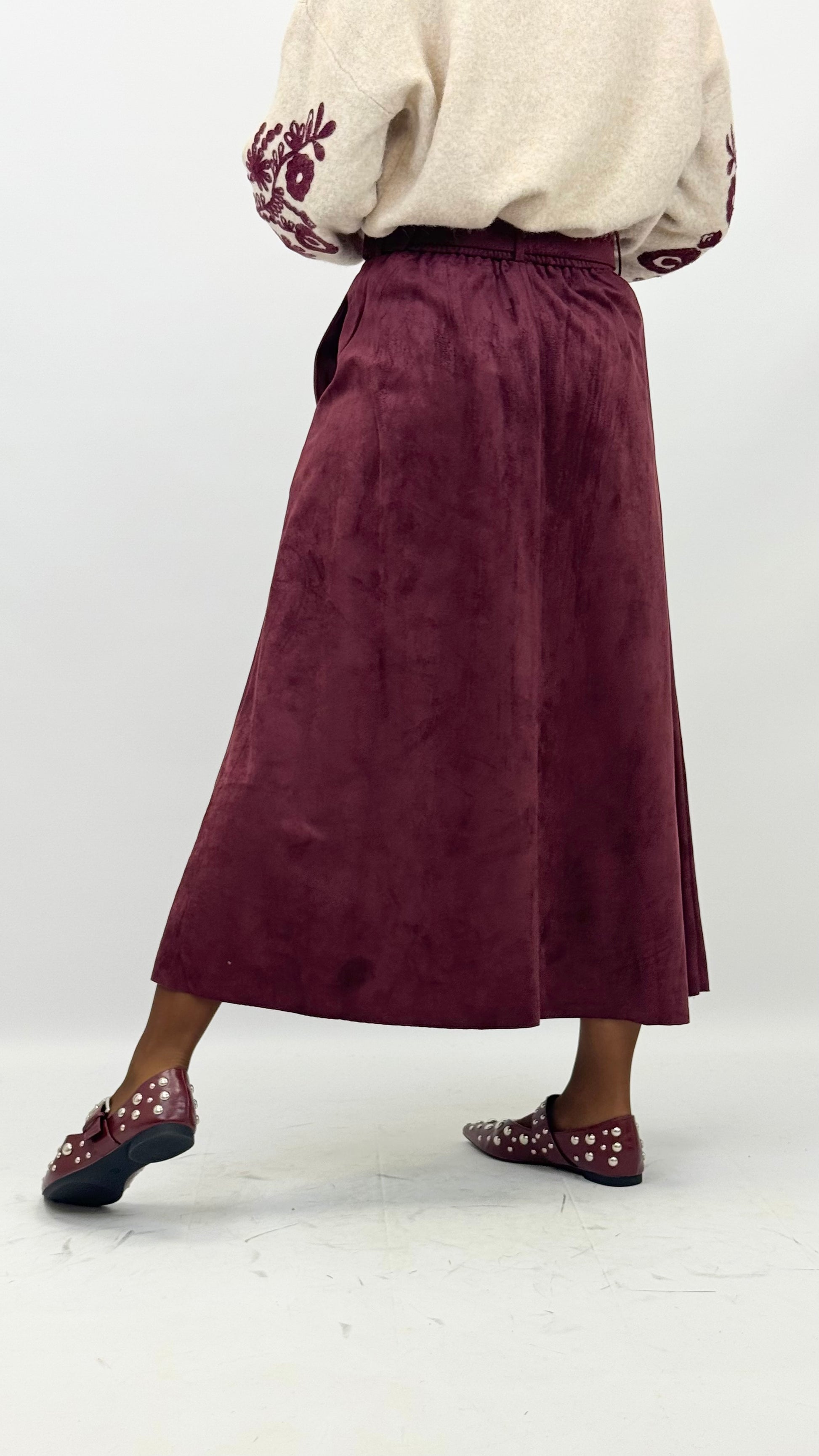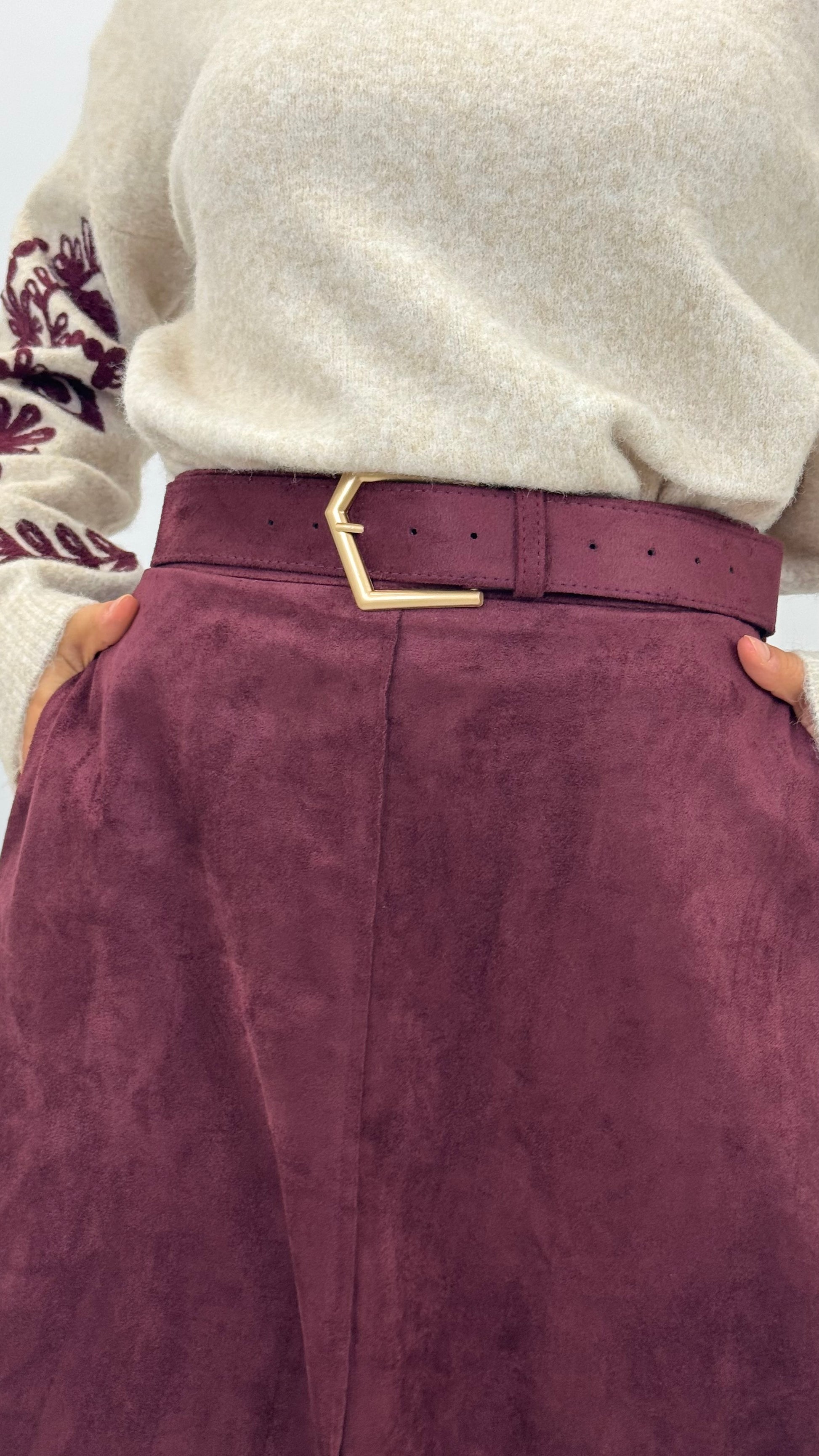 Saia midi em tecido estilo camurça bordeaux. Aperta com fecho na lateral. Elástico na parte de trás da cintura. Bolsos nas laterais. Contém cinto em tela forrado ao próprio tecido com fivela dourada.
