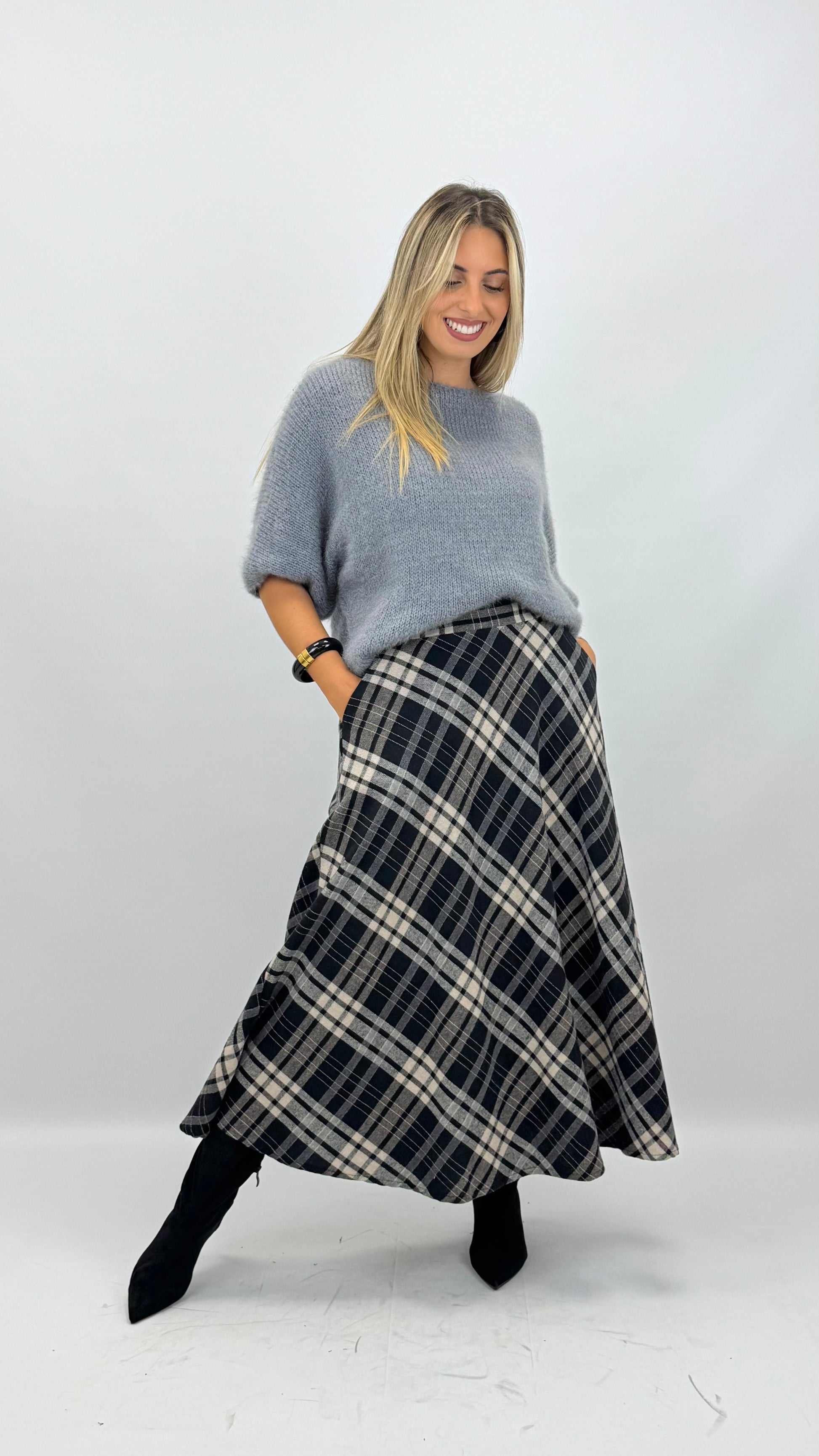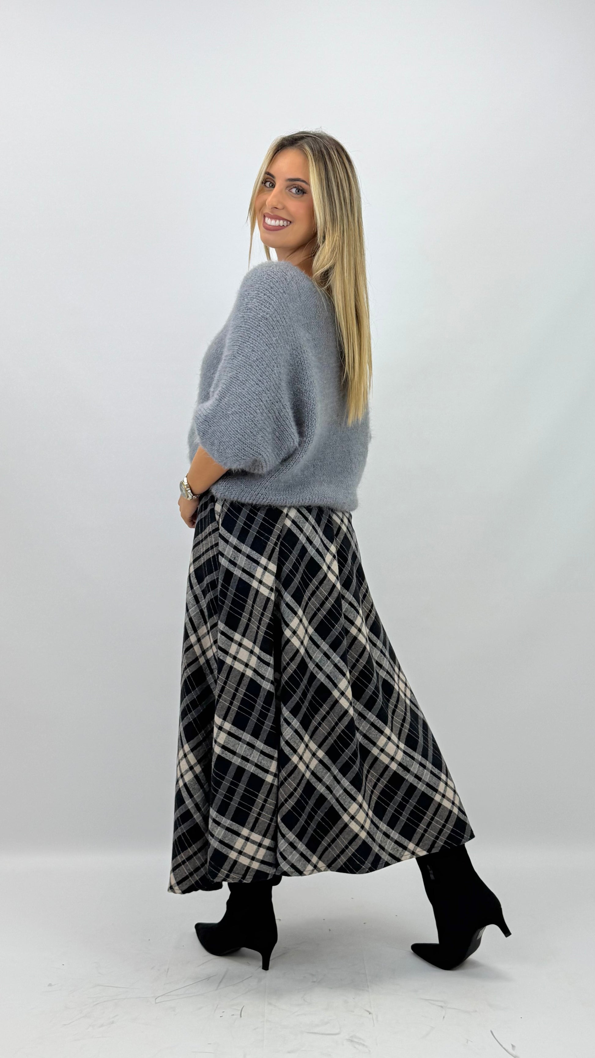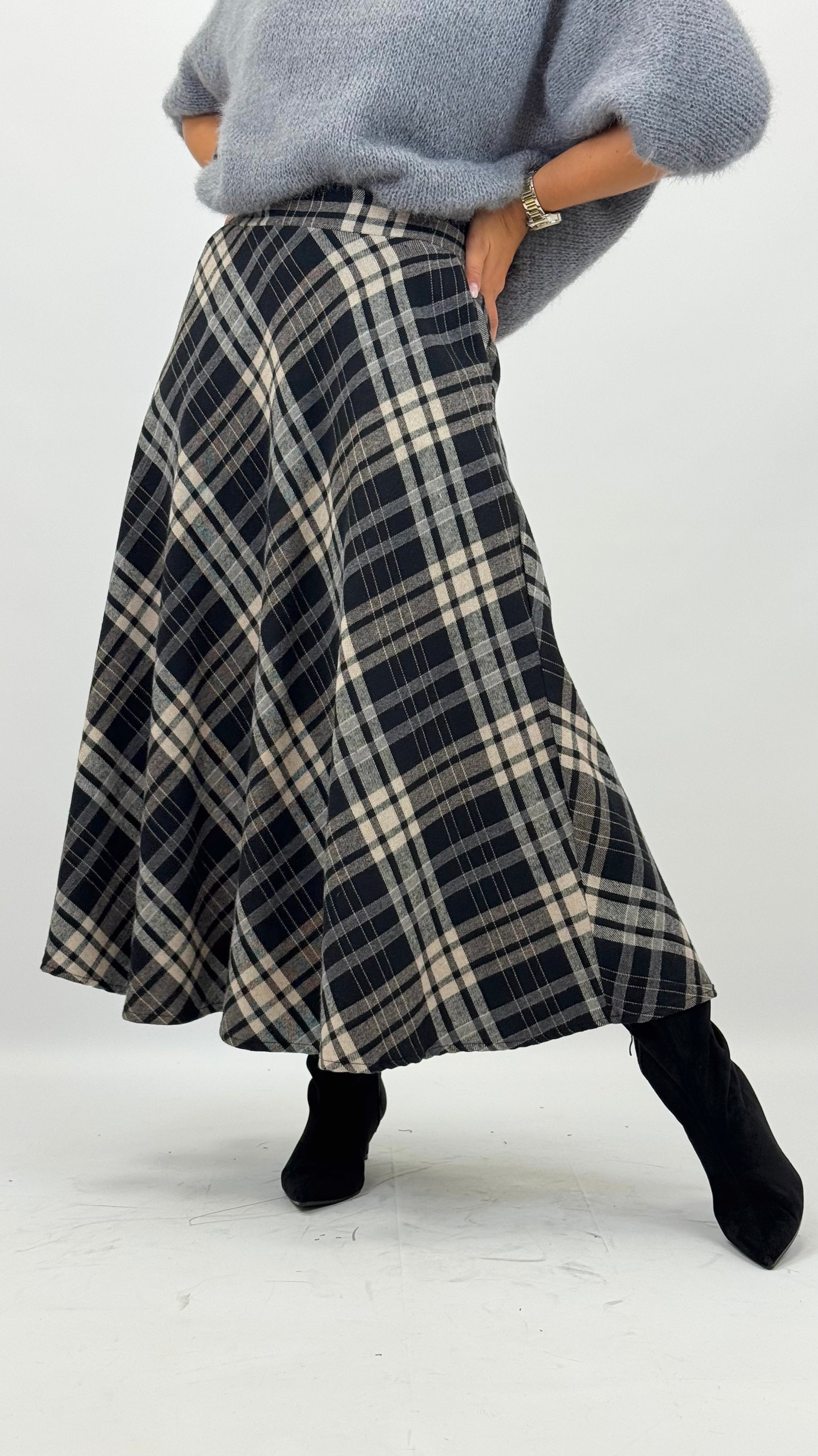 Saia midi aos godés, tecido macio, quente e confortável fundo preto ao xadrez tons cinza e pérola. Elástico na parte de trás da cintura e bolsos nas laterais.